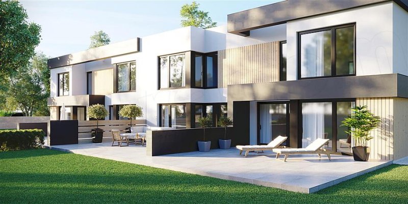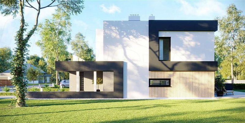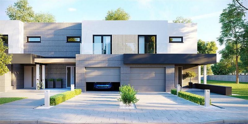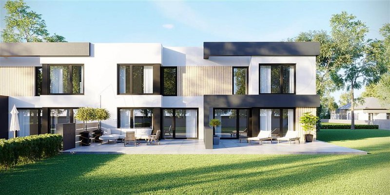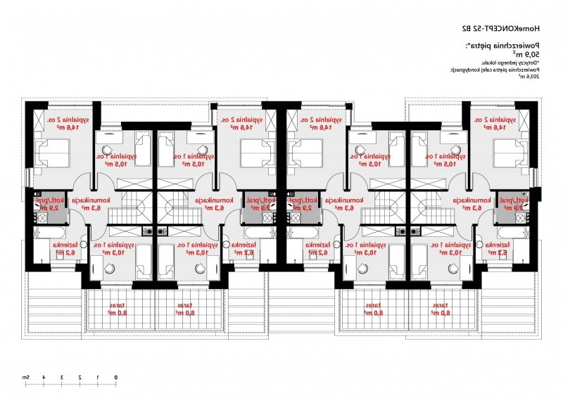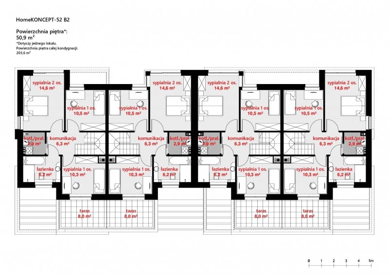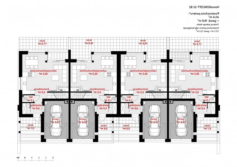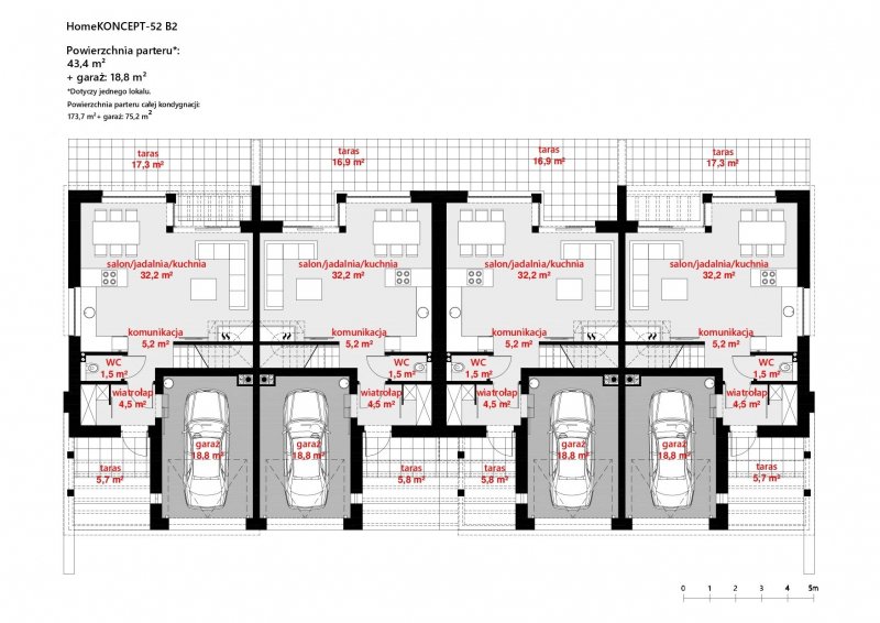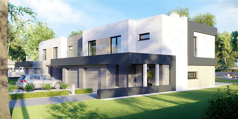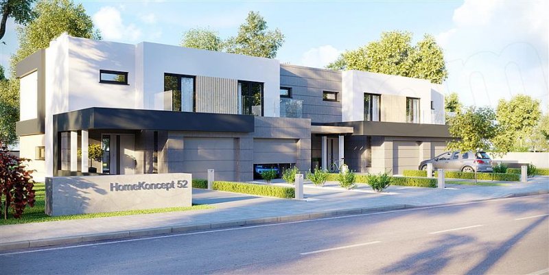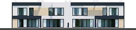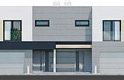 HomeKoncept 52 B2 to projekt nowoczesnego domu 4 lokalowego, przeznaczonego do zabudowy bliźniaczej. Jest to bardzo ciekawa propozycja dla deweloperów, realizujących osiedla mieszkaniowe. Atutem naszego projektu jest bardzo funkcjonalny układ pomieszczeń oraz interesująca i kompaktowa bryła. Budynek zaprojektowano z płaskim dachem, dzięki czemu wnętrza na piętrze są pozbawione skosów, co czyni je niezwykle ustawnymi. Modne wykończenie elewacji, bazujące na tynku w stonowanych barwach oraz dodatków z naturalnego drewna, zostało ozdobione interesującym belkowaniem. Wnętrza wszystkich segmentów mieszkalnych mają taki sam układ pomieszczeń. Bardzo komfortowo może tam mieszkać 4-osobowa rodzina. W części dziennej, do dyspozycji mieszkańców jest salon z miejscem na narożną sofę, jadalnia z widokiem na taras i ogród oraz kuchnia z wygodnymi blatami kuchennymi. Układ funkcjonalny parteru uzupełnia toaleta oraz niewielka garderoba przy wiatrołapie. Na piętrze, w części nocnej, zaprojektowano sypialnię małżeńską oraz 2 pokoje dla dzieci. Znajduje się tutaj również rodzinna łazienka z kabiną prysznicową i wanną oraz kotłownia z funkcją pralni. Taras zlokalizowany nad garażem to dodatkowa strefa wypoczynkowa dla domowników. Dom został standardowo wyposażony w instalację solarną do przygotowywania ciepłej wody użytkowej oraz wentylację mechaniczną z odzyskiem ciepła.