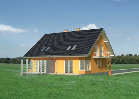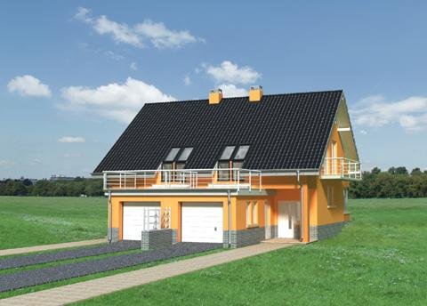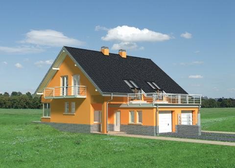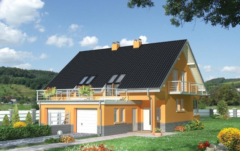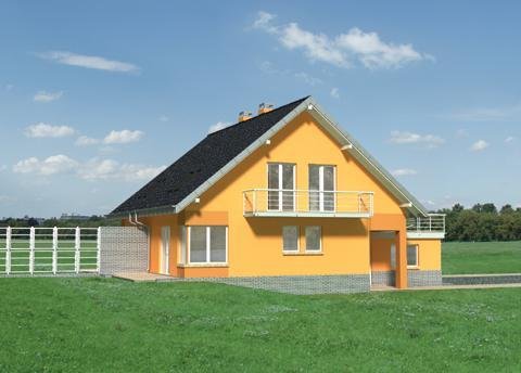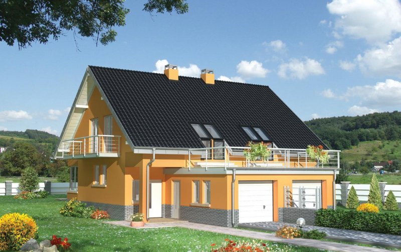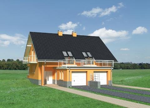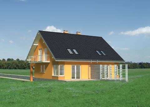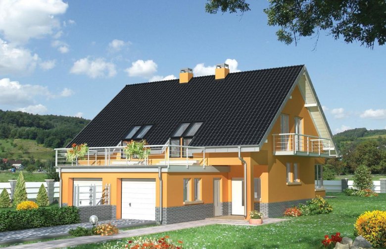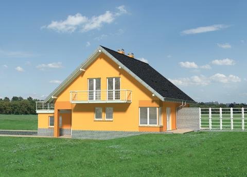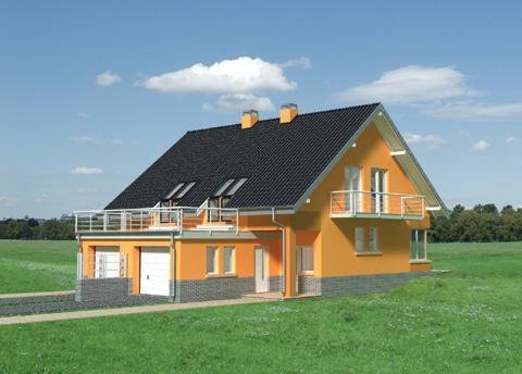 Na parterze zlokalizowano: sień wejściową, hol, pokój dzienny, kuchnię, łazienkę oraz garaż dostępny z zewnątrz. Na poddaszu znajdują się trzy sypialnie oraz łazienka. Bryłę budynku tworzy prostopadłościan, nakryty dwuspadowym dachem o kącie nachylenia połaci 39 stopni , do którego dostawiono garaż nakryty tarasem.