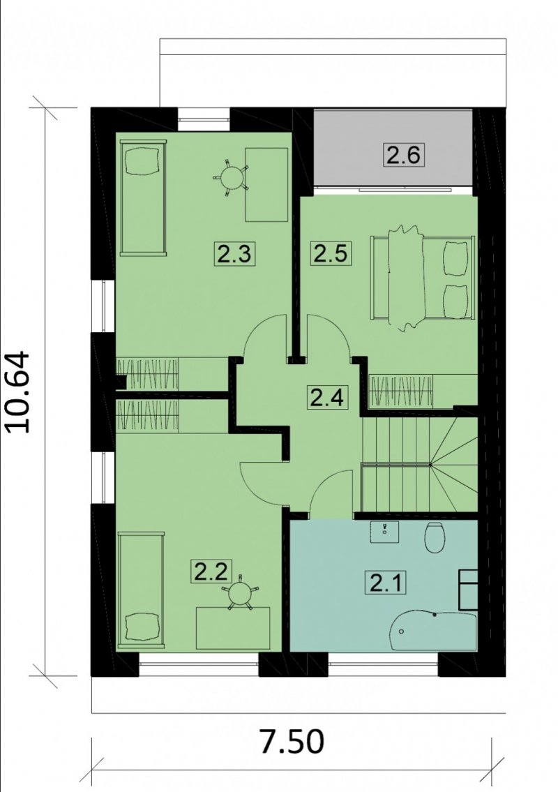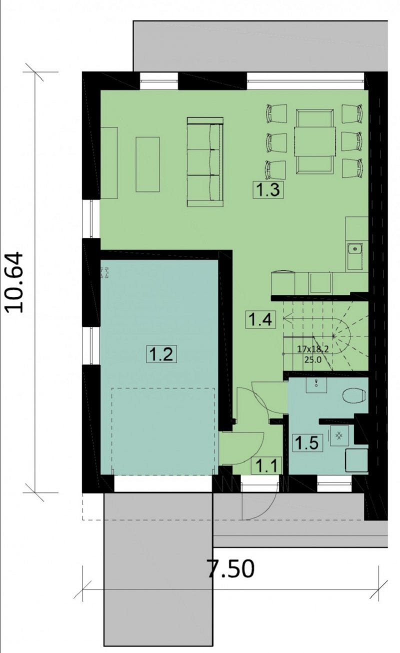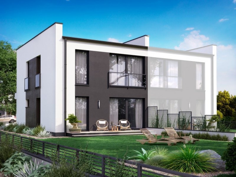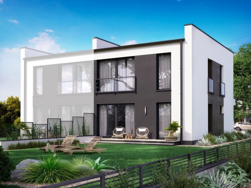 Uniwersalny kształt budynku daje możliwośc bliźniaczenia z obu stron, możliwość budowy w zabudowie szeregowej, budynek może występować jako dwulokalowy.