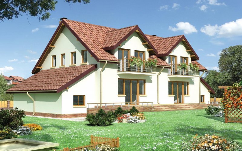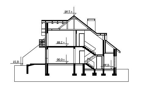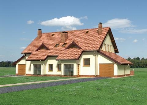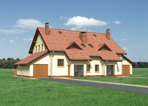Na parterze zaprojektowano hol, pokój dzienny, kuchnię z jadalnią, w.c. oraz kotłownię i garaż. Na poddaszu znajdują się 3 pokoje, przedpokój i łazienka. Do zasadniczej bryły budynku przykrytej dachem dwuspadowym o kącie nachylenia połaci 38° dostawiono garaż przykryty dachem pulpitowym o kącie nachylenia 29°. Wejście zaakcentowane jest ścianą z pustaków szklanych, zaś elewację ogrodową wzbogaca obszerna lukarna z balkonem.