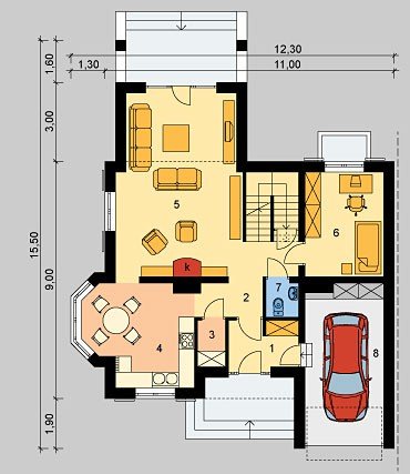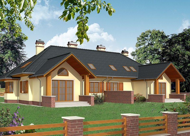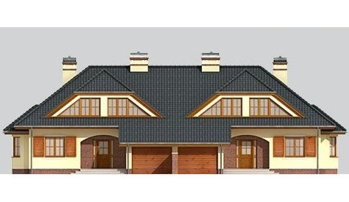 Dom jednorodzinny w zabudowie bliźniaczej, parterowy z poddaszem użytkowym i jednostanowiskowym garażem.