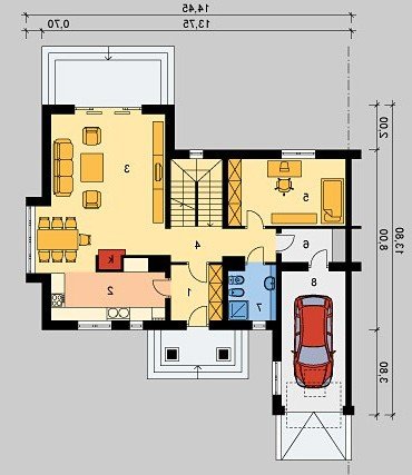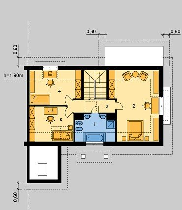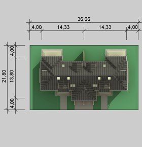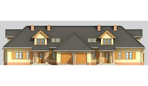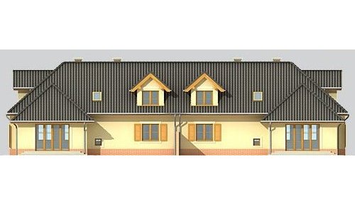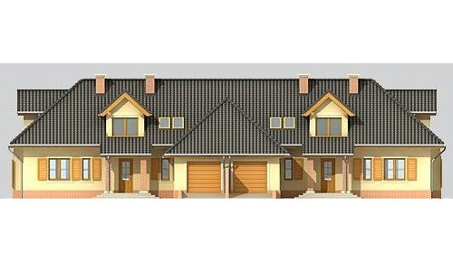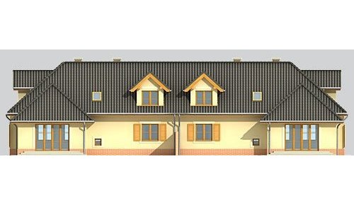 Dom jednorodzinny, w zabudowie bliźniaczej, parterowy z poddaszem użytkowym z jednostanowiskowym garażem, częściowo podpiwniczony.