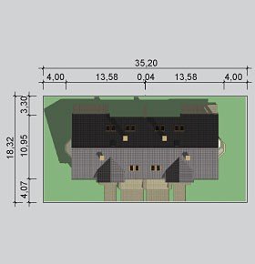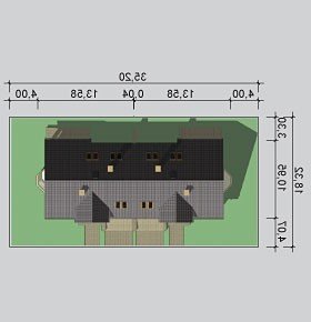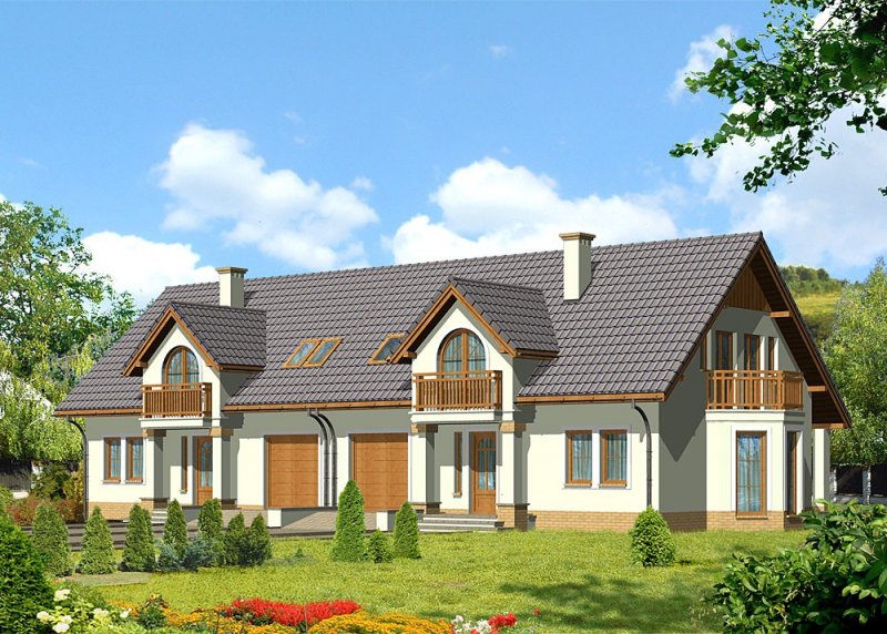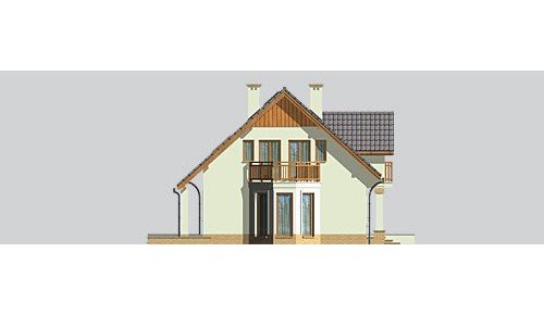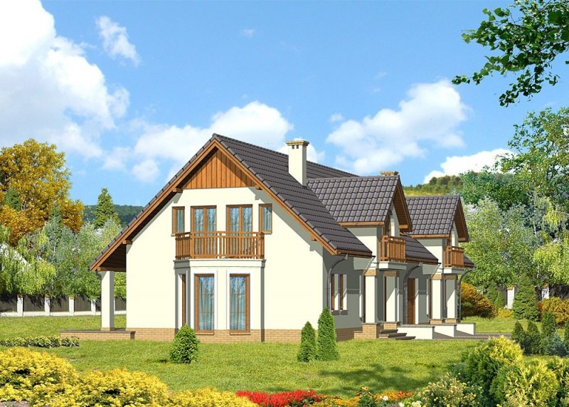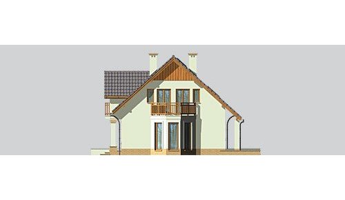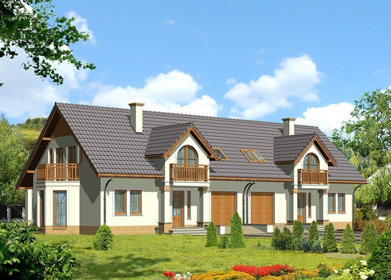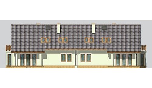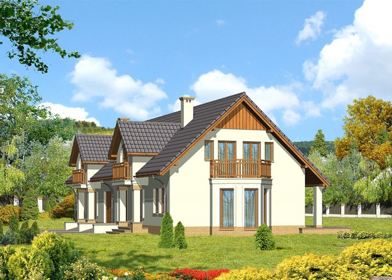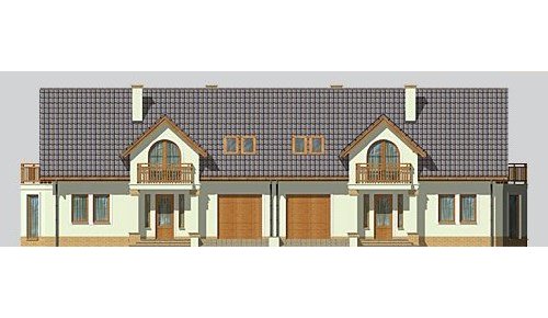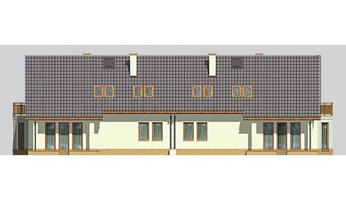 Dom jednorodzinny, parterowy, z poddaszem użytkowym oraz jednostanowiskowym garażem w zabudowie bliźniaczej.