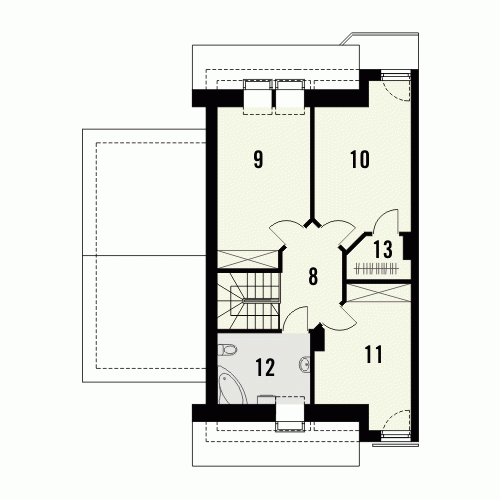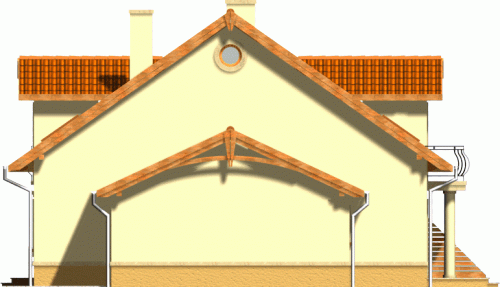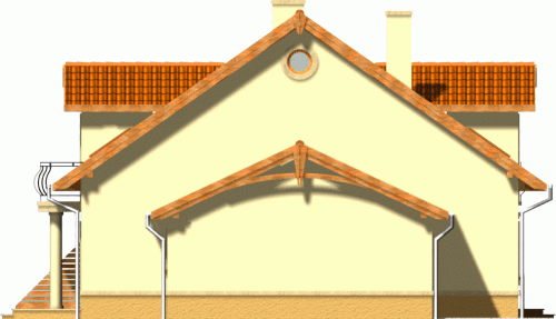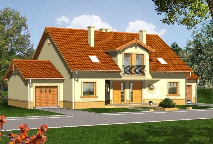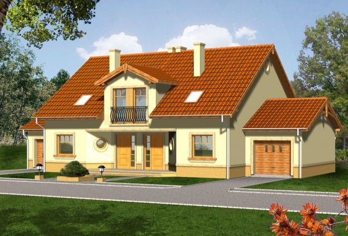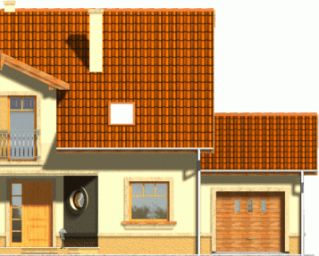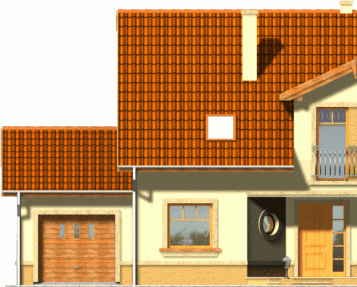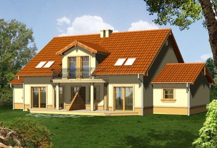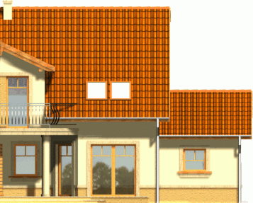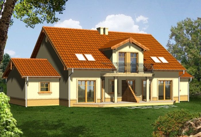 Dom wyróżnia się atrakcyjnie zaaranżowanym wejściem z podcienia w fasadzie frontowej i ocienionym balkonem wyjściem na taras od strony ogrodu.
