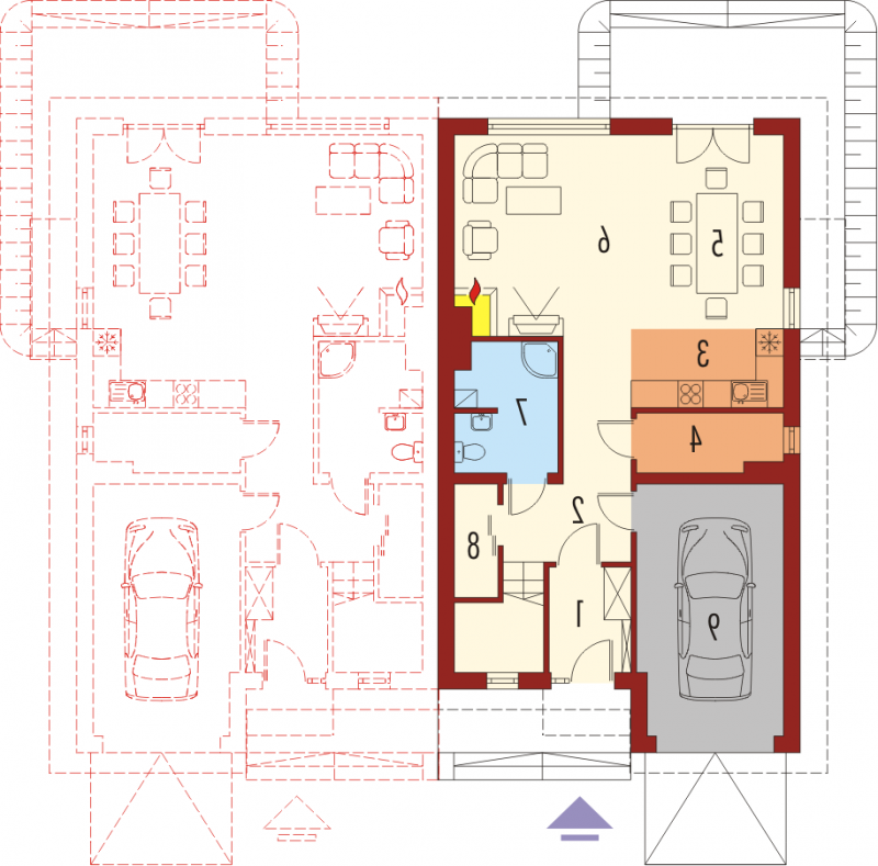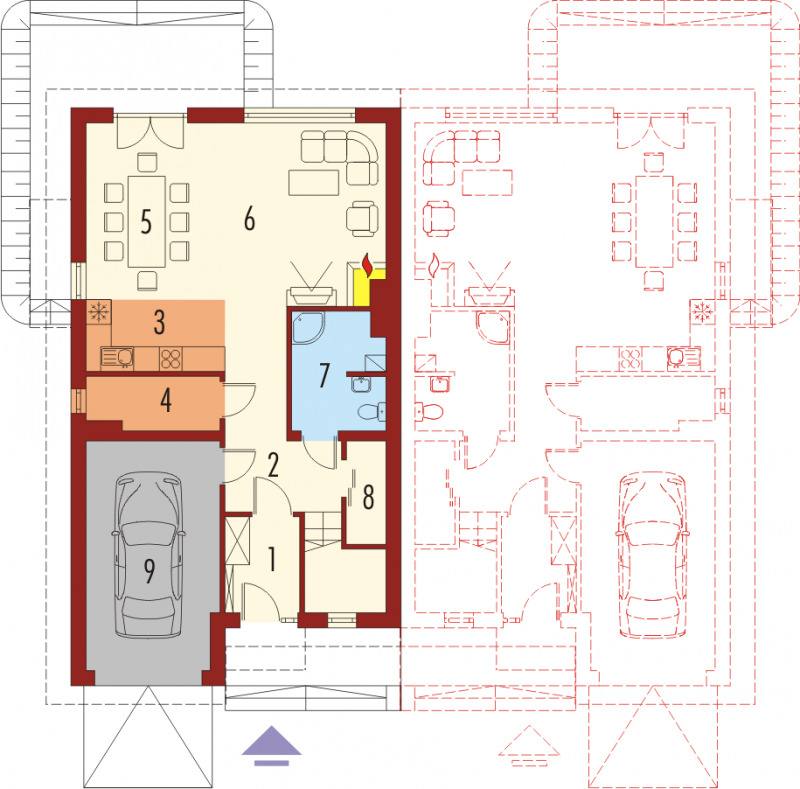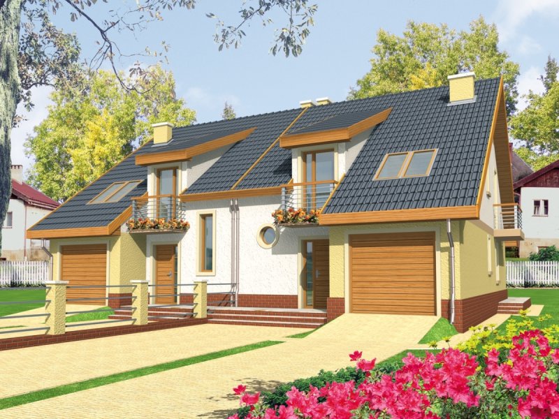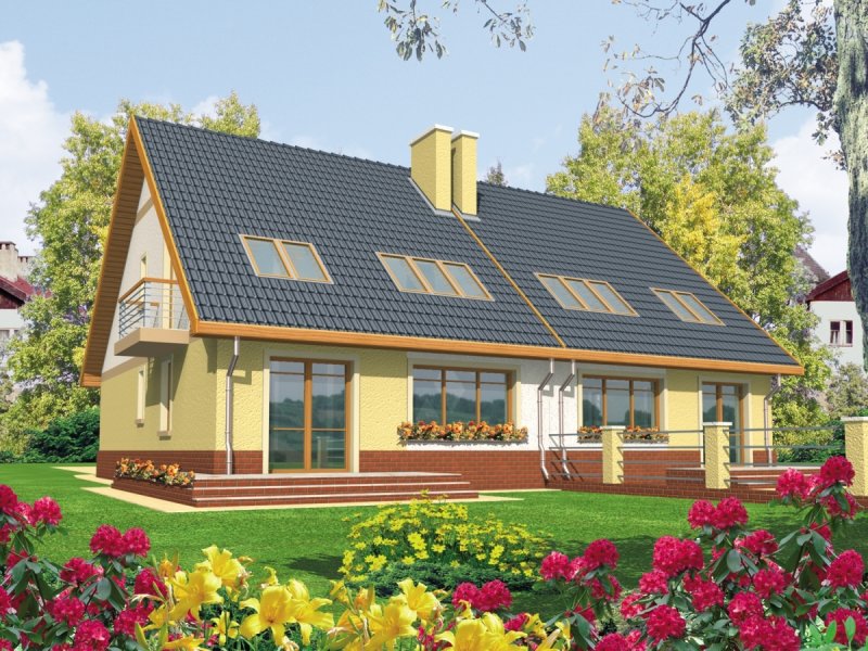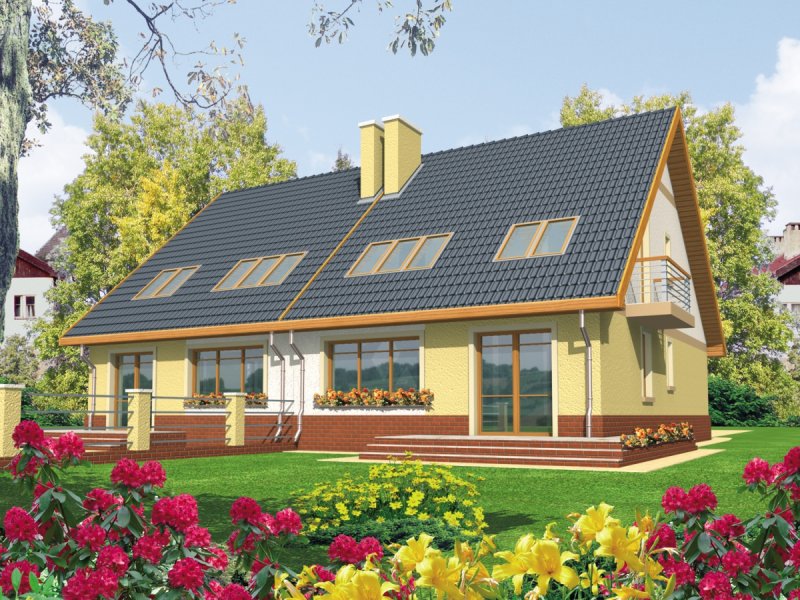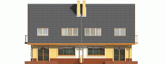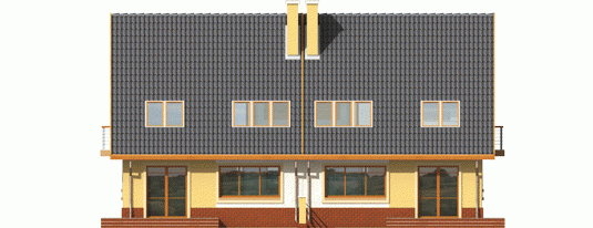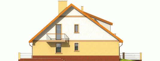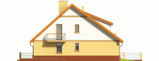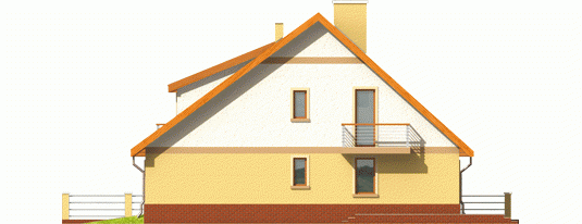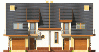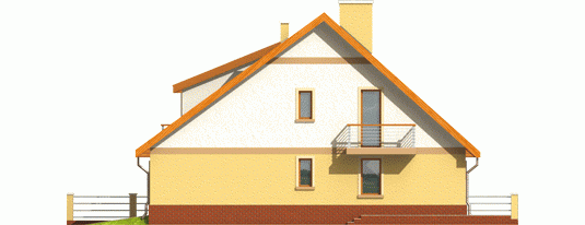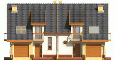 Dom parterowy z poddaszem użytkowym przeznaczony dla 4-osobowej rodziny, niepodpiwniczony, z wbudowanym garażem. Projekt może być zrealizowany jako bliźniak lub dom wolnostojący na wąską działkę. Cechuje go prosty układ i zwarta bryła - główną część domu zaprojektowano na planie prostokąta z lekko wysuniętym garażem. Nieskomplikowana konstrukcja domu i przekrycie go dwuspadowym dachem sprawia że jest łatwy w realizacji. Część dzienna na parterze składa się z wiatrołapu hallu wygodnego salonu z kominkiem narożnym łazienki kotłowni oraz kuchni ze spiżarnią. Część nocną na poddaszu tworzą trzy duże sypialnie hall i przestronna łazienka. Sypialnie są doświetlone za pomocą okien połaciowych a dwie z nich posiadają dodatkowo własne balkony.