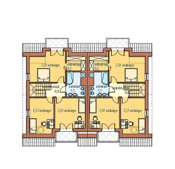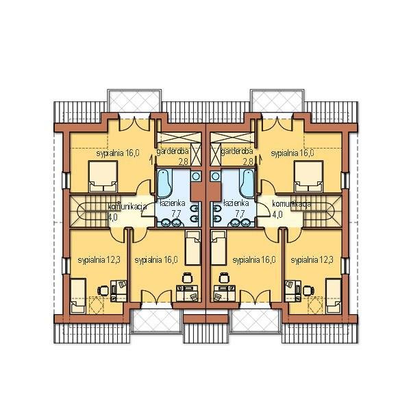 Część nocną na poddaszu tworzą: trzy duże sypialnie, hall i wygodna łazienka. Dwie sypialnie mają balkony i będą doświetlone oknami balkonowymi , trzecia sypialnia posiada okno w ścianie szczytowej i dodatkowo będzie doświetlona za pomocą okna połaciowego. Sypialnia rodziców posiada własną garderobę.