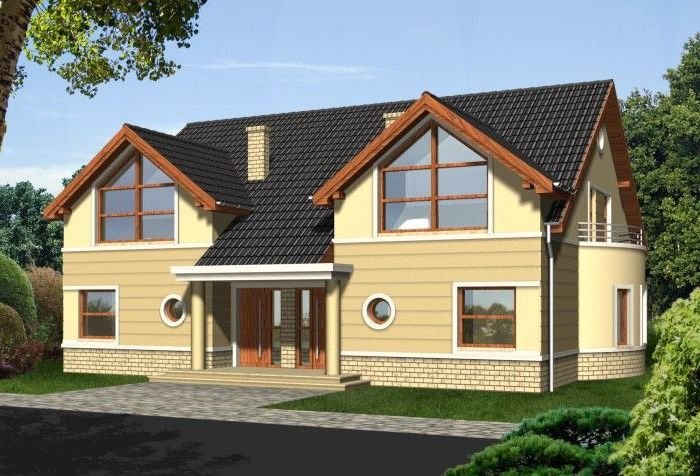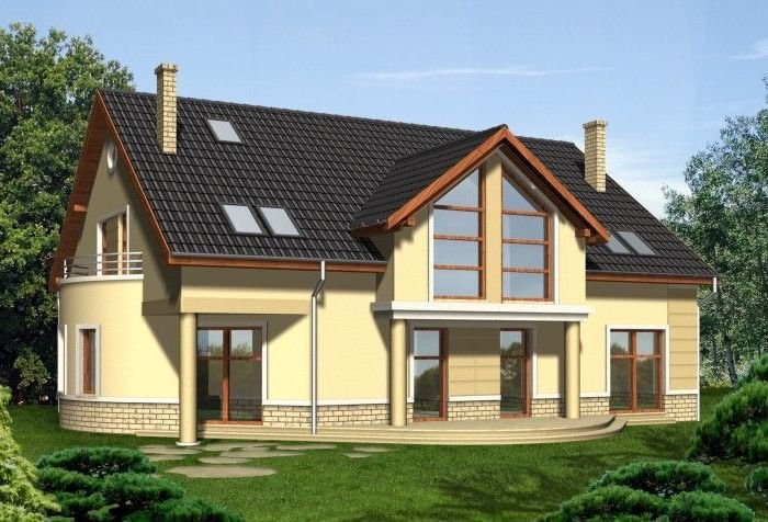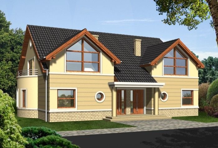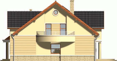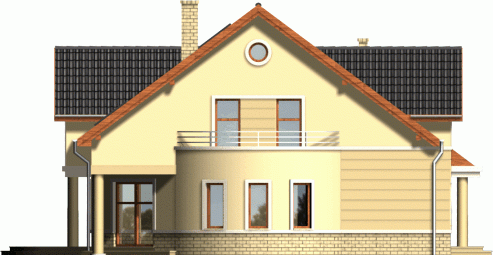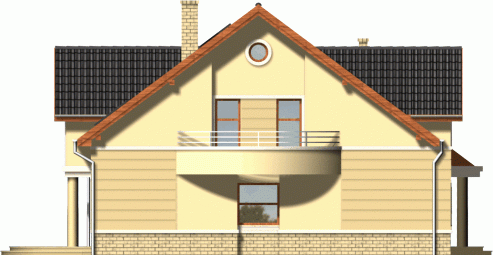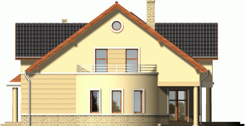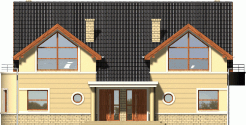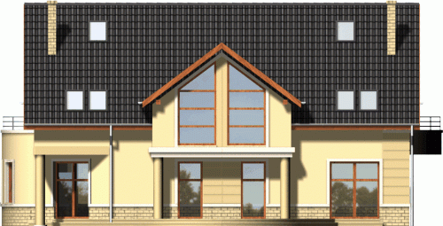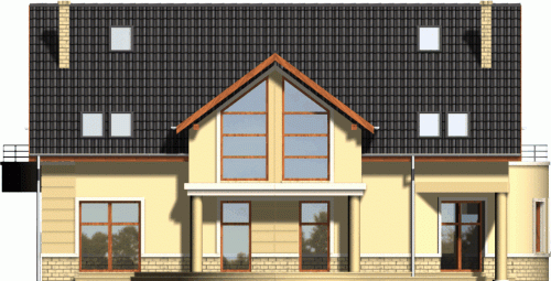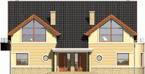 Klasyczny dom z dachem dwuspadowym. Front budynku przykuwa uwagę reprezentacyjnym wejściem i atrakcyjnym przeszkleniem salonu na poddaszu. Od strony ogrodu do budynku przylega częściowo zadaszony taras dostępny z mieszkań na parterze.