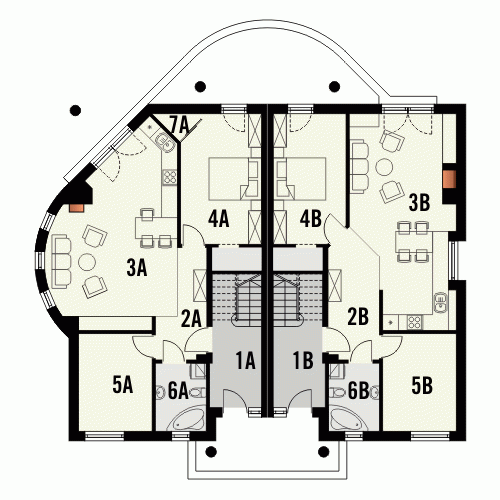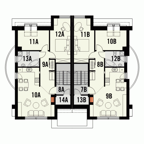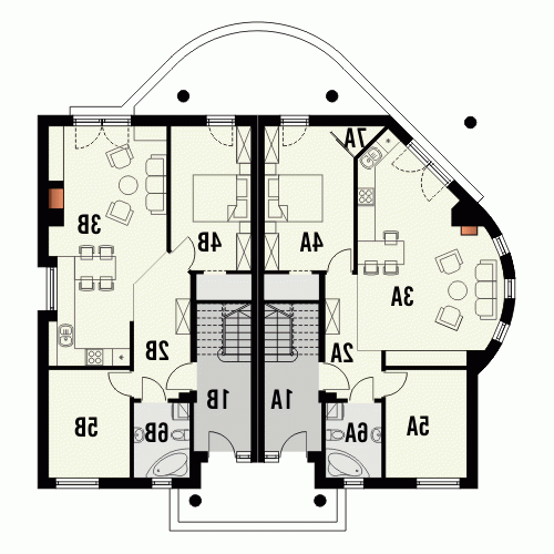 Budynek niepodpiwniczony piętrowy dwumieszkaniowy w zabudowie bliźniaczej dostępny w dwóch wersjach A i B. Na parterze zaprojektowano mieszkania o powierzchni: wersja A - 75.4m2; wersja B - 74.2m2. Na poddaszu znajdują się mieszkania o powierzchni: wersja A - 70.5 + 12.3m2 strychu; wersja B - 69.4 + 11.8 strychu. Strychy możliwe do adaptacji na dodatkowe pokoje. Dokumentacja dostępna również w odbiciu lustrzanym.