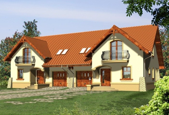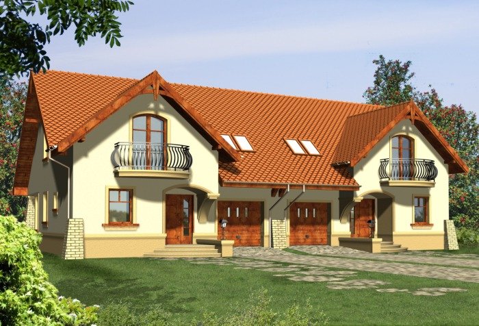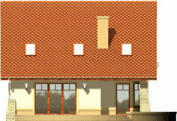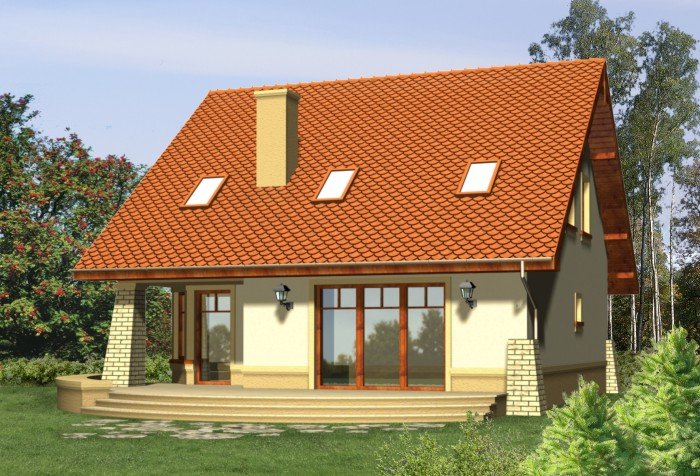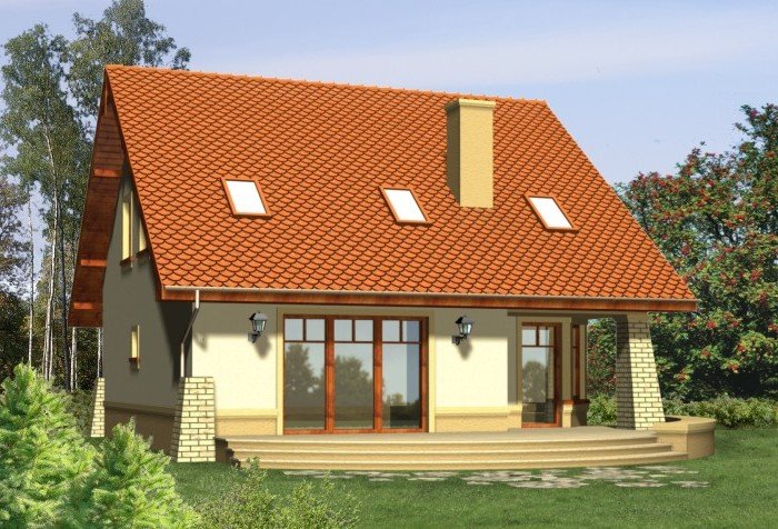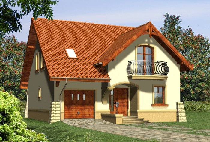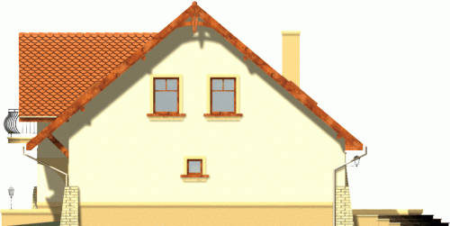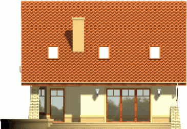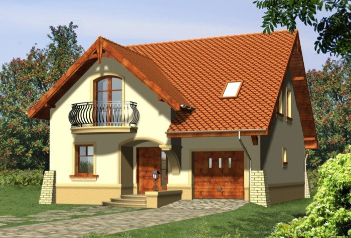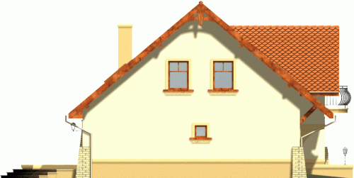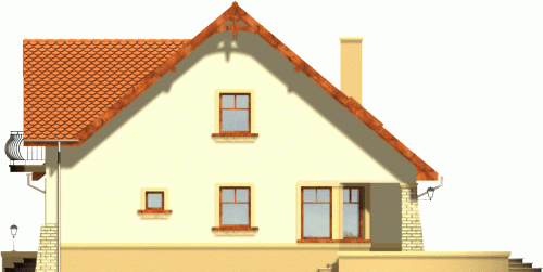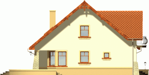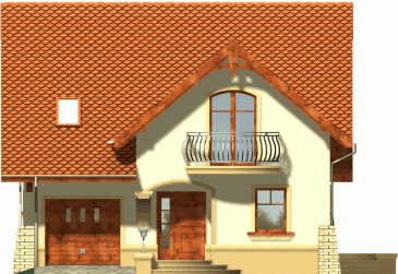 Klasyczny dom z dachem dwuspadowym z garażem w bryle budynku. Wejście podkreślone podcieniem opartym na wsporniku, stanowiącym część szczytu ozdobionego balkonem na poddaszu. Od strony ogrodowej do budynku przylega taras, którego fragment jest osłonięty podcieniem.