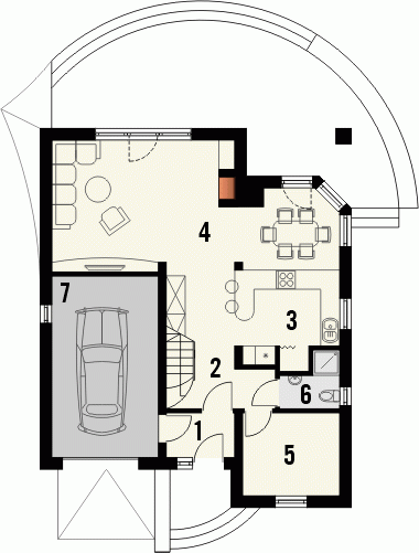 Budynek niepodpiwniczony piętrowy z garażem. Na parterze znalazła się przestronna strefa dzienna: salon z wydzieloną jadalnią i kuchnia ze spiżarką. Do dodatkowego pokoju przylega łazienka, a z wiatrołapu przewidziano przejście do garażu. Na poddaszu znajdują się trzy pokoje, w tym jeden z osobną garderobą. Z łazienki przechodzi się do wydzielonego pomieszczenia gospodarczego.