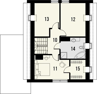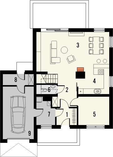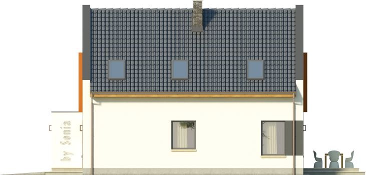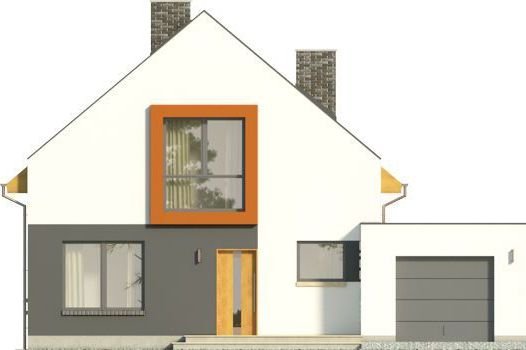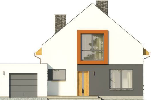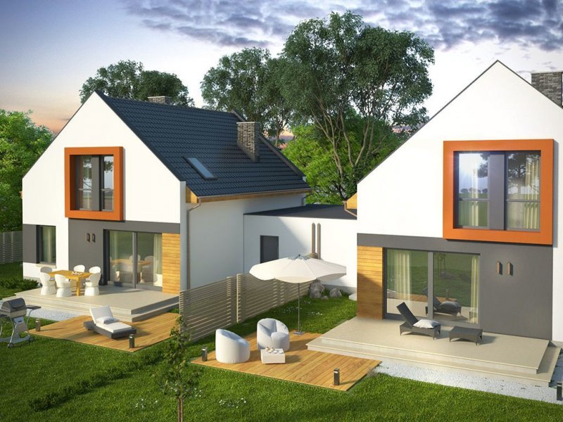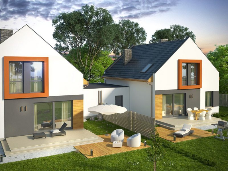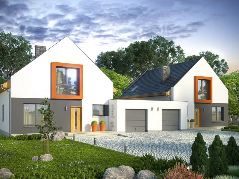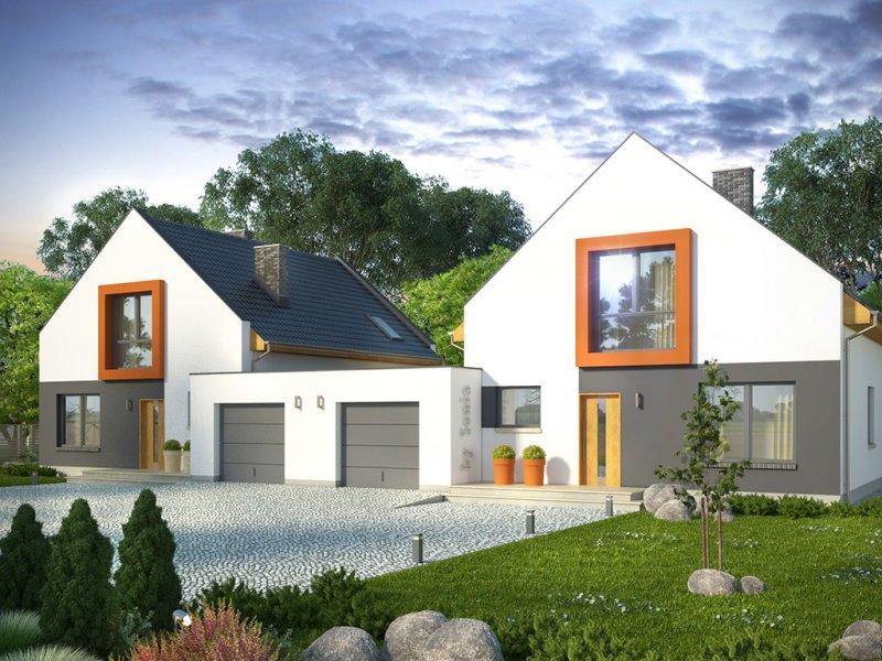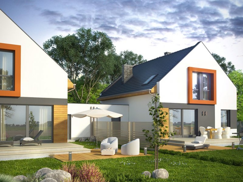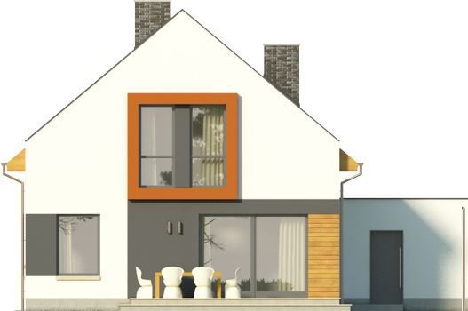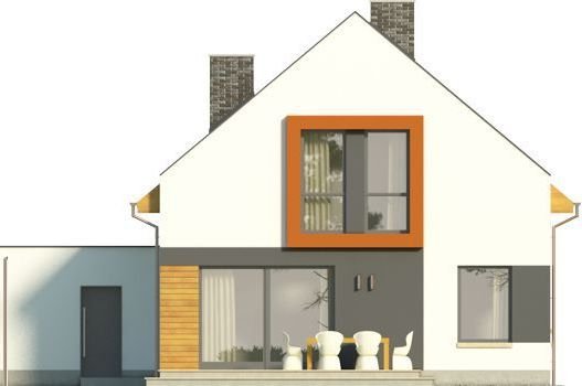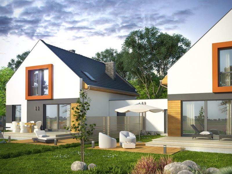 PIONIER 3 to nowoczesny projekt domu jednorodzinnego w zbliźniaczeniu, Segmenty stykają się wyłącznie garażem i pomieszczeniem gospodarczym na jego tyłach – zapewni to komfort akustyczny. Parter to przede wszystkim strefa dzienna, czyli duży salon z jadalnią, połączony z otwartą kuchnią. Przewidziano również kotłownię, dodatkowy pokój i wc. Na poddaszu zaprojektowano 3 sypialnie, jedna z nich posiada wydzieloną garderobę. Uwzględniono również łazienkę.O nowoczesnym stylu budynku decyduje prostota bryły oraz podwyższenie ścian szczytowych ponad kalenicę. Dodatkowo, okna na piętrze ozdobione są dość szeroką, rdzawoczerwoną ramą. Ten mocny akcent kolorystyczny ładnie komponuje się z białym i szarym tynkiem, uroku dodaje budynkowi również akcent w drewnie, który zdobi elewację od strony ogrodu.Materiały, z których wykonano budynek, to gazobeton + styropian (ściany), tynk + okładzina z drewna (wykończenie ścian), strop TERIVA , drewno (więźba), dachówka ceramiczna (pokrycie dachu). Na etapie adaptacji dostępne są inne materiały.