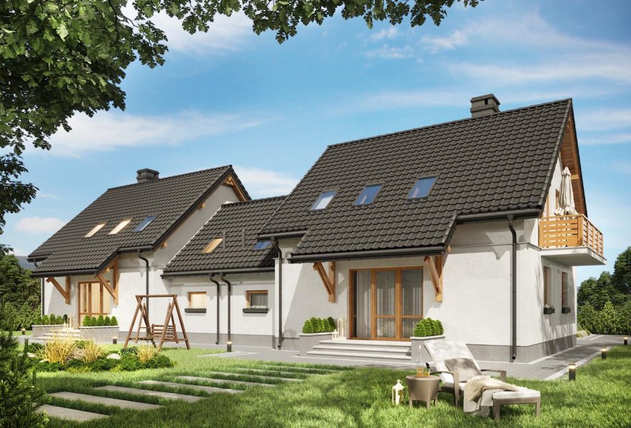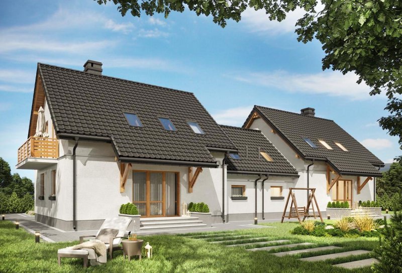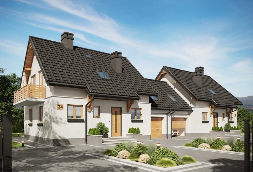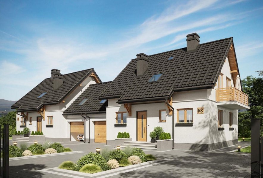 W rodzinie Smyka znalazło się kilka projektów najmniejszych i najprostszych domów parterowych z użytkowym poddaszem. Projekt domu Smyk 2 Duo jest rozwiązaniem średniej wielkości, z dostawionym garażem i kalenicą dwuspadowego dachu równoległą do drogi dojazdowej. Zbliżony do kwadratu, zwarty rzut dzieli symetrycznie ściana nośna, wyznaczająca po jednej stronie strefę wejścia i komunikacji z kuchnią, wc i kotłownią oraz szeroki salon od ogrodu. Na poddaszu są trzy pokoje i łazienka z pralnią. Do jednej ze ścian bocznych dostawiono garaż przekryty dwuspadowym dachem, drugą urozmaica długi balkon otwierany z dwóch sypialni. Najbardziej zbliżony do projektu domu Smyk 2 Duo jest w rodzinie podobny rozmiarem i identyczny funkcjonalnie Smyk 2, który nie przewiduje jednak zabudowy w granicy działki ścianą garażową. Oba warianty mają, tak jak Smyk i Smyk As, obniżony częściowo okap nad tarasem wejściowym i ogrodowym. Podobny rozkład ale mniejsze bądź większe powierzchnie, obrócony dach, bardziej rozbudowaną bryłę, inne detale lub wariant bez garażu, znaleźć można wśród pozostałych projektów z Rodziny Smyka.