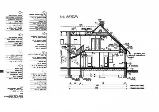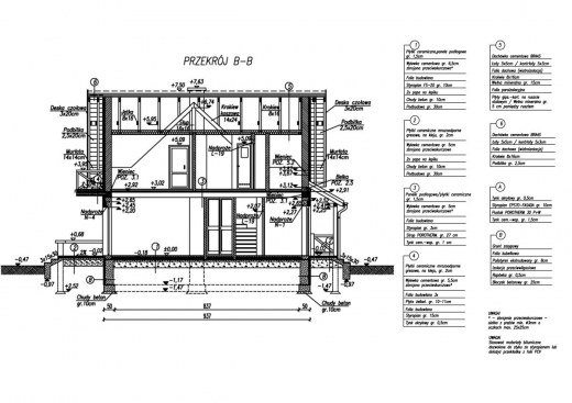 Technologia tradycyjna, ściany zewnętrzne murowane grubości 30 cm + 10 cm styropian, ściany wewnętrzne (nośne) gr. 25 cm i działowe gr. 12 cm. Wszystkie ściany wykonane z pustaków ceramicznych "POROTHERM". Strop gęstożebrowy "POROTHERM"o gr. 27 cm.. Konstrukcja więźby dachowej drewniana, pokrycie dachówka ceramiczna.