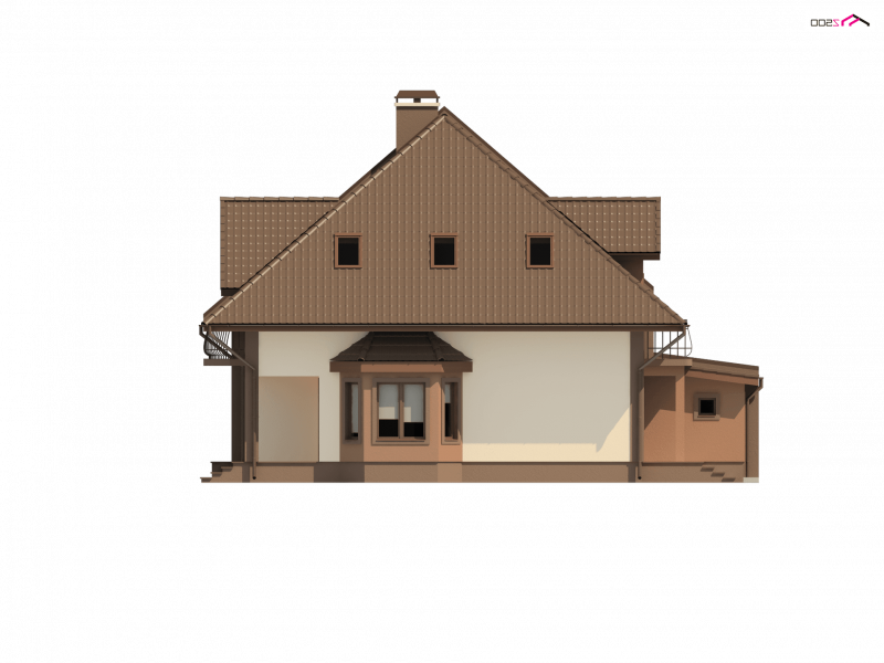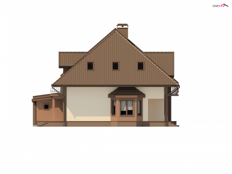 Poszczególne części domu wydzielone są przez wielopoziomowe kondygnacje. Na parterze znajduje się otwarty na ogród pokój dzienny z kominkiem. Integracji sprzyja także duża, częściowo otwarta kuchnia sąsiadująca z jadalnią, ulokowaną w uroczym wykuszu. Dom posiada jednostanowiskowy garaż, który połączony jest wspólną sienią z domem.Od strony ogrodu przewidziano balkon oraz częściowo zadaszony taras, na który można wyjść bezpośrednio z jadalni. Latem można wystawić stół i zaaranżować jadalnię na świeżym powietrzu.