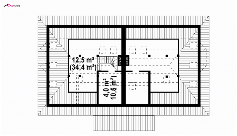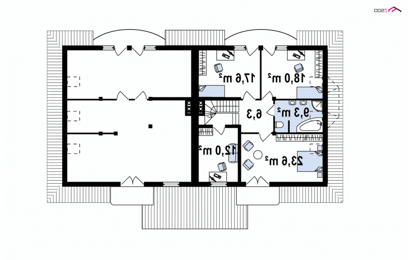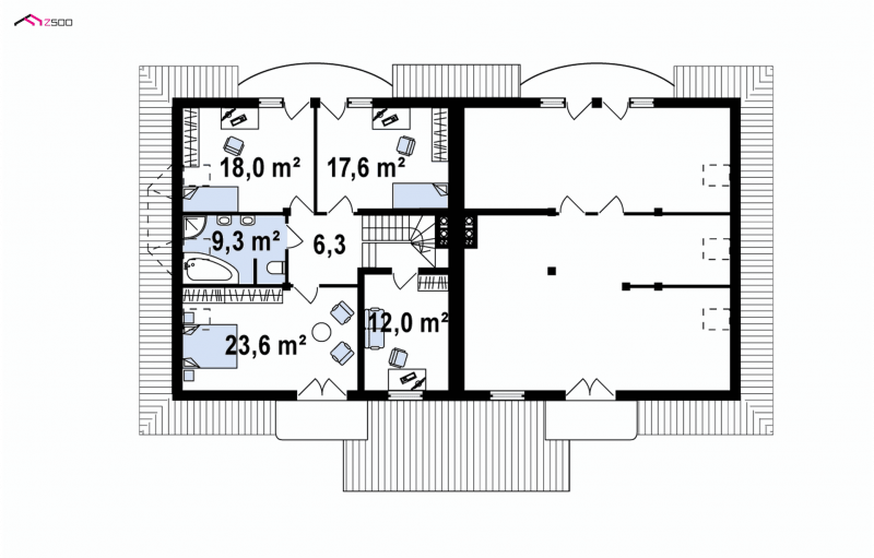 Przestrzeń na indywidualną pracę lub wypoczynek przewidziano na półpiętrze i poddaszu. Cztery pokoje można zaaranżować jako sypialnie lub zrezygnować z jednej na rzecz pokoju do pracy lub pokoju gościnnego dla ukochanej teściowej.Każda sypialnia na poddaszu ma wyjście na balkon. Jako pomieszczenie rekreacyjne lub domową bibliotekę można wykorzystać powstały nad poddaszem dodatkowy strych.