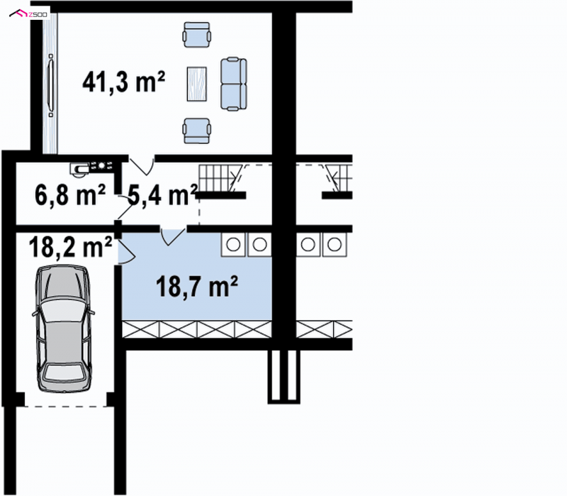 Wnętrze Zb18 stanowi piwnica, pralnia, pomieszczenie gospodarcze, garaż 1 stanowiskowy, oraz pokój rekreacyjny, który można dowolnie zaaranżować. Jeśli jesteśmy wielbicielami siłowni, ping ponga lub bilardu, mamy okazję w pełni wykorzystać pomieszczenie rekreacyjne.