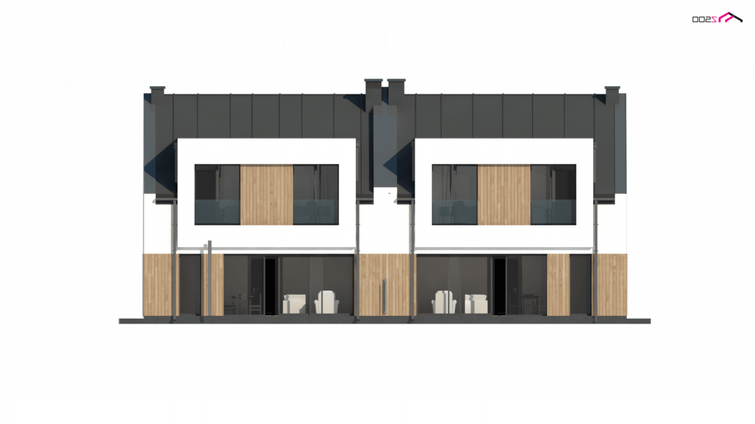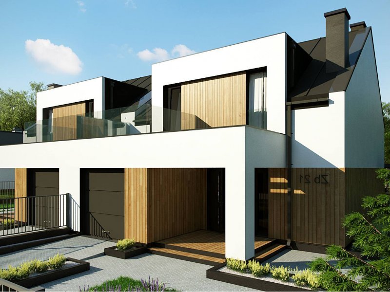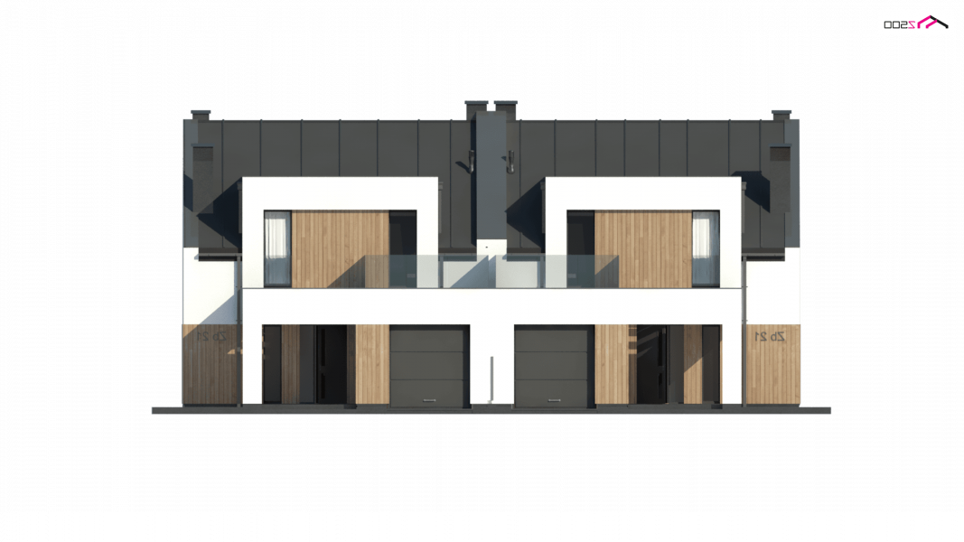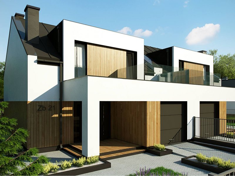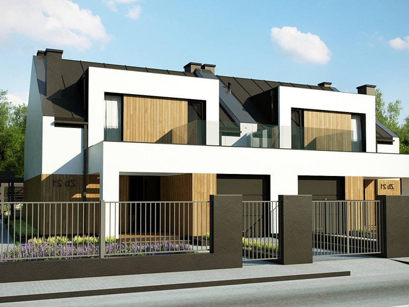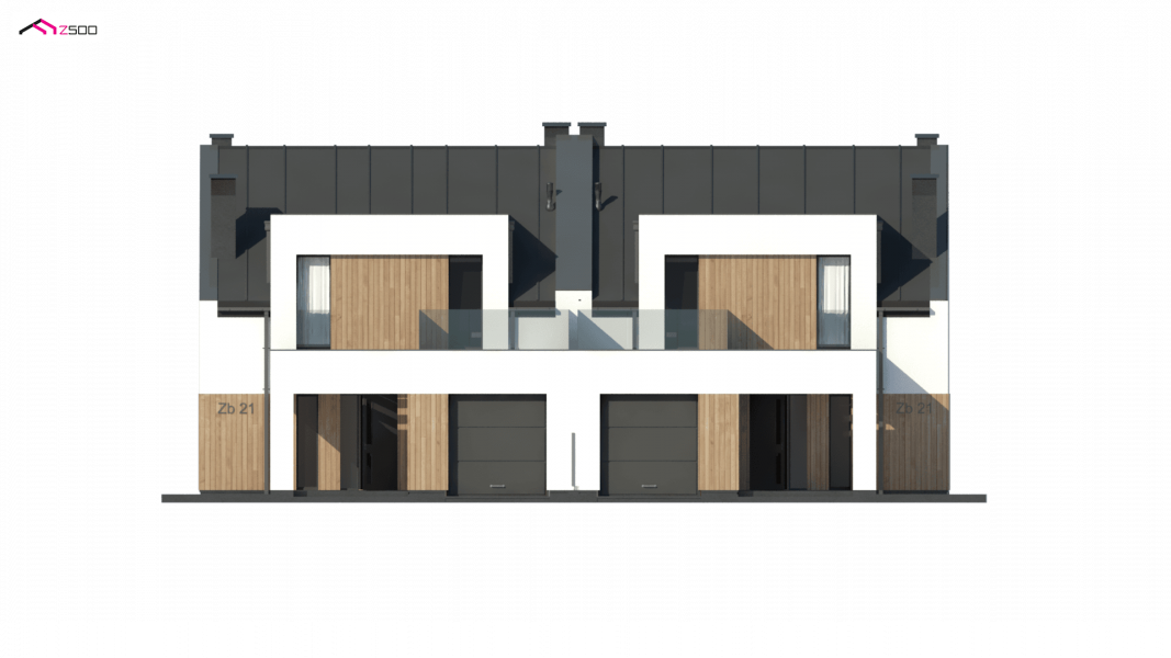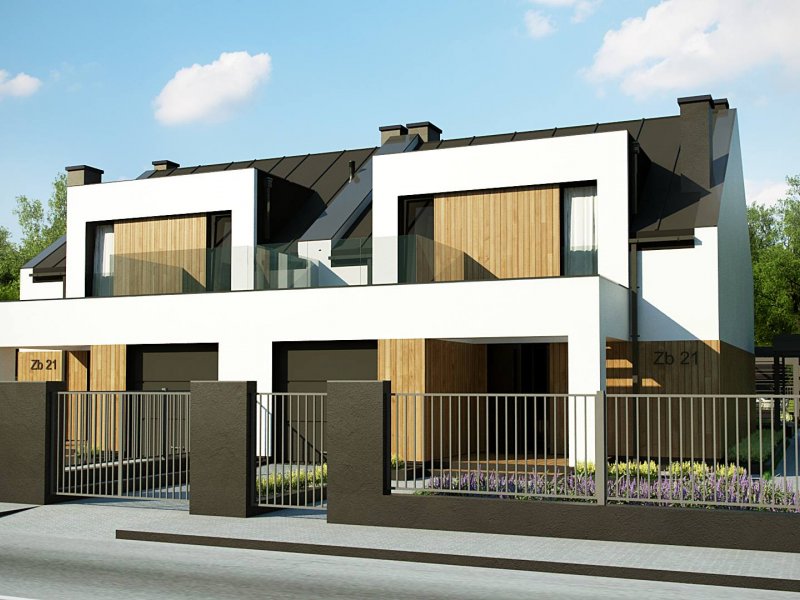 Zb21 Tradycyjny bliźniak z dachem dwuspadowym, nowoczesną bryłą i jednostanowiskowym garażem. Może być pobudowany również jako szeregówka, ponieważ nie posiada bocznych otworów okiennych. Jedynymi elementami ozdobnymi są: pergole oraz drewno bądź tynk imitujący drewno na elewacji. Charakterystyczne dla Zb21 są dwie duże lukarny z płaskim zadaszeniem.