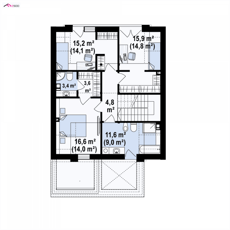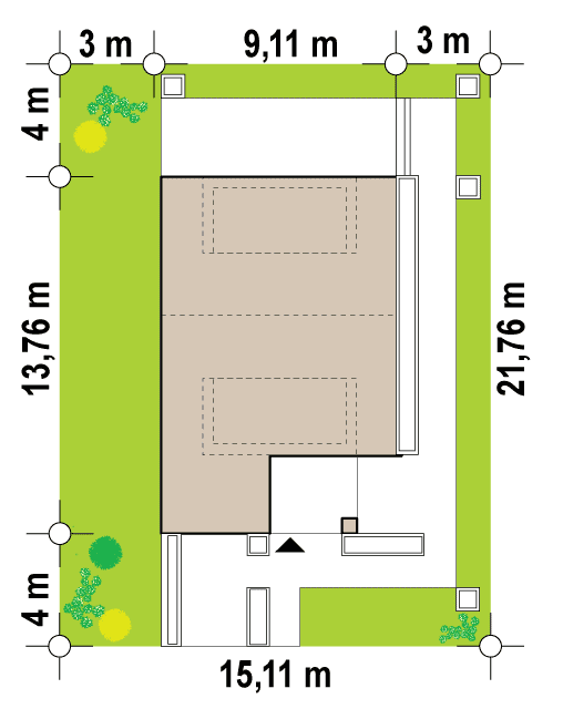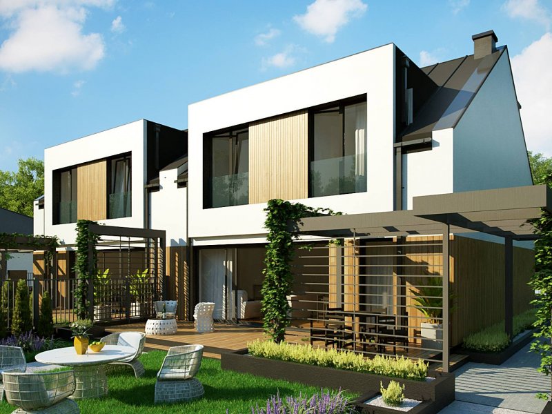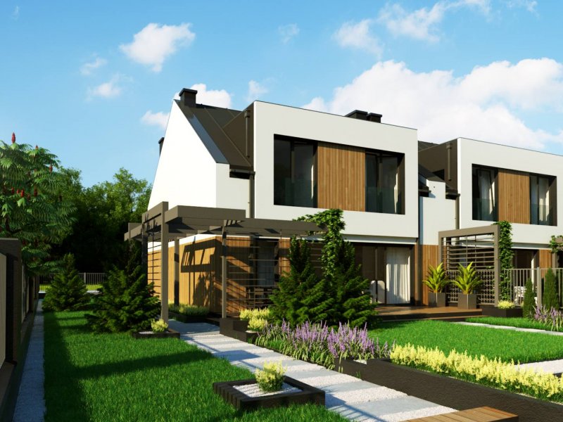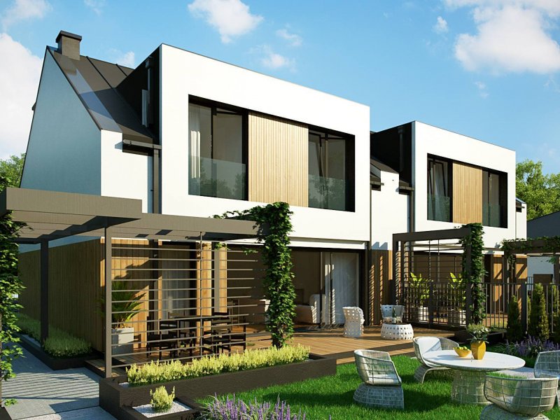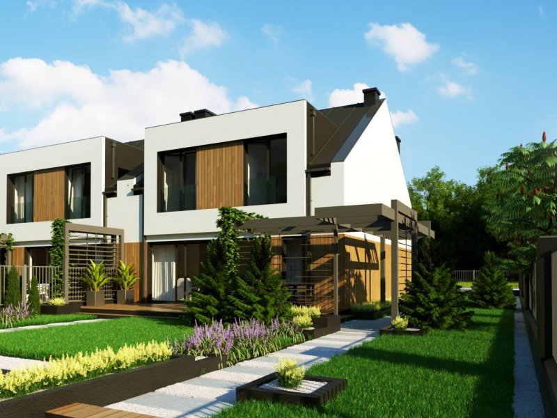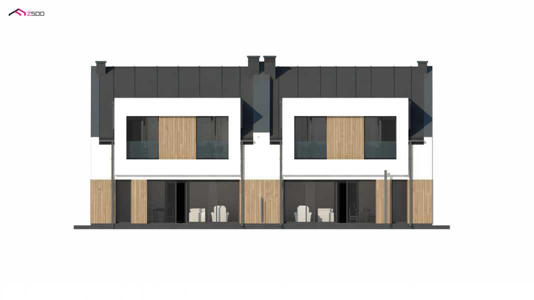 Zb21 Tradycyjny bliźniak z dachem dwuspadowym, nowoczesną bryłą i jednostanowiskowym garażem. Może być pobudowany również jako szeregówka, ponieważ nie posiada bocznych otworów okiennych. Jedynymi elementami ozdobnymi są: pergole oraz drewno bądź tynk imitujący drewno na elewacji. Charakterystyczne dla Zb21 są dwie duże lukarny z płaskim zadaszeniem.