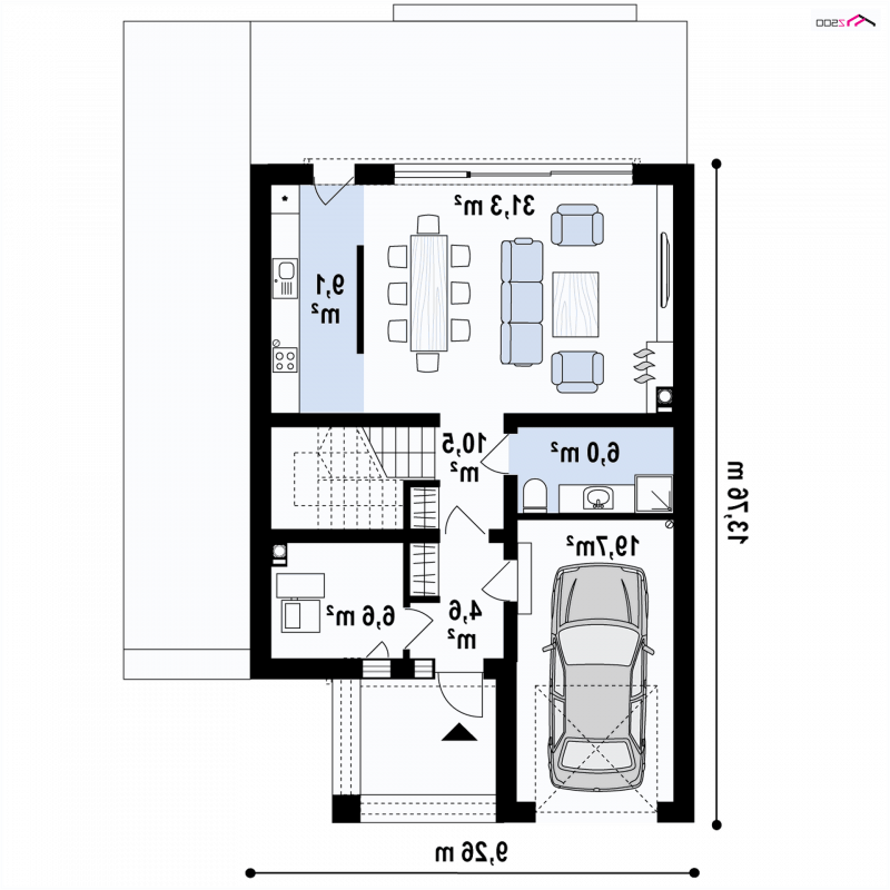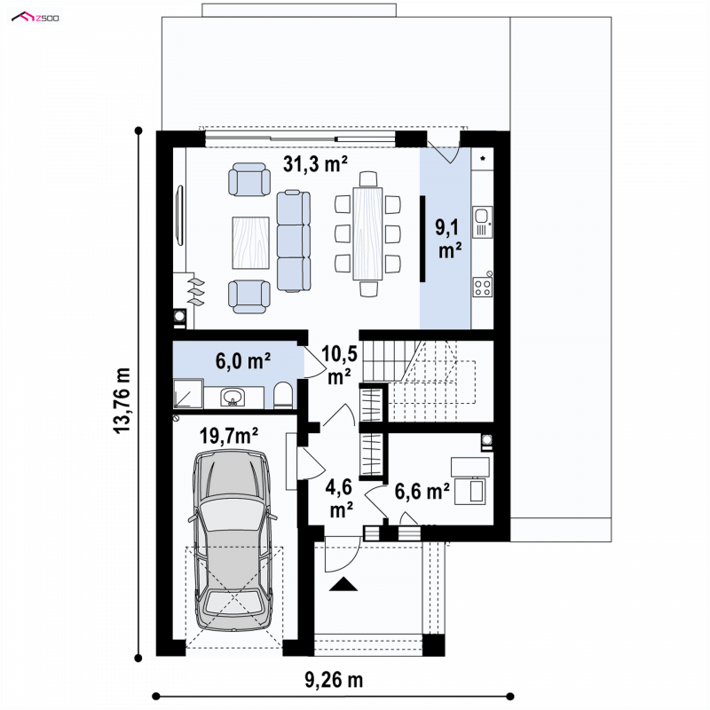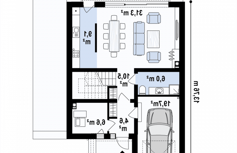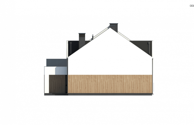 U progu wita nas zadaszone wejście do sieni, która jest ogniwem łączącym garaż z pomieszczeniem gospodarczym na paliwo stałe. Centralny ośrodek strefy dziennej stanowi przestronny salon z aneksem kuchennym, który oddzielono ścianką działową dla podtrzymania wrażeń estetycznych w części jadalnej. Przeszklona ściana przesuwna i drzwi w części kuchennej dostarczają dużej ilości światła i dobrego humoru.