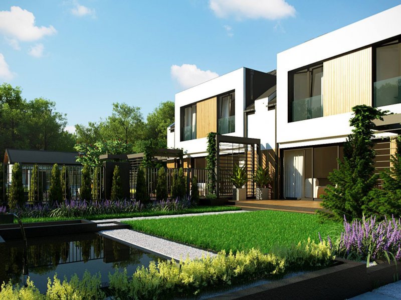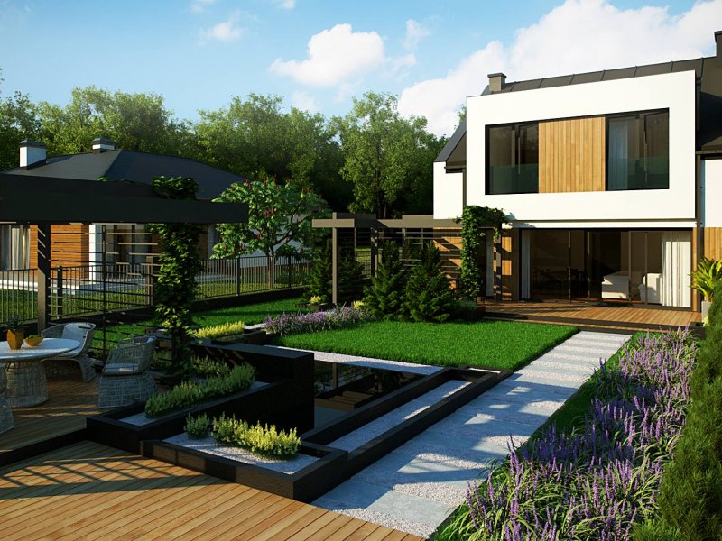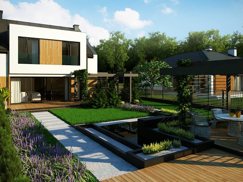 Największą atrakcję dedykowanego projektu niewątpliwie stanowi zewnętrzny kominek w altance i oczko wodne wkomponowane w architekturę ogrodową. Dzięki nim spędzimy miłe chwile w gronie najbliższych przyjaciół i rodziny.