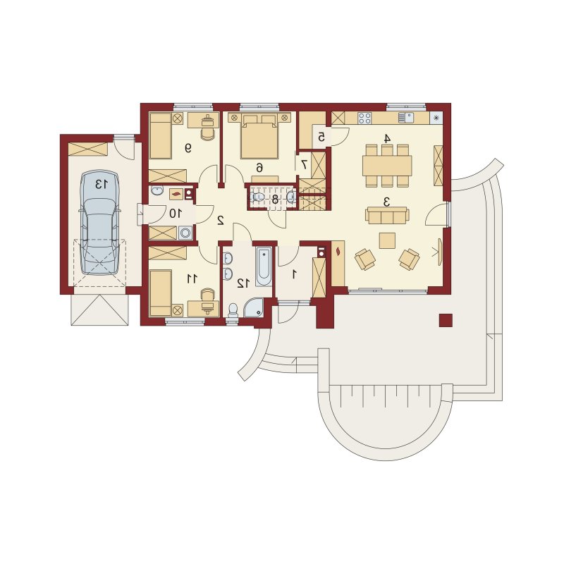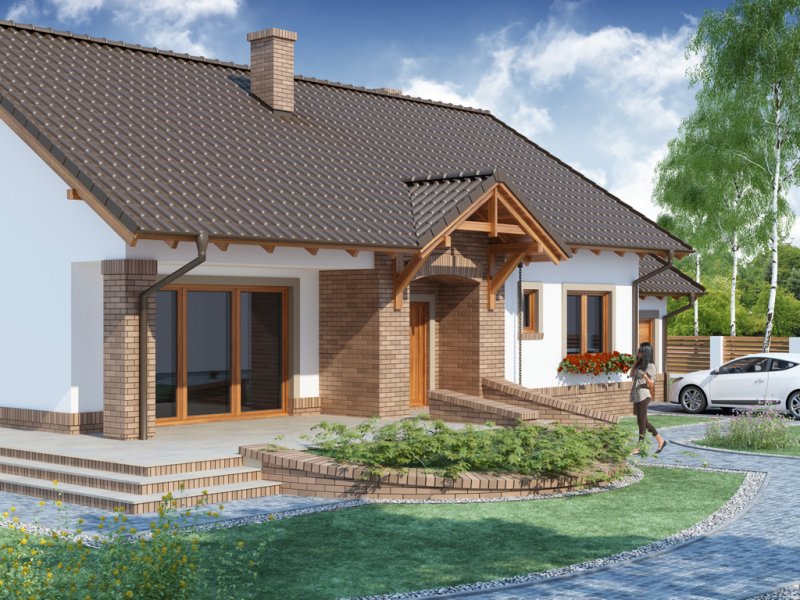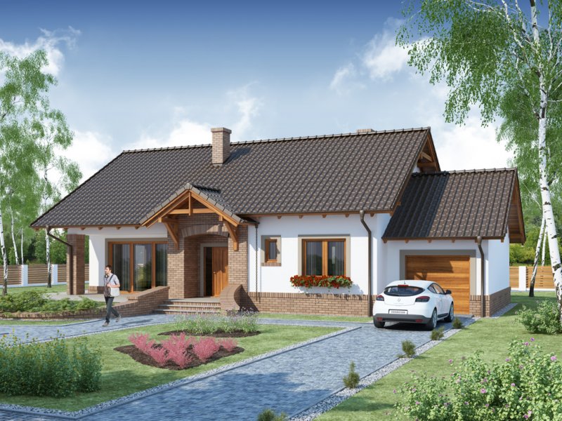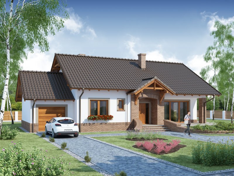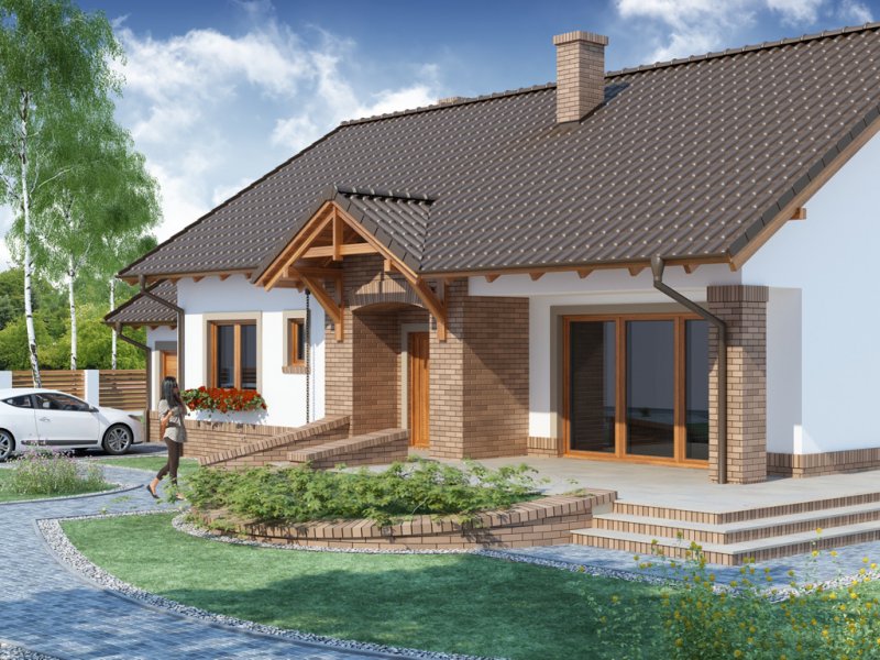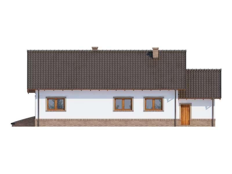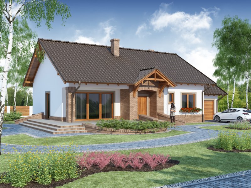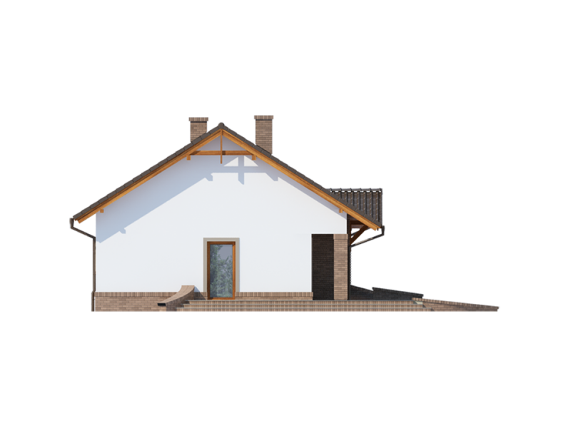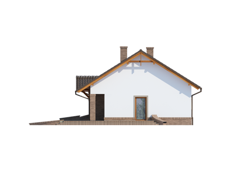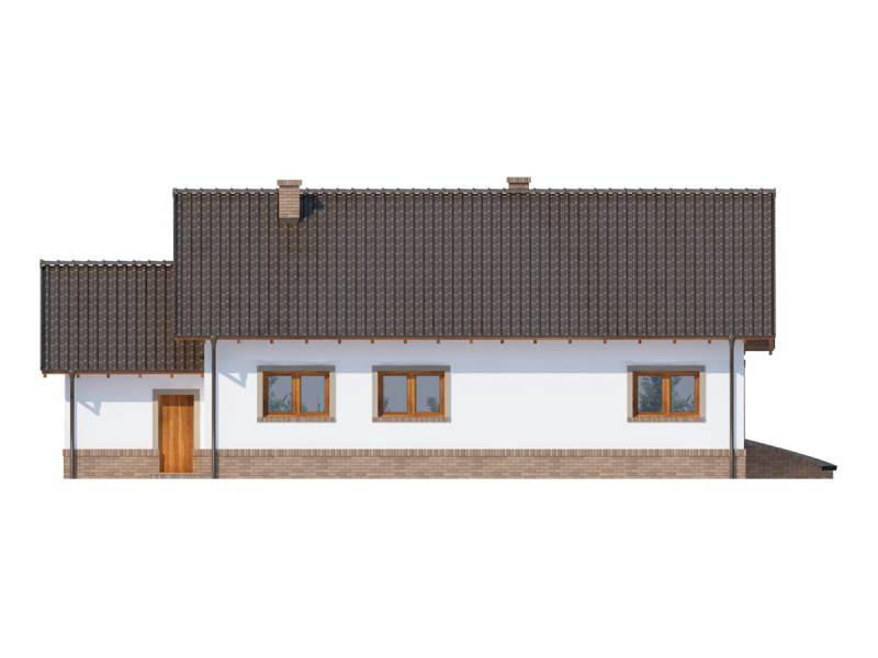 Amazis jest domem świetnie wpisującym się w szeroką i krótką działkę. Jest stworzony dla rodziny 4-osobowej z upodobaniem do rozwiązań prostych i nowoczesnych. Dom generalnie dzieli się na 2 części – dzienną oraz nocną. Ta pierwsza to salon z jadalnią i otwarta na nie kuchnia ze spiżarnią. Zwolennicy kuchni zamkniętych mają możliwość rozdzielenia kuchni od dwóch pozostałych pomieszczeń. Salon posiada kominek komfortowo usytuowany w niedużej odległości zarówno od jadalni jak i strefy wypoczynkowej salonu. W tej części zaprojektowano doskonale doświetlające wnętrze duże przeszklenia, umożliwiające wyjście na taras zarówno od strony frontowej, jak i na ten zadaszony od strony ogrodu. Druga część budynku to strefa nocna. Składa się z trzech sypialni oraz łazienki. Rezygnując ze spiżarni i garderoby dostępnej z dwuosobowej sypialni, możemy ją znacznie powiększyć. W skrajnej części domu zlokalizowano pomieszczenie gospodarcze, przez które przejść można do jednostanowiskowego garażu, z którego z kolei zaprojektowano użyteczne wyjście na część ogrodową. Istnieje możliwość zaadaptowania poddasza na dodatkowe pomieszczenia użytkowe , dzięki umieszczeniu schodów w miejscu pomieszczenia WC.