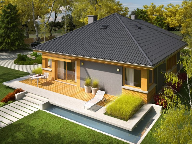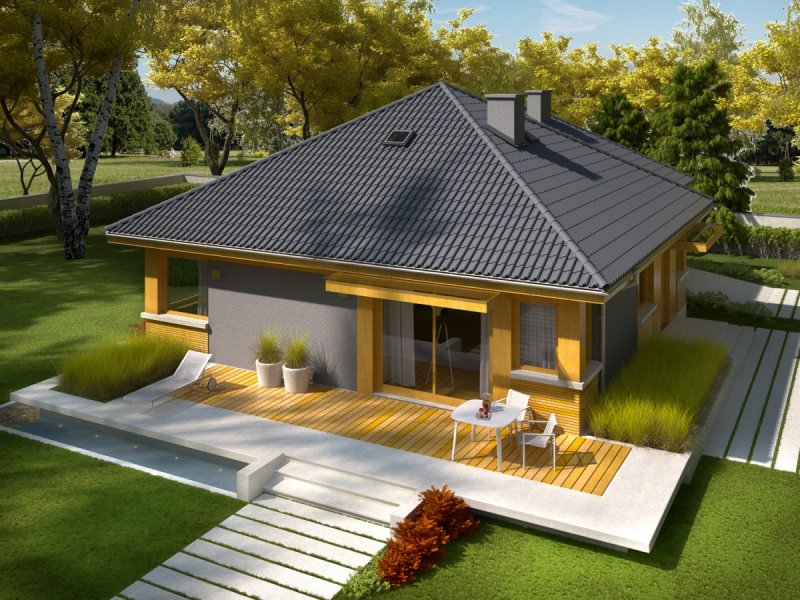 - Dach o konstrukcji drewnianej pokryto dachówką cementową IBF