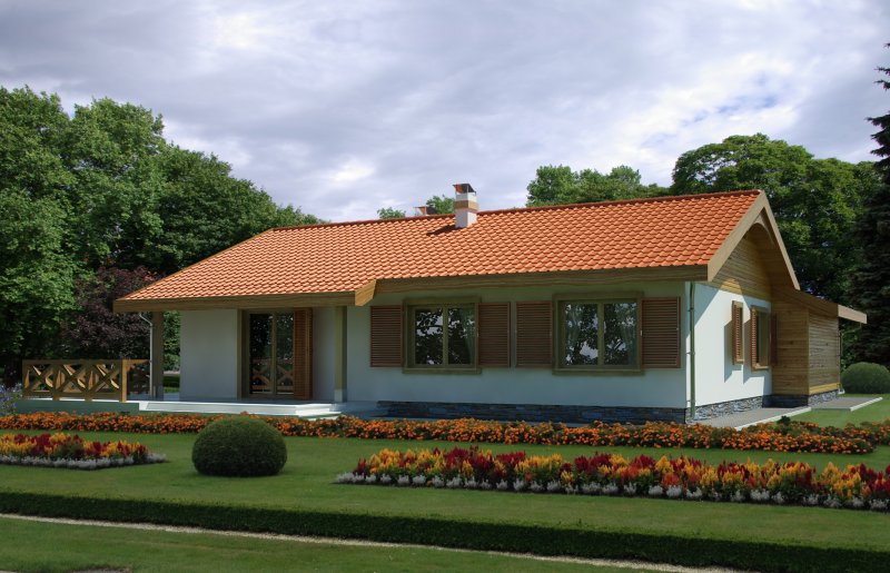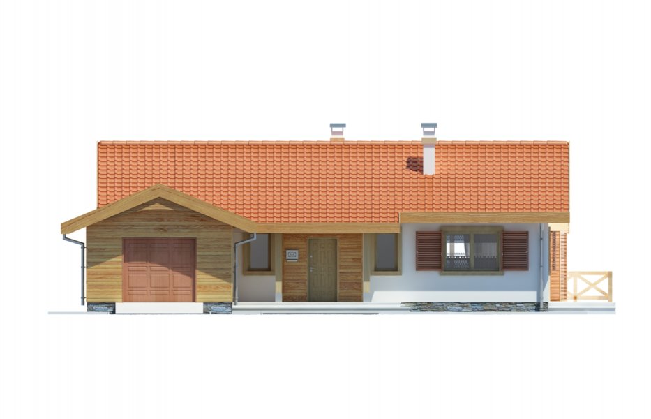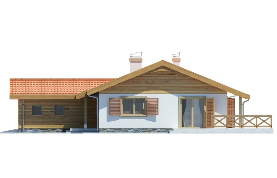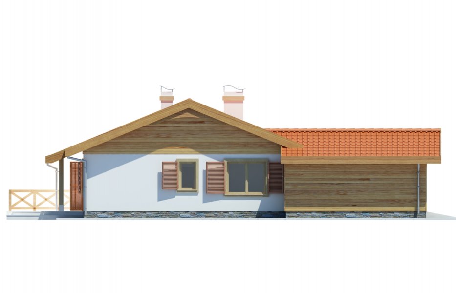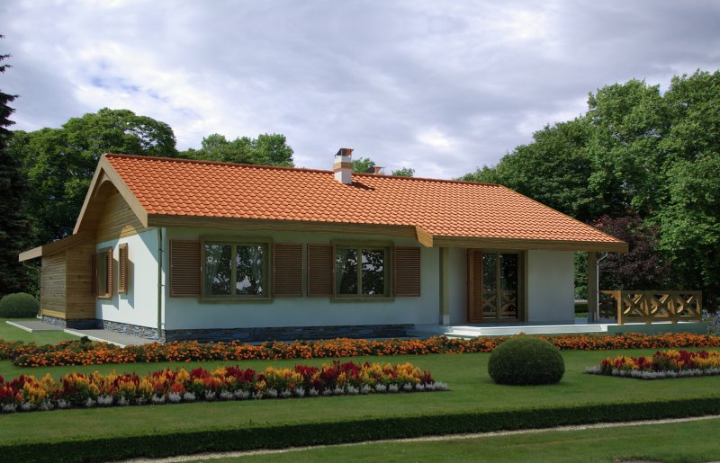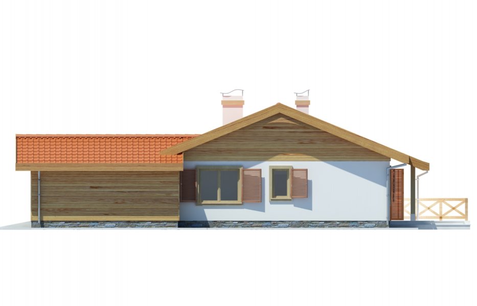 Parterowy przytulny domek z trzema sypialniami i łazienką. Do dyspozycji mamy również przestronny salon z kominkiem i z wyjściem na taras. Zaletą domu jest wyraźnie oddzielona część dzienna, od nocnej. W projekcie przewidziano dwie garderoby, które zminimalizują ilość szaf w domu. Istnieje możliwość likwidacji jednej z nich, uzyskując w ten sposób większą powierzchnię pokoi. Przy kuchni znajduje się pomieszczenie, które z powodzeniem nadaje się na spiżarkę. Dom ma lekką i prostą konstrukcję co sprawia, że będzie niedrogi w budowie i eksploatacji. Dostępna jest również wersja bez garażu i w odbiciu lustrzanym.