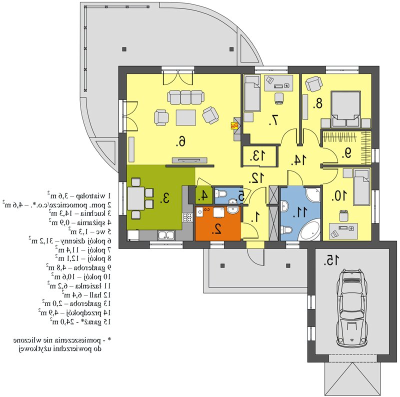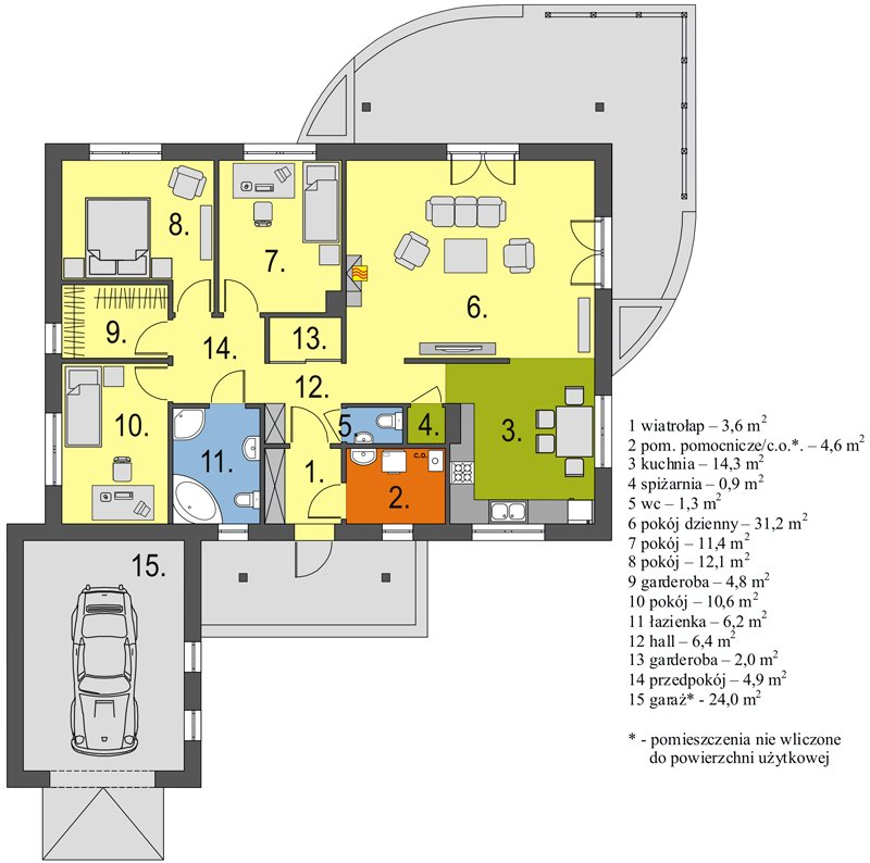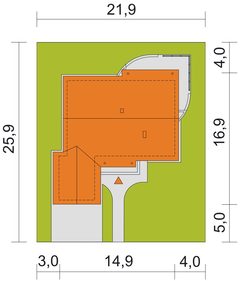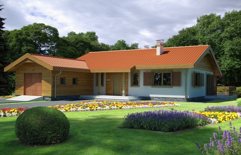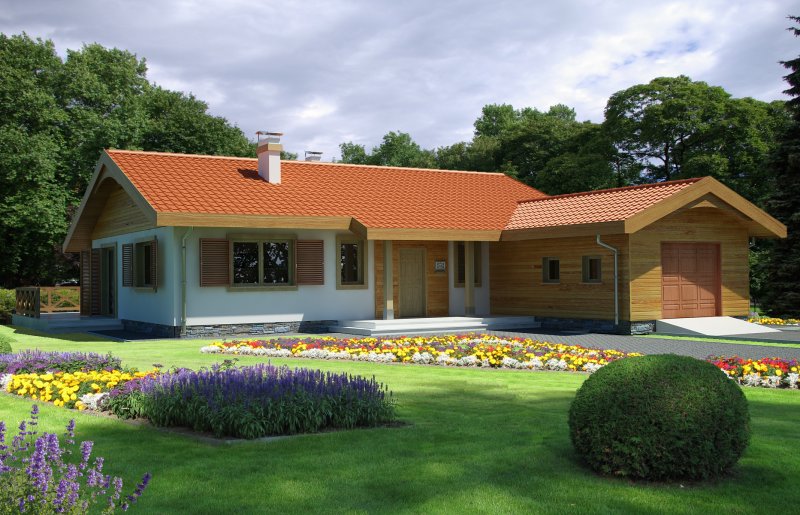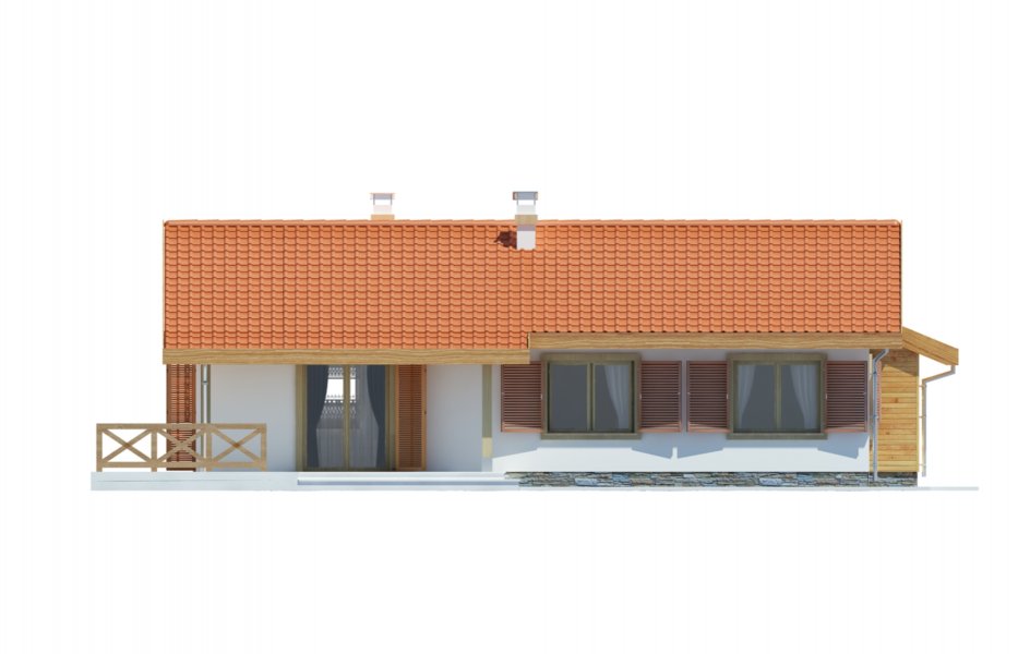 Parterowy przytulny domek z trzema sypialniami i łazienką. Do dyspozycji mamy również przestronny salon z kominkiem i z wyjściem na taras. Zaletą domu jest wyraźnie oddzielona część dzienna, od nocnej. W projekcie przewidziano dwie garderoby, które zminimalizują ilość szaf w domu. Istnieje możliwość likwidacji jednej z nich, uzyskując w ten sposób większą powierzchnię pokoi. Przy kuchni znajduje się pomieszczenie, które z powodzeniem nadaje się na spiżarkę. Dom ma lekką i prostą konstrukcję co sprawia, że będzie niedrogi w budowie i eksploatacji. Dostępna jest również wersja bez garażu i w odbiciu lustrzanym.