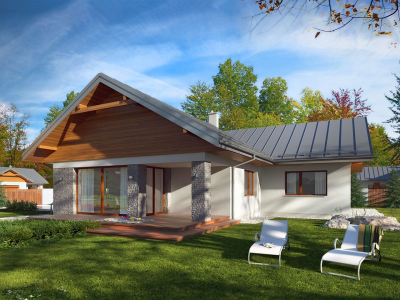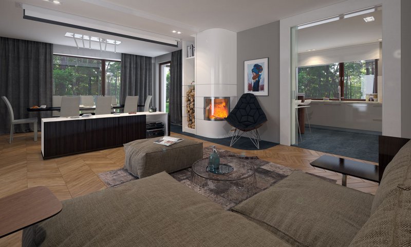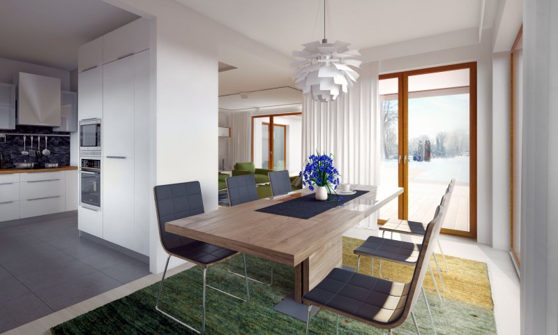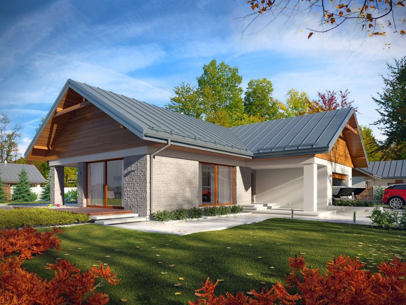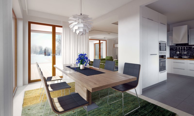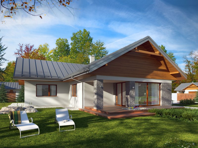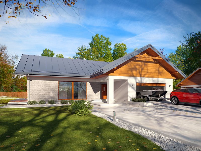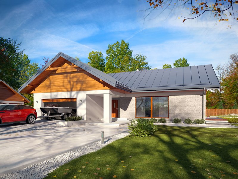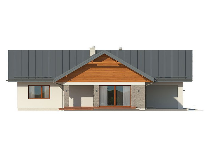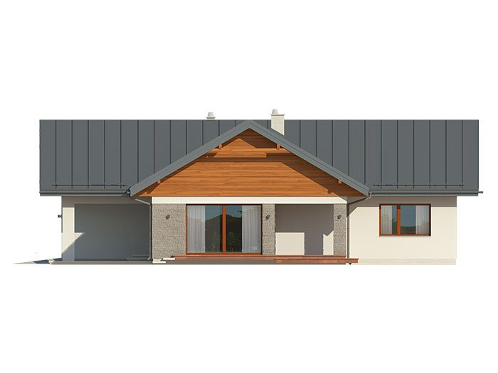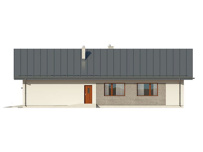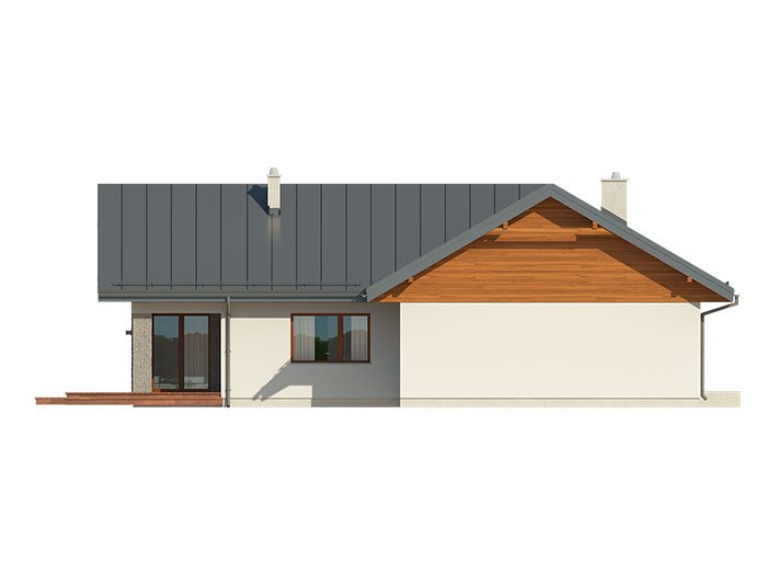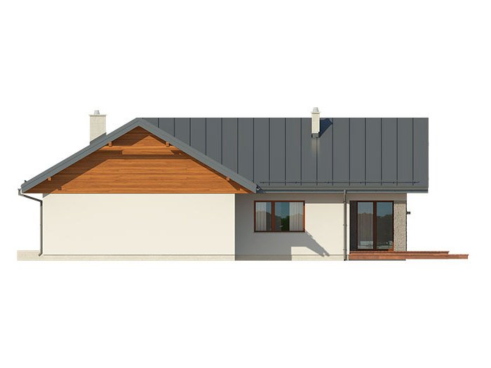 Parterowy dom jednorodzinny z dwustanowiskowym garażem i z wjazdem od południa. Swoim pełnym programem funkcjonalnym zapewnia komfort i wygodę 4-osobowej rodzinie. Przestronna część dzienna to duży salon połączony z jadalnią, otwierający się na ogród poprzez ogromne przeszklenia, kuchnia ze spiżarnią oraz wc. Część nocna to 3 wygodne sypialnie, łazienka oraz garderoba. Dodatkowo główna sypialnia posiada własną garderobę i łazienkę. W domu zaprojektowano dużą kotłownię dostępną z garażu, której parametry pozwalają na montaż kotła na każdy rodzaj paliwa, w tym na paliwo stałe. Ten optymalny i ciekawy program funkcjonalny został ujęty w prostej bryle na rzucie litery T, przykrytej dwuspadowym dachem. Atutem projektu jest jego prostota zarówno w układzie pomieszczeń, jak i w rozwiązaniach elewacji, gdzie elegancki, nowoczesny styl osiągnięto poprzez klasyczne, proste ale szlachetne materiały oraz delikatny, subtelny detal.
