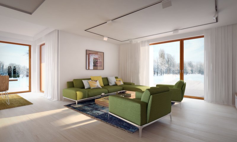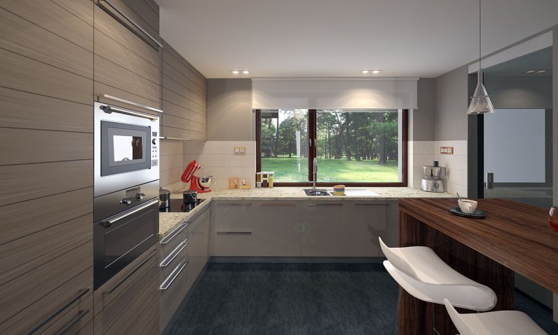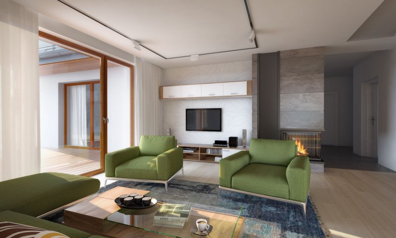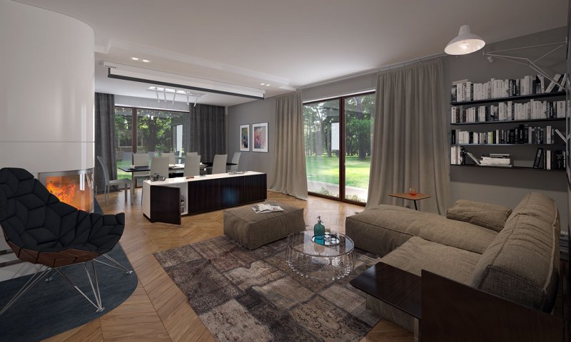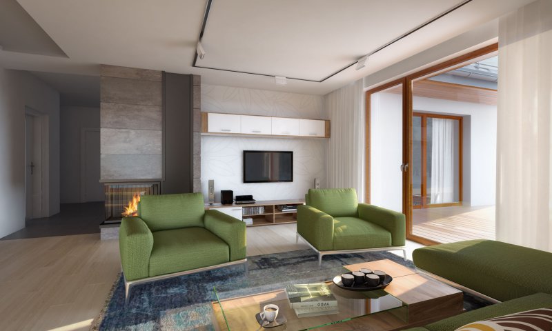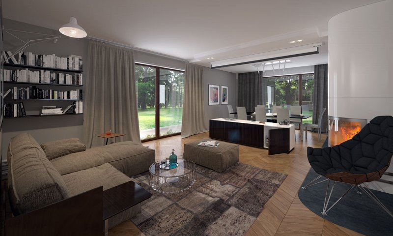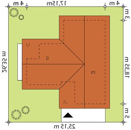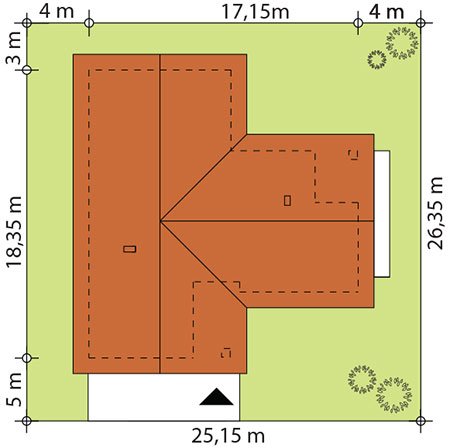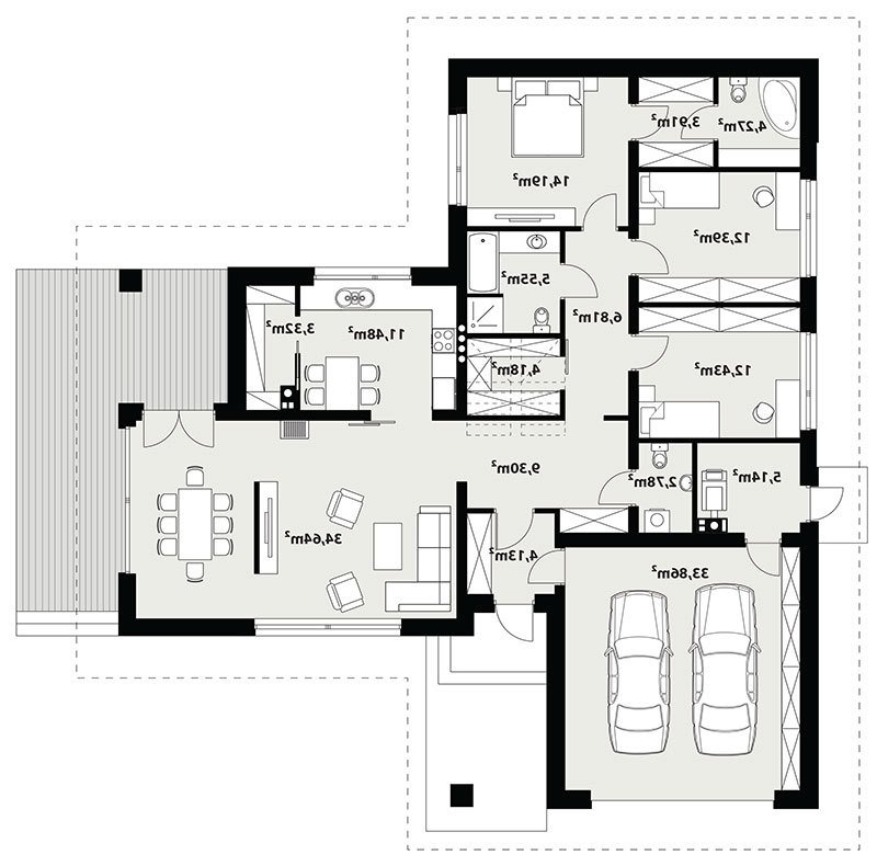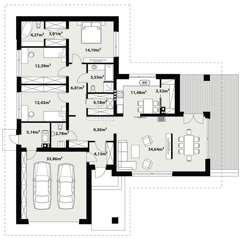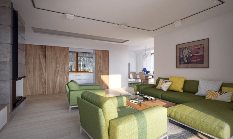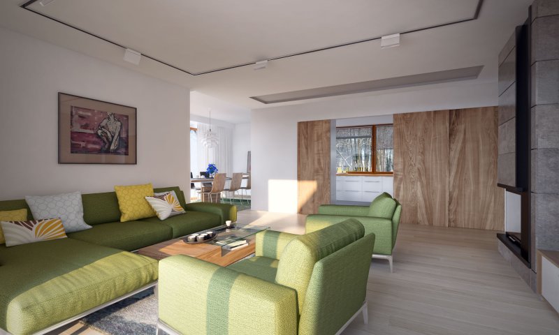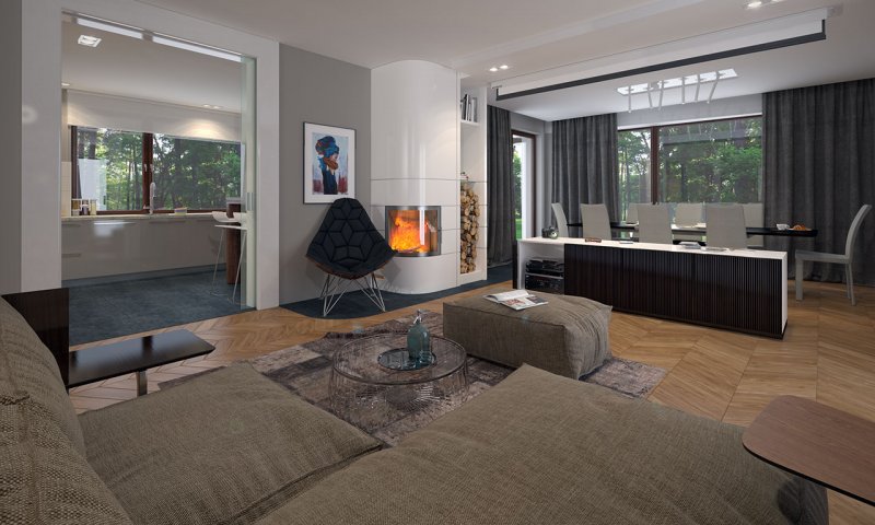 Parterowy dom jednorodzinny z dwustanowiskowym garażem i z wjazdem od południa. Swoim pełnym programem funkcjonalnym zapewnia komfort i wygodę 4-osobowej rodzinie. Przestronna część dzienna to duży salon połączony z jadalnią, otwierający się na ogród poprzez ogromne przeszklenia, kuchnia ze spiżarnią oraz wc. Część nocna to 3 wygodne sypialnie, łazienka oraz garderoba. Dodatkowo główna sypialnia posiada własną garderobę i łazienkę. W domu zaprojektowano dużą kotłownię dostępną z garażu, której parametry pozwalają na montaż kotła na każdy rodzaj paliwa, w tym na paliwo stałe. Ten optymalny i ciekawy program funkcjonalny został ujęty w prostej bryle na rzucie litery T, przykrytej dwuspadowym dachem. Atutem projektu jest jego prostota zarówno w układzie pomieszczeń, jak i w rozwiązaniach elewacji, gdzie elegancki, nowoczesny styl osiągnięto poprzez klasyczne, proste ale szlachetne materiały oraz delikatny, subtelny detal.