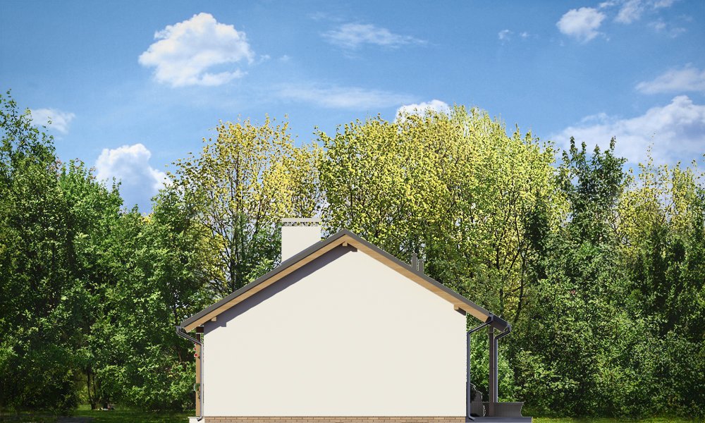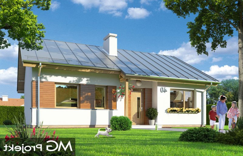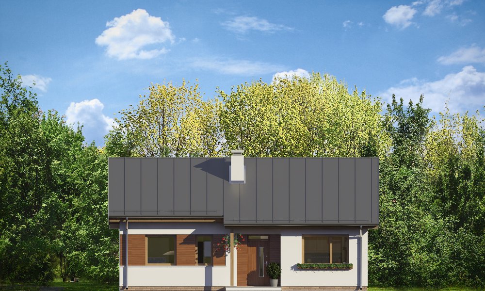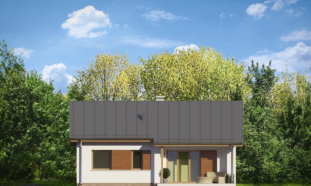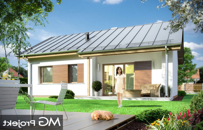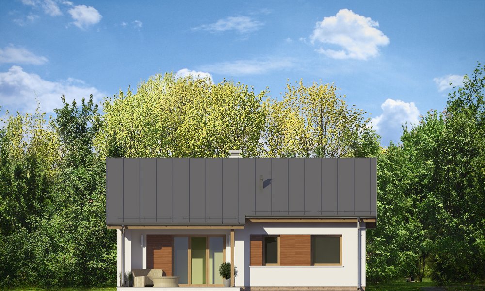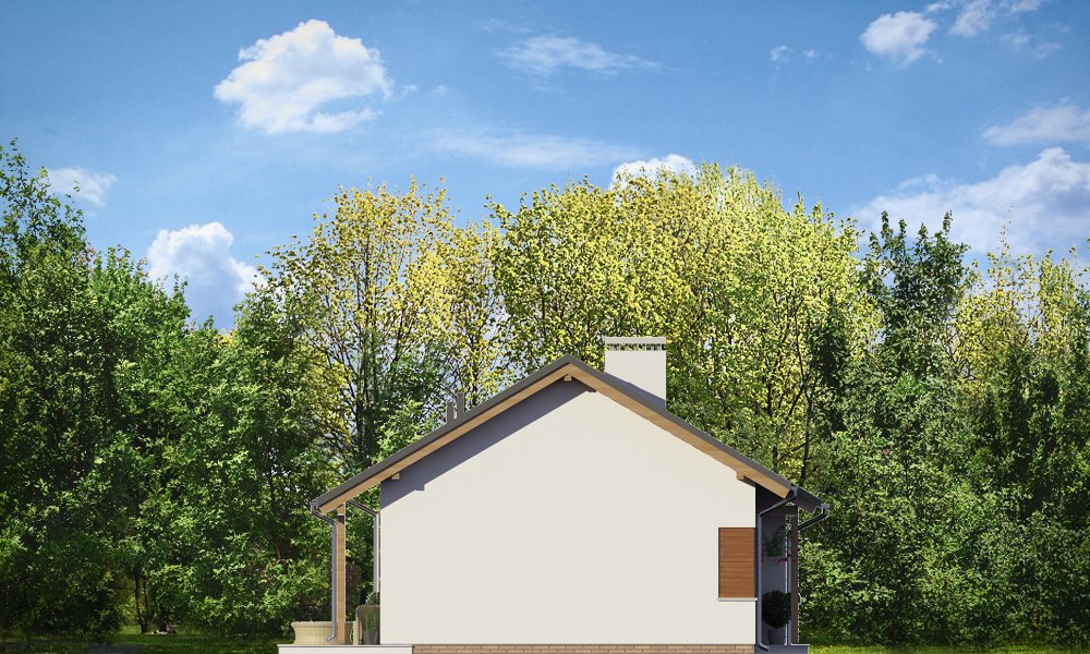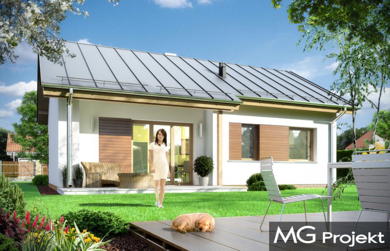 Biedronka to propozycja niewielkiego domu jednorodzinnego dla trzy-czteroosobowej rodziny, parterowego, przekrytego dwuspadowym łagodnym dachem, ze strychem do adaptacji. Domek ma prostą bryłę i konstrukcję. Jest łatwy w budowie i tani w przyszłej eksploatacji. Dzięki zastosowaniu bardzo dobrego ocieplenia i nowoczesnych instalacji jest budynkiem energooszczędnym. Wygląd zewnętrzny to połączenie nowoczesności z tradycyjną formą. Nowoczesne materiały wykończeniowe i detale architektoniczne łączą się tu z tradycyjną formą parterowego domu na planie prostokąta, z dwuspadowym dachem. Elewacje frontowa i ogrodowa zostały urozmaicone zadaszonymi podcieniami, oraz drewnianymi okładzinami ścian. Oryginalny dach kryty blachą na rąbek można łatwo zastąpić dachówką lub blacho dachówką. Wnętrze domu występuje w dwóch wersjach: wariancie z dostępem na strych przez wyciągane schodki drabinkowe, oraz wariancie ze schodami na strych. W obu wersjach dostajemy w górę do nieużytkowego poddasza – strychu, który można dowolnie zaadaptować, jako magazyn, lub jako pomieszczenie użytkowe. Parter domu składa się z części dziennej z salonem, kuchnią i holem, oraz dwóch sypialni z łazienką. Przy przedsionku znajduje się kotłownia gazowa, którą łatwo można zmienić na kotłownię z piecem na paliwo stałe. Mimo niewielkiej powierzchni dom ma przestronne i wygodne wnętrze. Biedronka jest budynkiem całorocznym, może być też wykorzystywana jako dom wakacyjny. Prosta i łatwa konstrukcja pozwoli zaoszczędzić na kosztach budowy. Biedronka to z pewnością propozycja dla rozsądnie myślącego Klienta. Projekt występuje w wersji bez garażu, ale bardzo łatwo można doprojektować garaż z boku domu, przy sypialniach. Pracownia posiada odbicie lustrzane projektu.