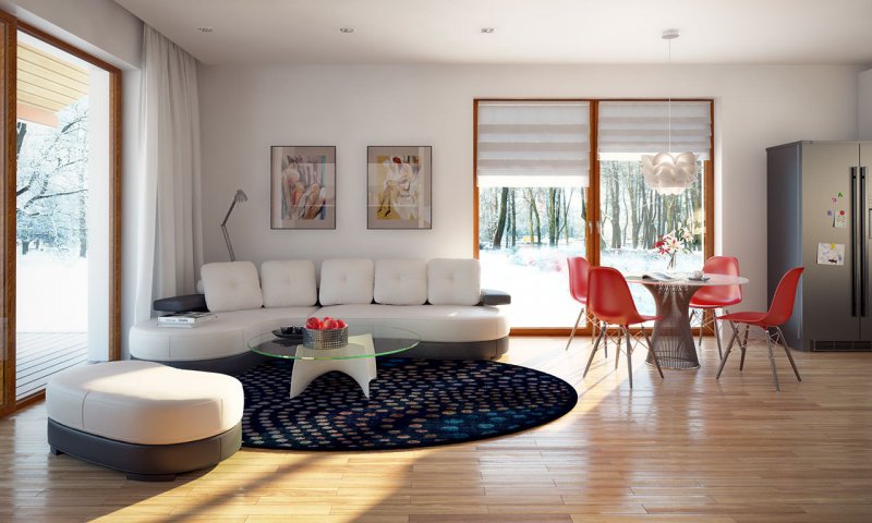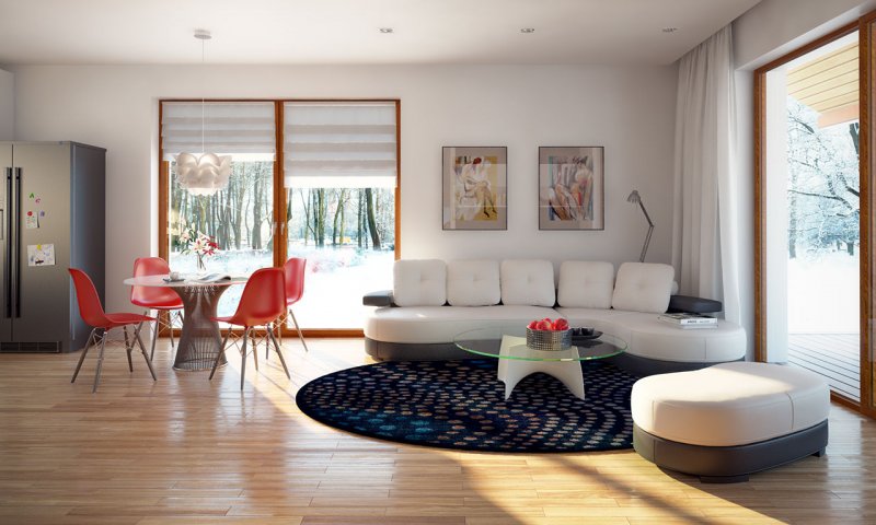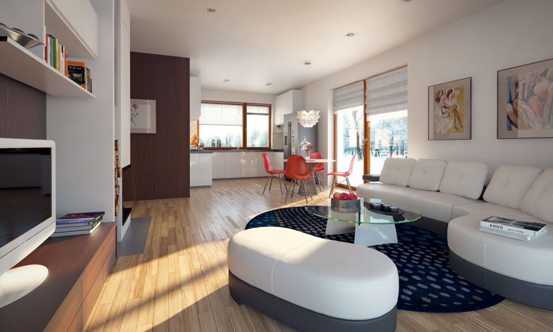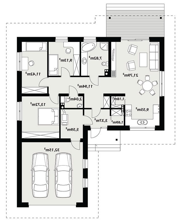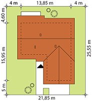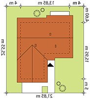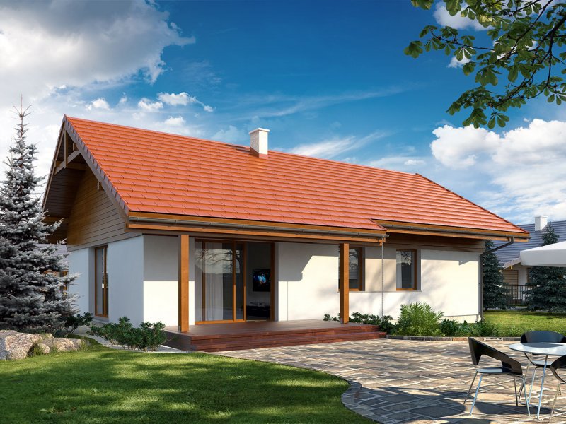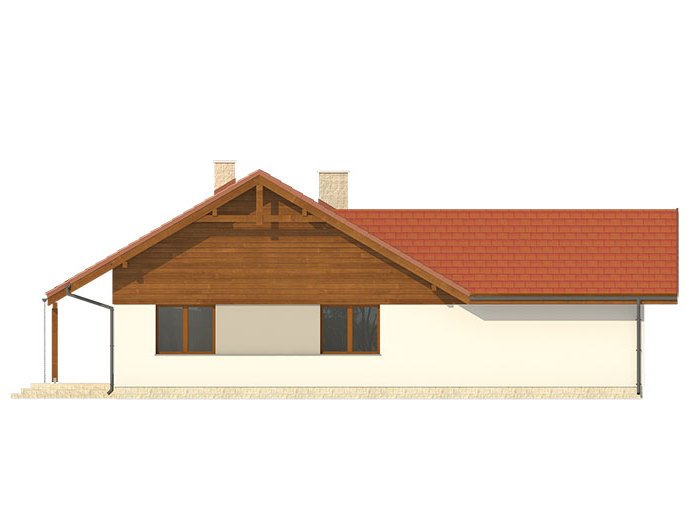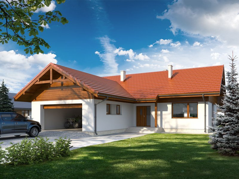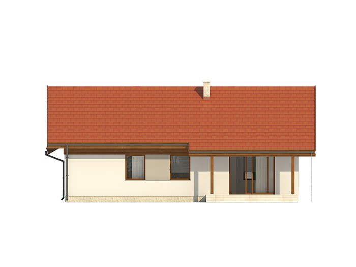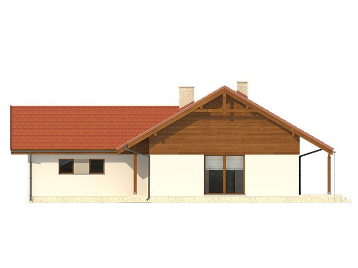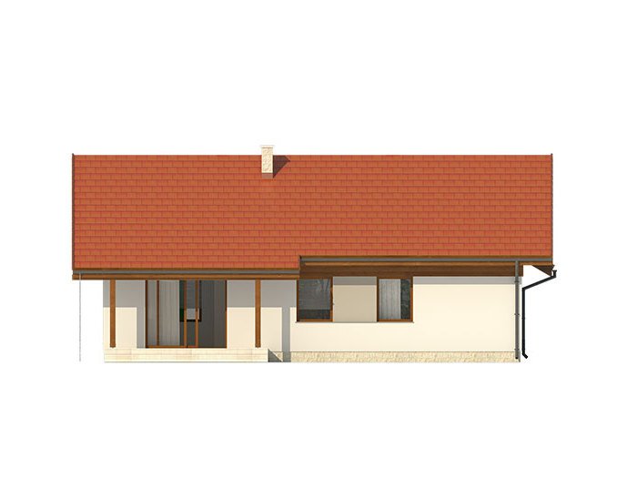 Niewielki jednorodzinny budynek mieszkalny, parterowy, niepodpiwniczony z dwustanowiskowym garażem. W swojej niewielkiej formie zawarł wygodny i optymalny układ pomieszczeń, który zapewni komfort 4-osobowej rodzinie. Funkcjonalnie rozplanowana przestrzeń została wyraźnie podzielona na część dzienną i nocną. Część reprezentacyjna domu, to przestronny salon połączony z jadalnią, który otwiera się na duży zadaszony taras, kuchnia wzbogacona o spiżarnię oraz wc. Oprócz części reprezentacyjnej, zaprojektowano trzy sypialnie i dużą łazienkę stanowiącą cześć intymną domu, oraz dużą kotłownię i dwustanowiskowy garaż w części gospodarczej.