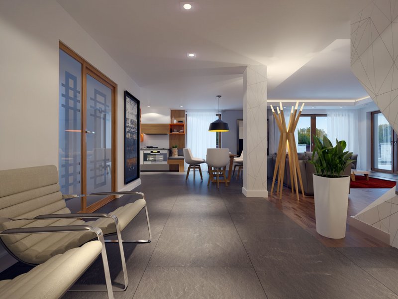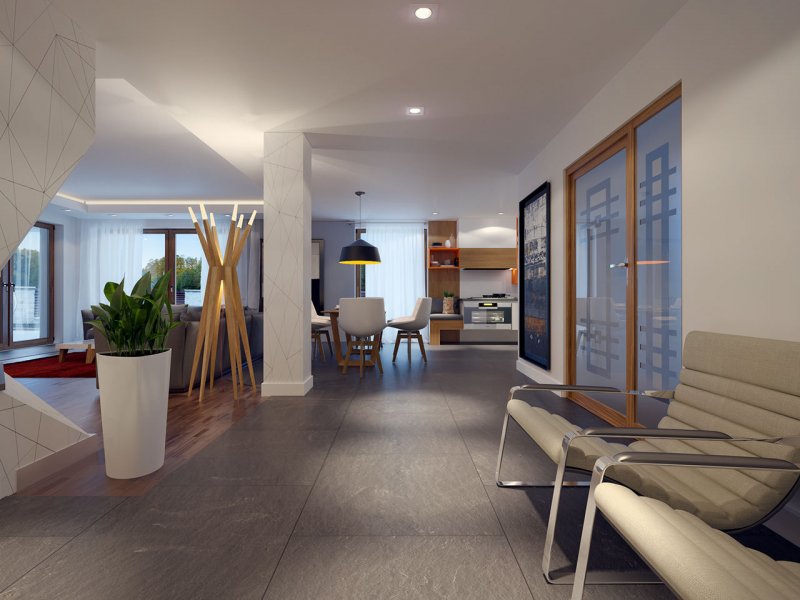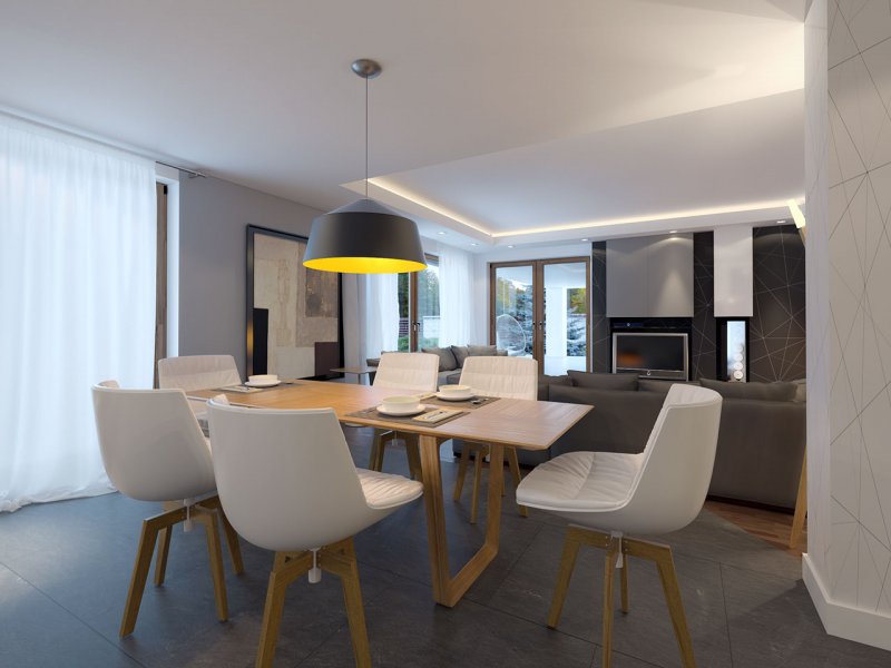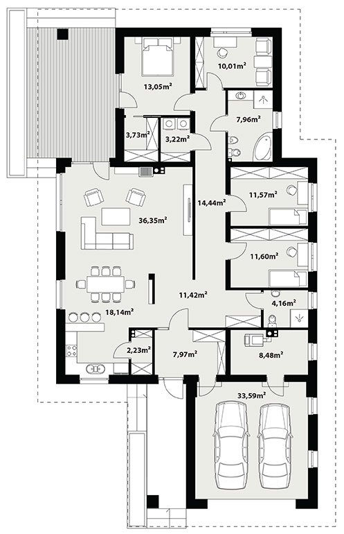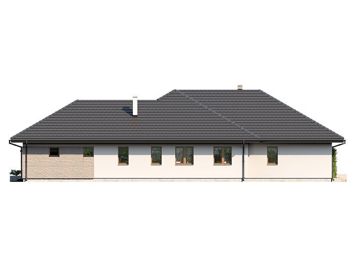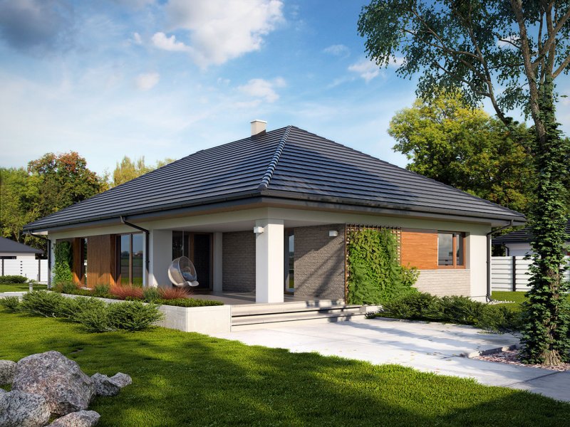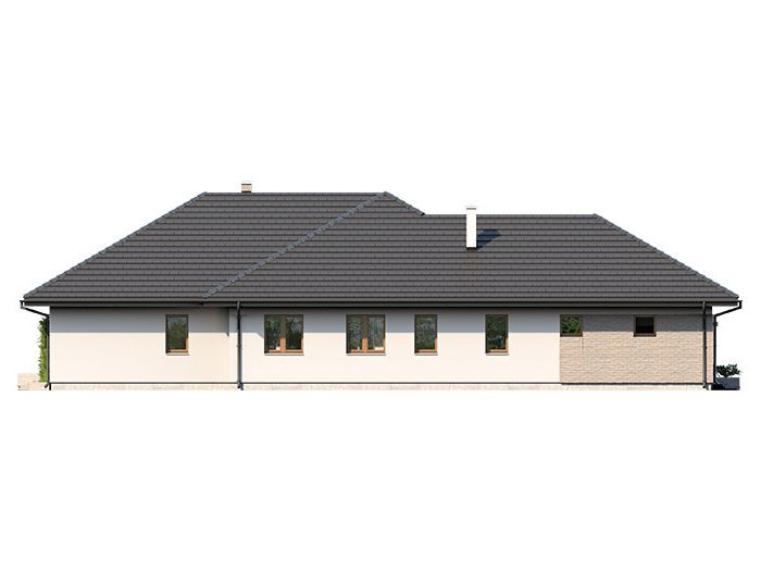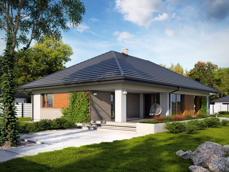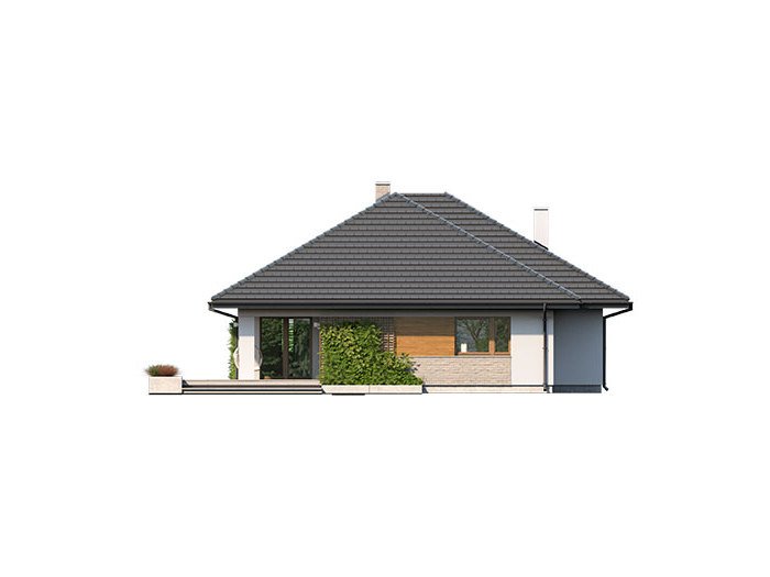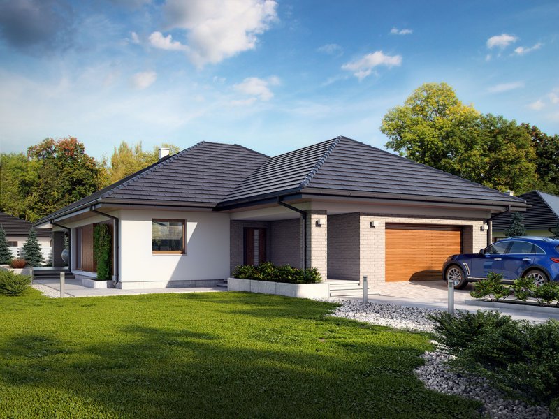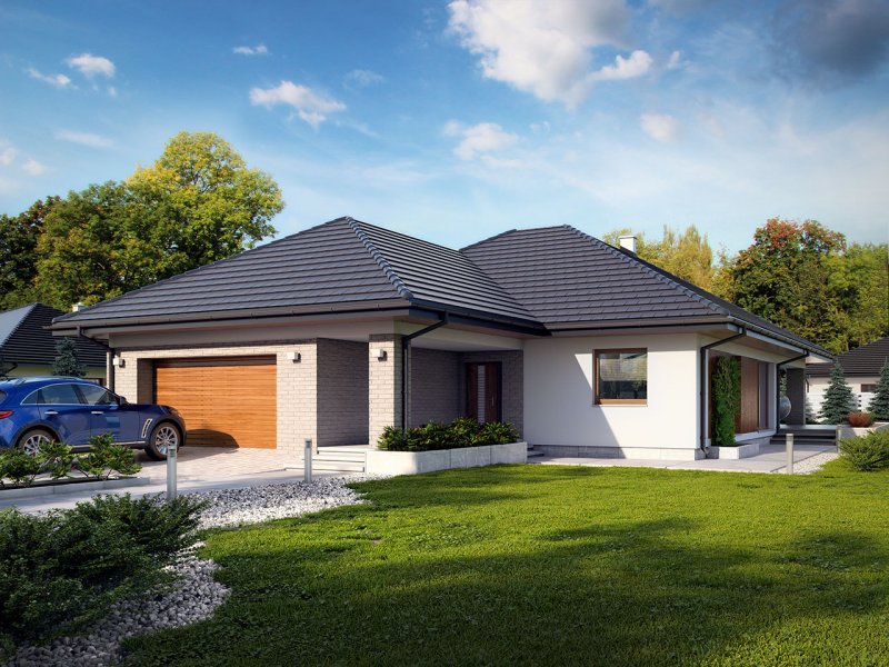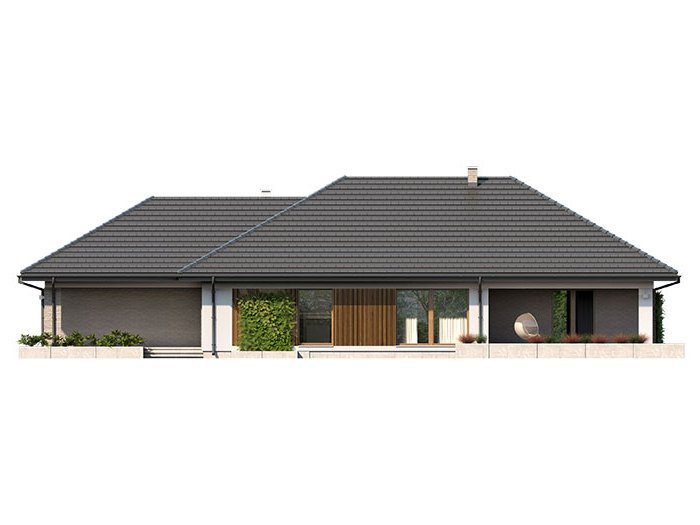 Dom jednorodzinny, parterowy z garażem dwustanowiskowym. Atutem projektu jest przestronne, wygodne wnętrze z dużymi przeszkleniami. Na parterze znajduje się część dzienna: obszerna kuchnia oraz salon z jadalnią posiadające wyjście na duży zadaszony taras. Częśc prywatna domu obemuje dużą sypialnia rodziców z garderobą, pralnię, łazienkę oraz pokój gościnny. Obok znajdują się 2 mniejsze sypialnie oraz dodatkowa łazienka przy wejściu. W projekcie tym przewidziano sporo miejsca na szafy i schowki.