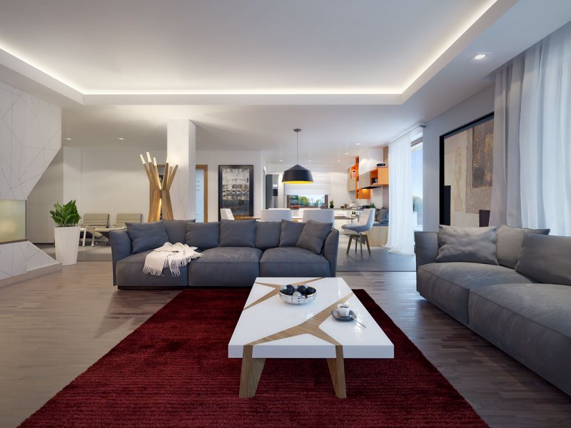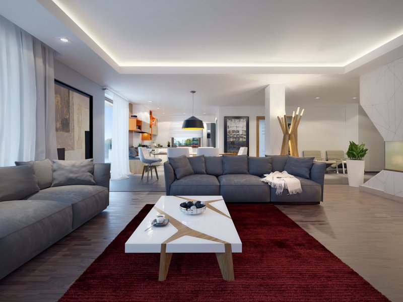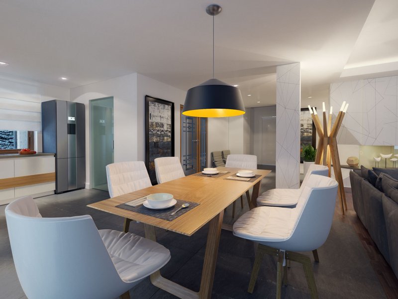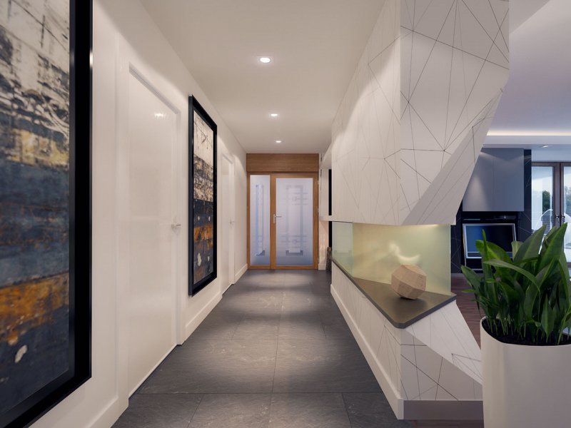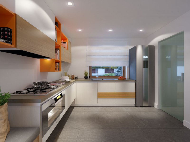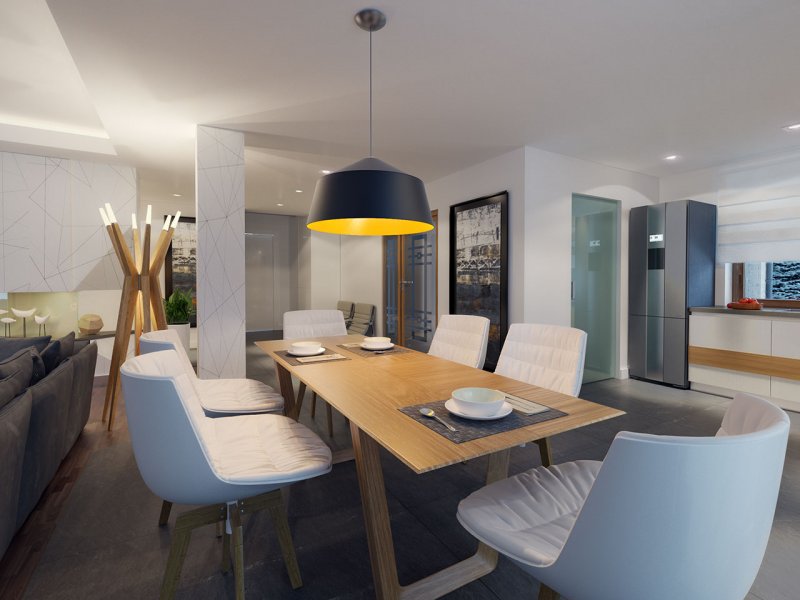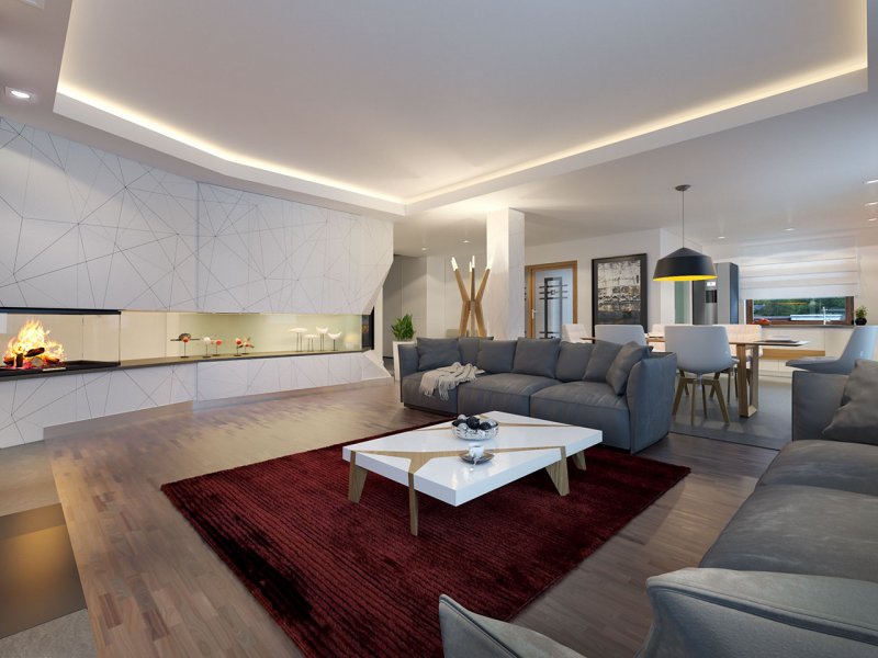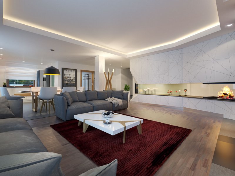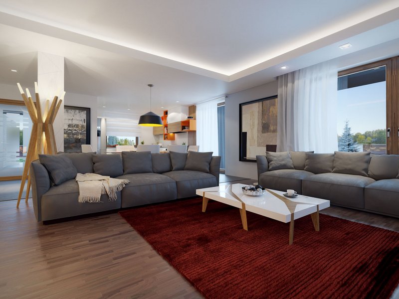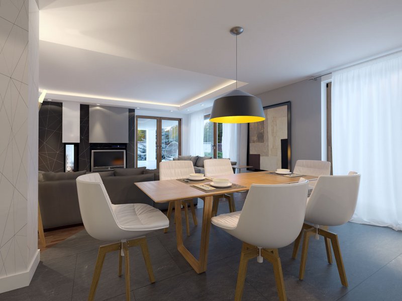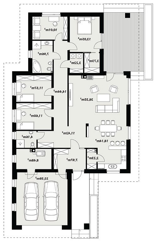 Dom jednorodzinny, parterowy z garażem dwustanowiskowym. Atutem projektu jest przestronne, wygodne wnętrze z dużymi przeszkleniami. Na parterze znajduje się część dzienna: obszerna kuchnia oraz salon z jadalnią posiadające wyjście na duży zadaszony taras. Częśc prywatna domu obemuje dużą sypialnia rodziców z garderobą, pralnię, łazienkę oraz pokój gościnny. Obok znajdują się 2 mniejsze sypialnie oraz dodatkowa łazienka przy wejściu. W projekcie tym przewidziano sporo miejsca na szafy i schowki.