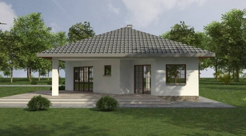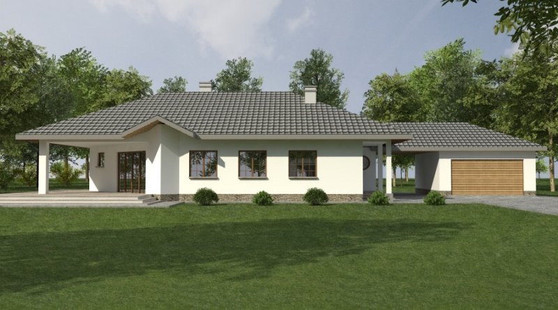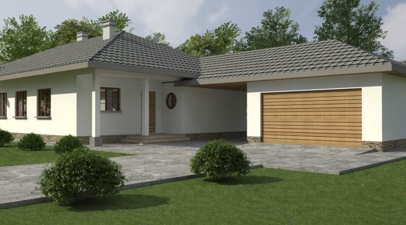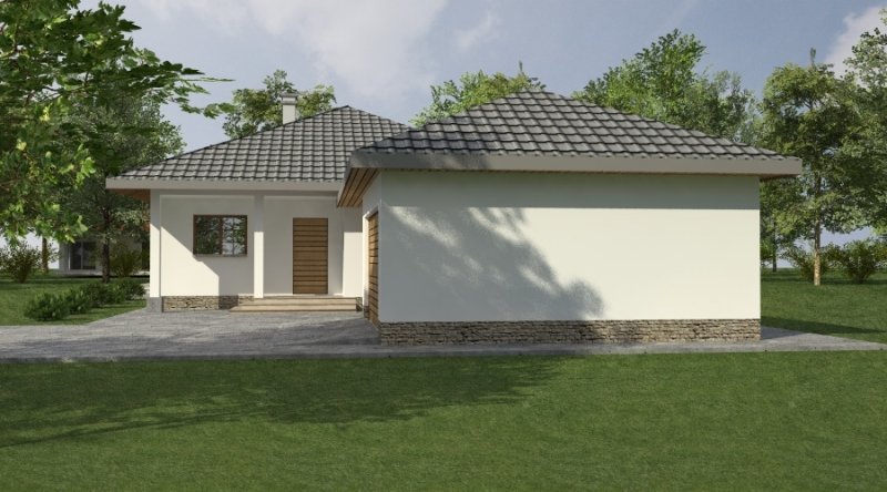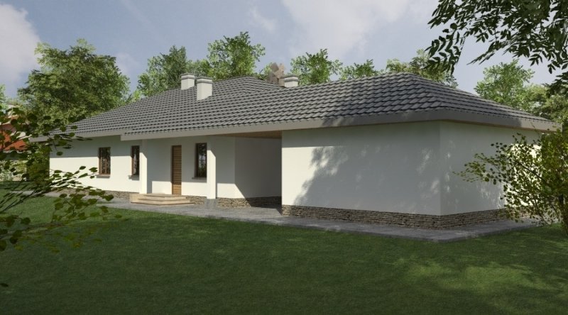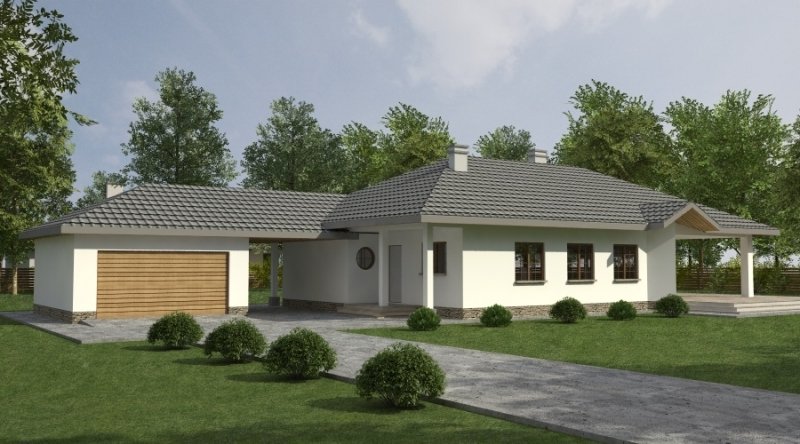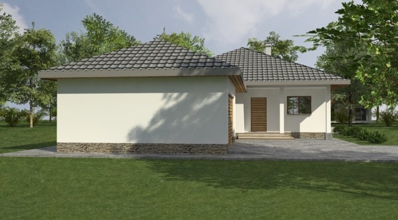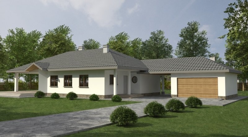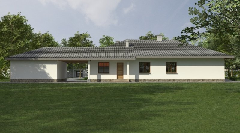 Dom parterowy został opracowany na nietypową działkę na zlecenie indywidualne. Cechą wyróżniającą ten dom spośród innych jest ścięty narożnik części domu od strony salonu, który powoduje że dom pasuje do nietypowej lokalizacji. Garaż 2 stanowiskowy można wykonać w 2 etapie inwestycji lub zrezygnować z niego. Wnętrze domu zostało podzielone na strefę dzienną i nocną. W strefie dziennej znajduje się duży salon o powierzchni ponad 43m2. W strefie nocnej znajdują się 3 sypialnie w tym jedna 2-osobowa z własną łazienką. . Dostępna jest wersja projektu z częściowym podpiwniczeniem. Projekt Dj 1. Projekty podobne ( ze ściętym salonem ): DJ 6, DJ 7, DJ 8, DJ 176.