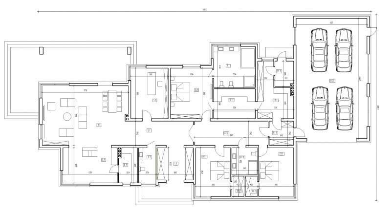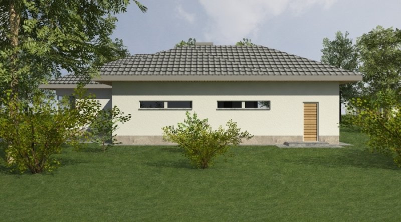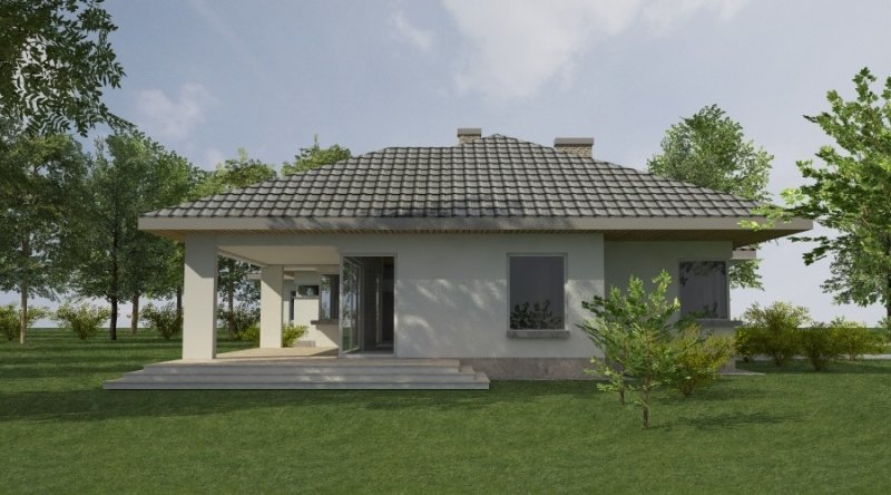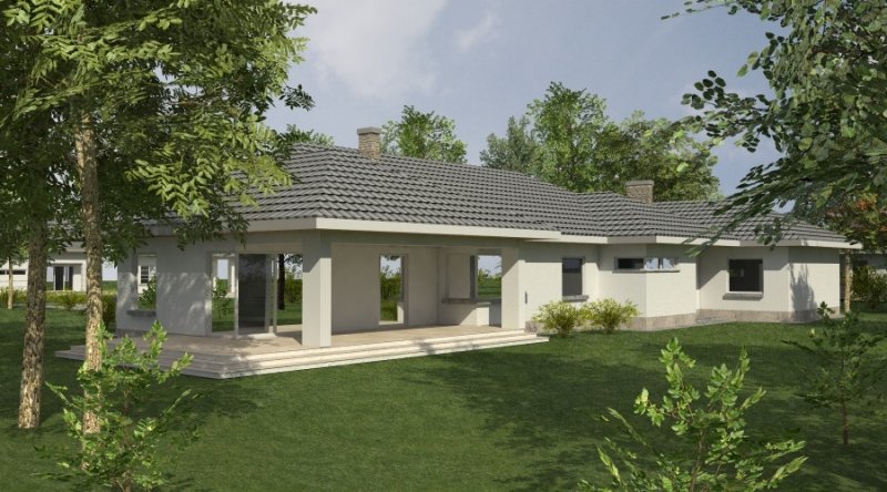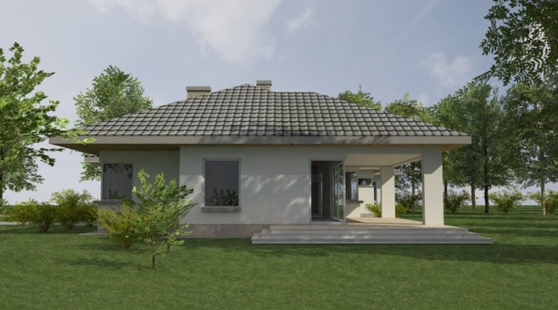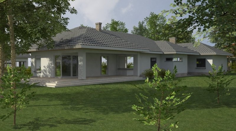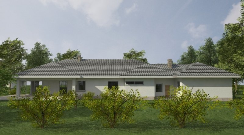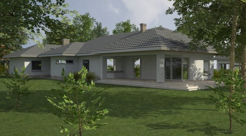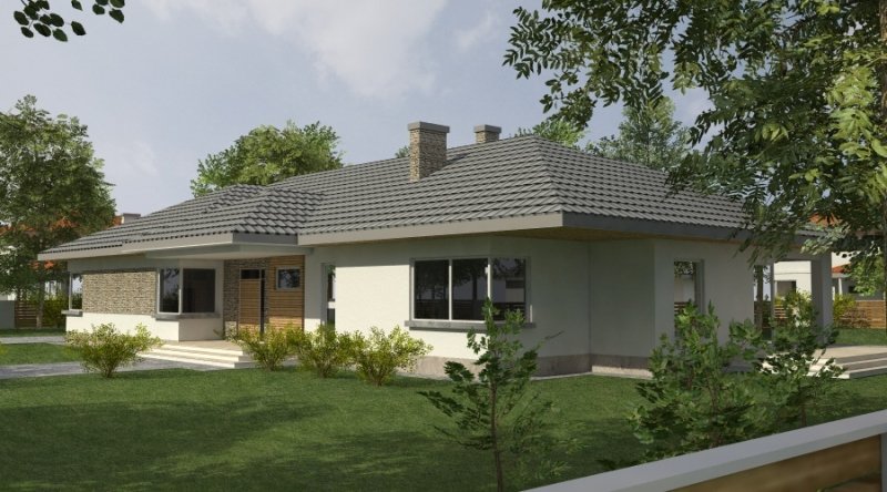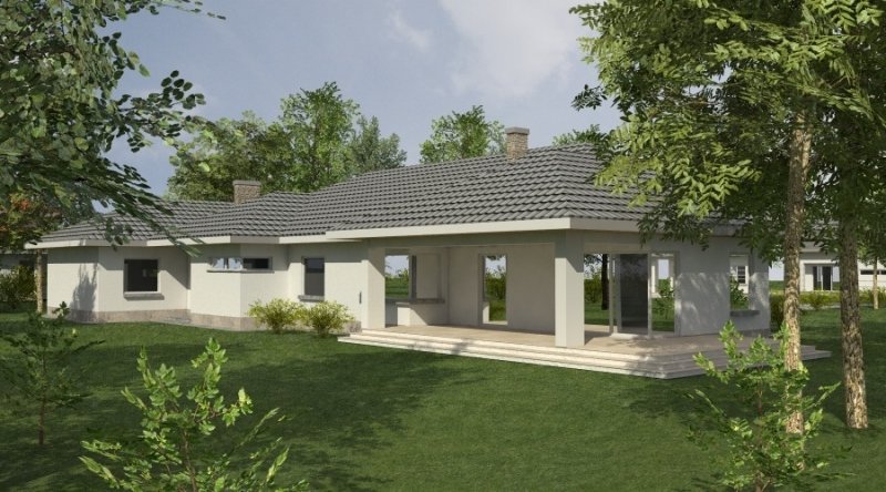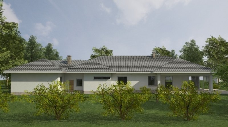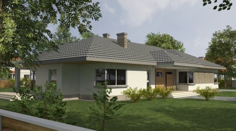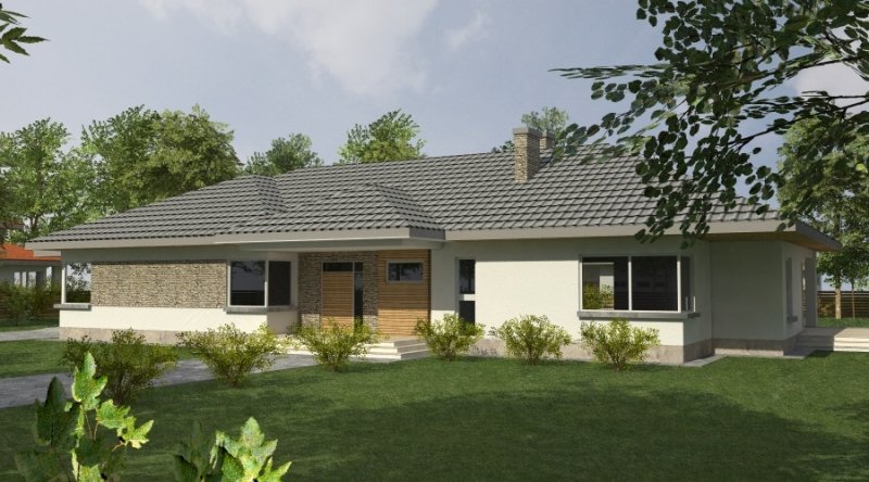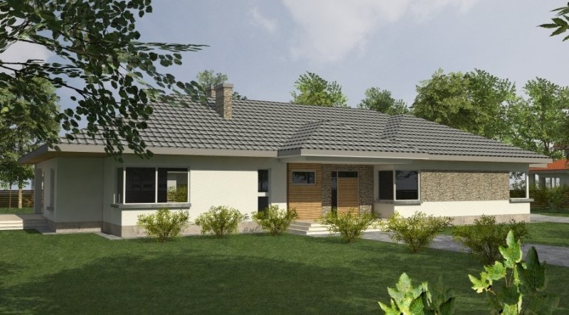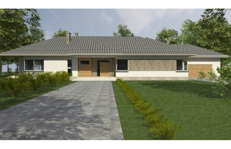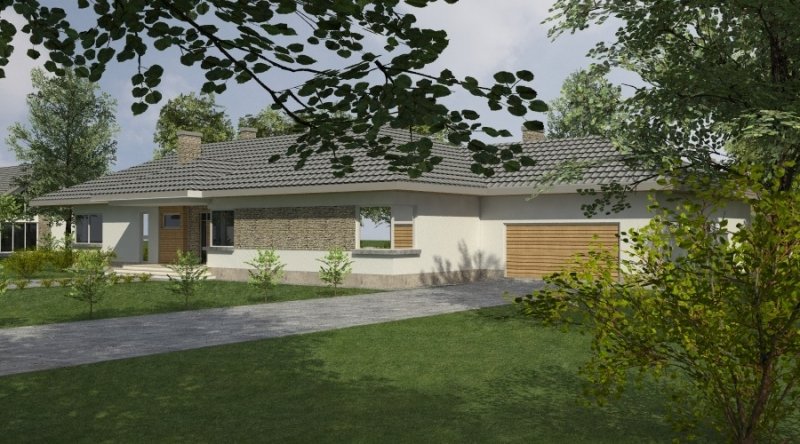 Obszerny dom parterowy o dużych powierzchniach pomieszczeń. Design projektu jest tradycyjny z elementami współczesnymi: duże narożne okna i drzwi balkonowe, wykończenia elementów elewacji z płyt z piaskowca. wewnątrz zaprojektowano duży salon z kominkiem polączony z obszerną otwartą kuchnią z nowoczesną wyspą.