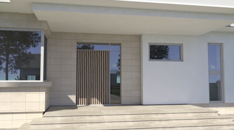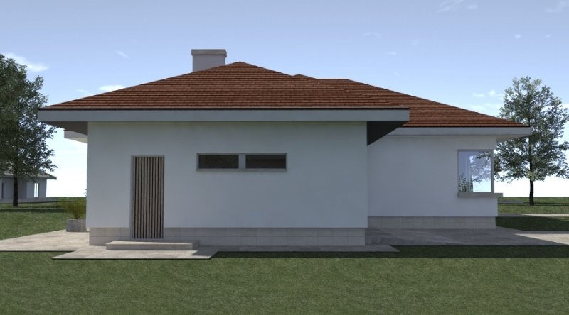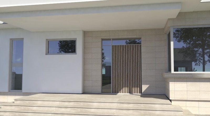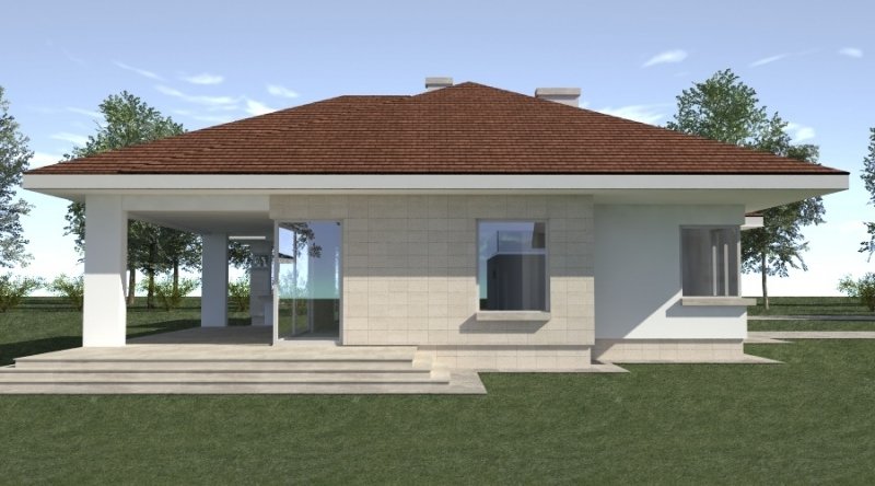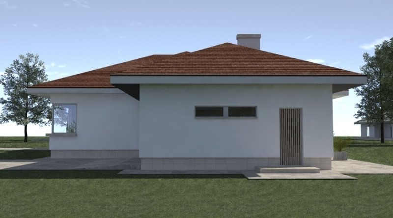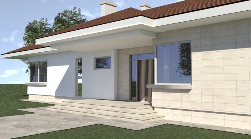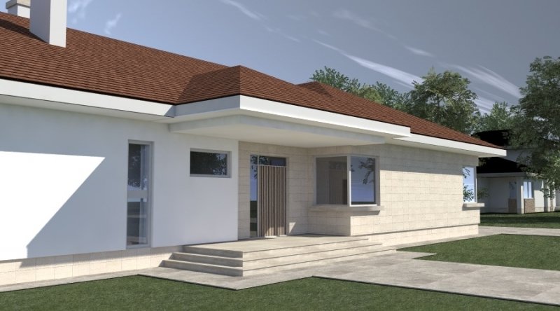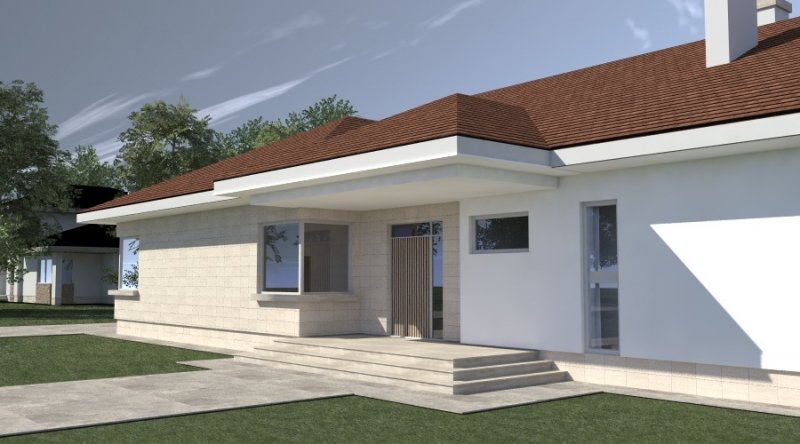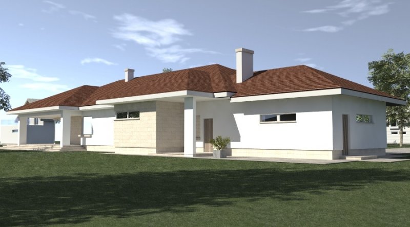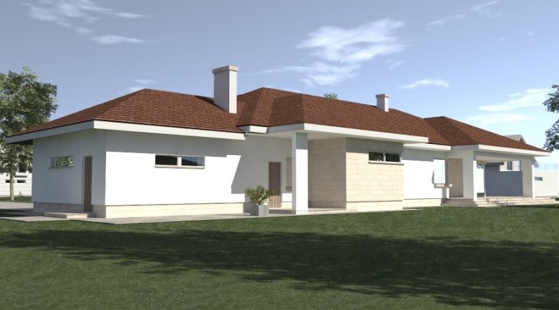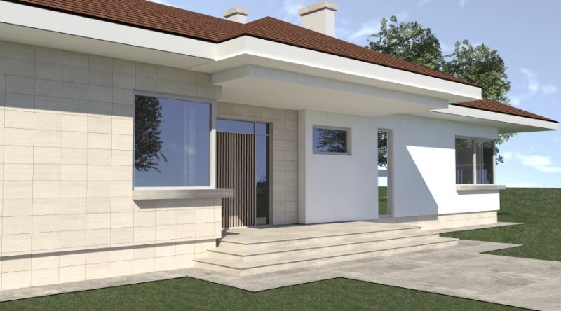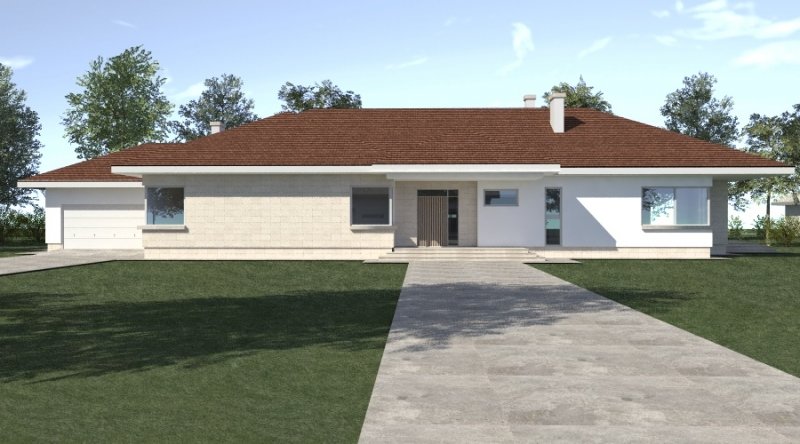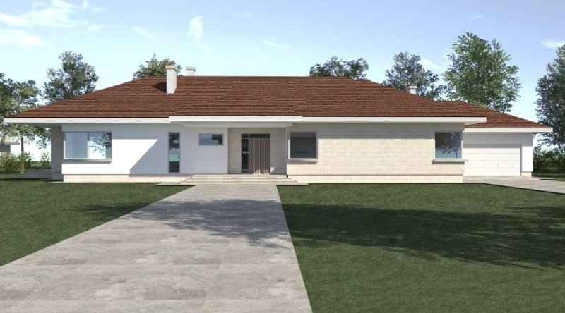 Obszerny dom parterowy o dużych powierzchniach pomieszczeń. Design projektu jest tradycyjny z elementami współczesnymi: duże narożne okna i drzwi balkonowe, wykończenia elementów elewacji z płyt z piaskowca. Wewnątrz zaprojektowano duży salon z kominkiem polączony z obszerną otwartą kuchnią z nowoczesną wyspą.