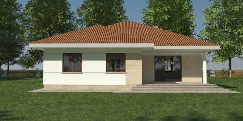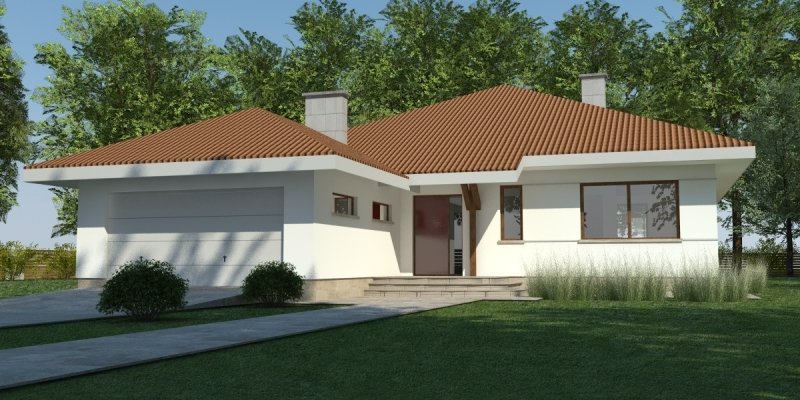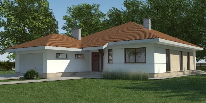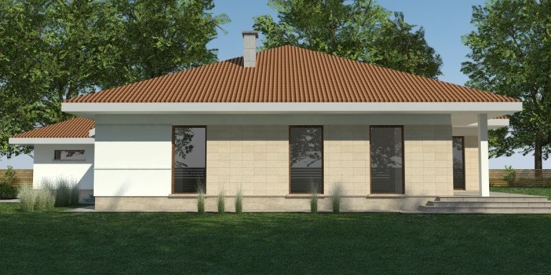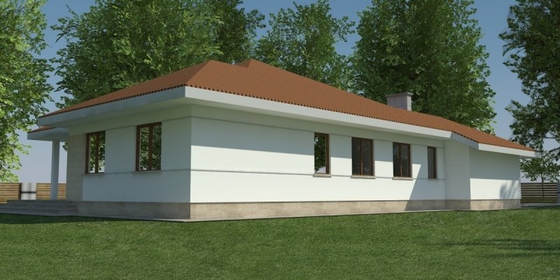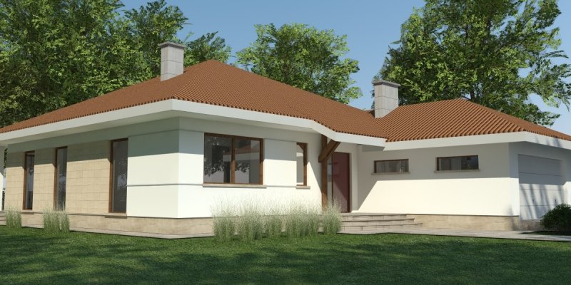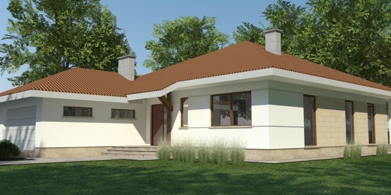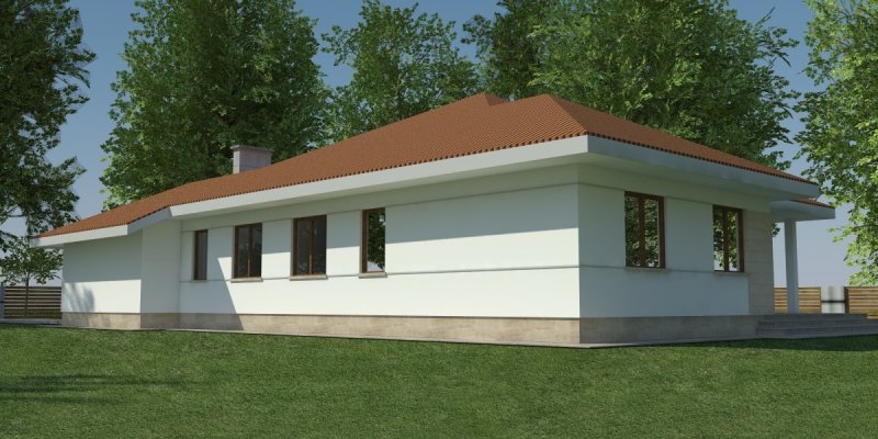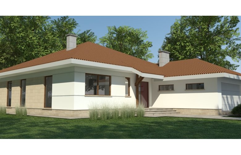 dom parterowy z prostym układem ponieszczeń.strefa dzienna to salon wraz z częściowo otwartą kuchnią i jadalnią z pomieszczeniami pomocniczymi, w strefie nocnej ( którą można całkowicie oddzielić od strefy dziennej) zaprojektowano 4 sypialnie z łazienką.