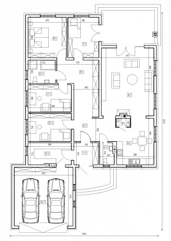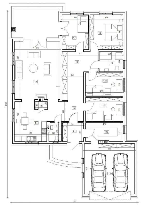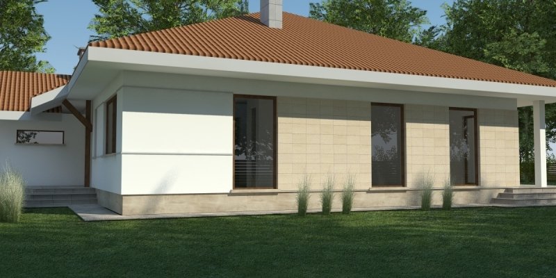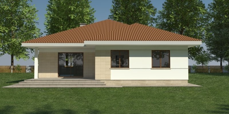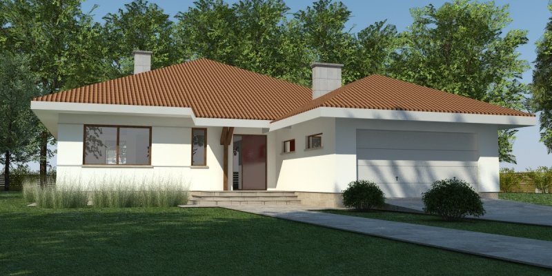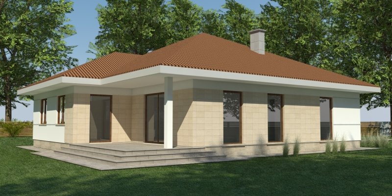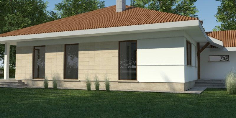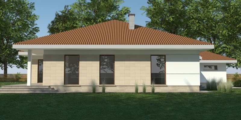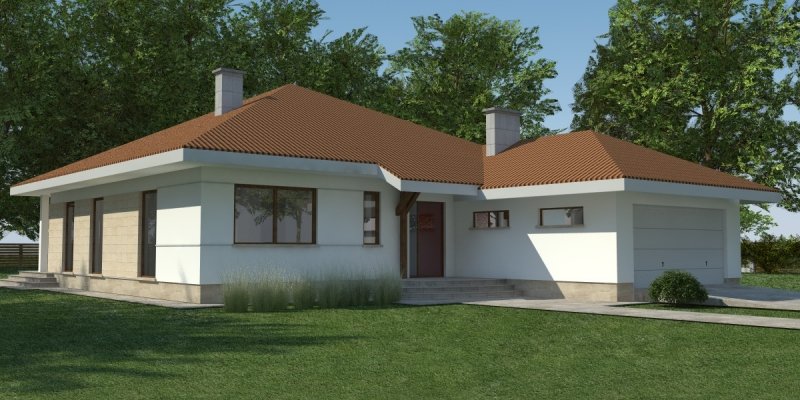 dom parterowy z prostym układem ponieszczeń.strefa dzienna to salon wraz z częściowo otwartą kuchnią i jadalnią z pomieszczeniami pomocniczymi, w strefie nocnej ( którą można całkowicie oddzielić od strefy dziennej) zaprojektowano 4 sypialnie z łazienką.