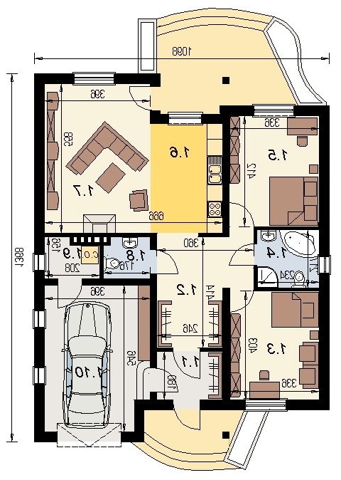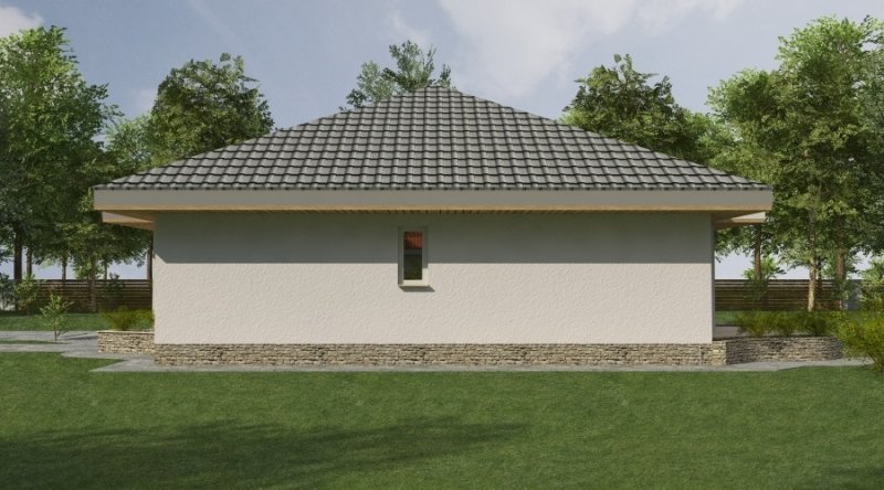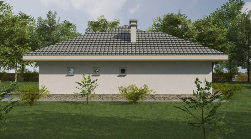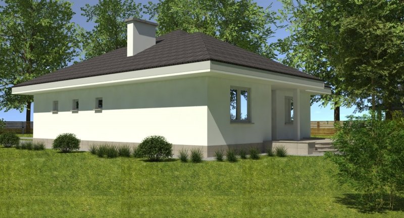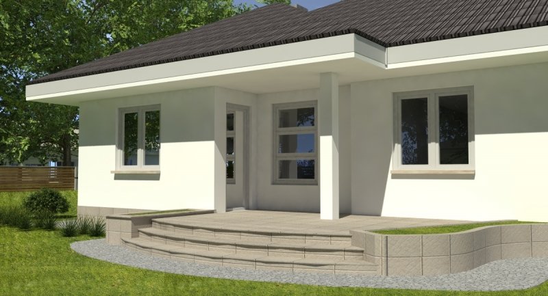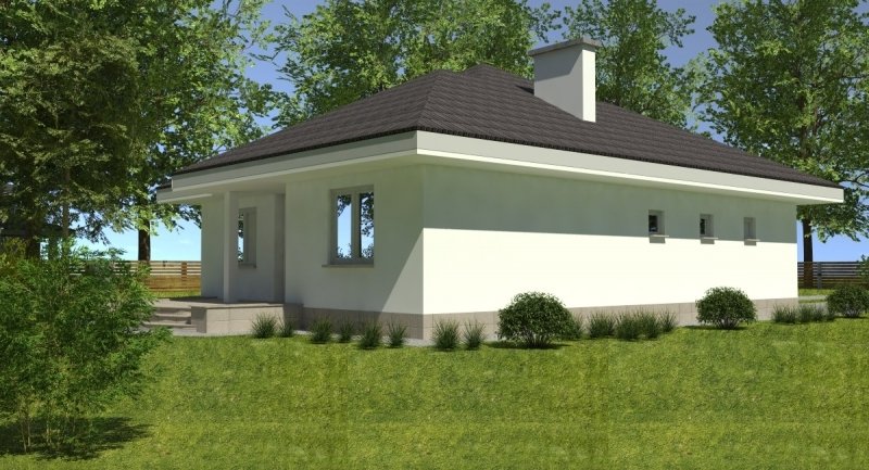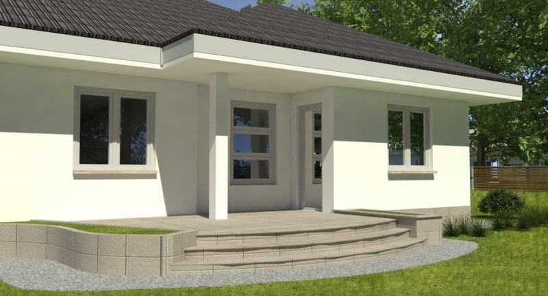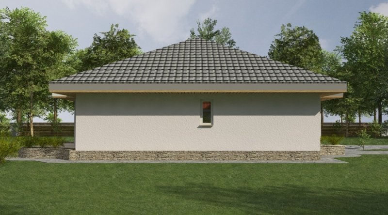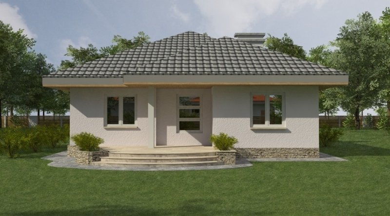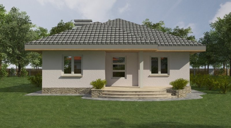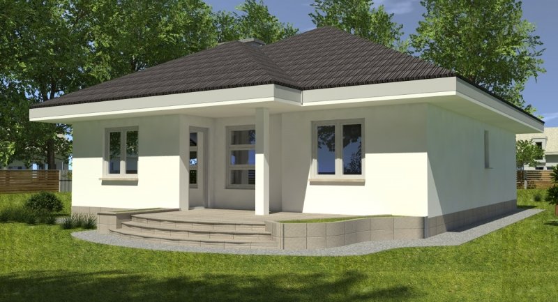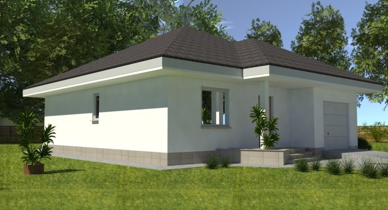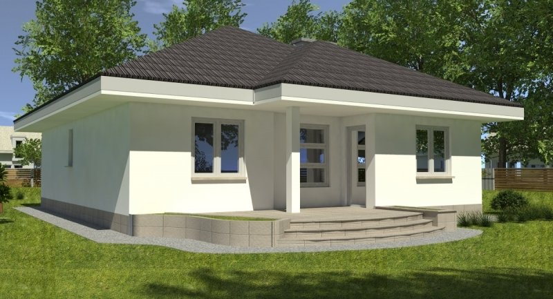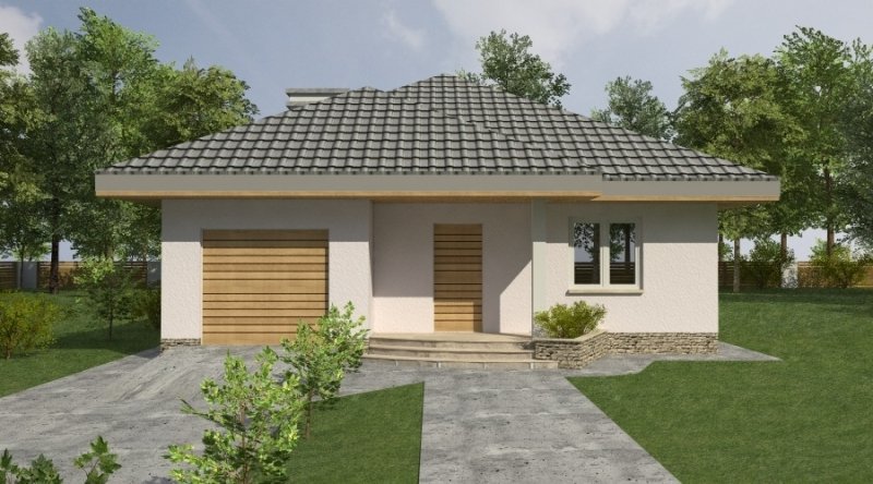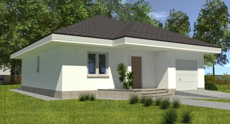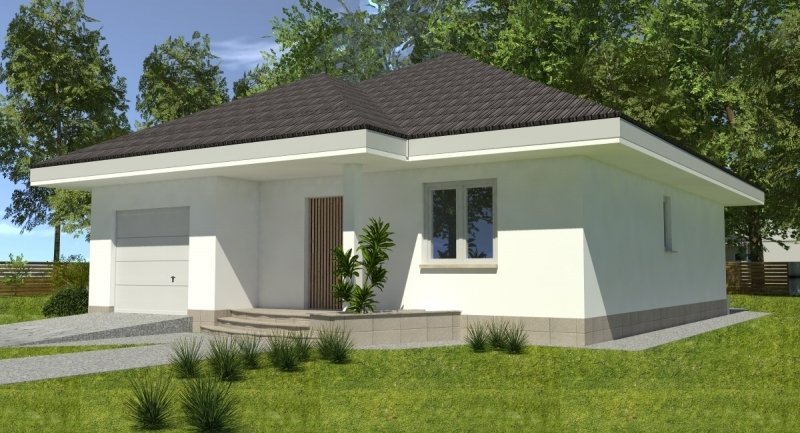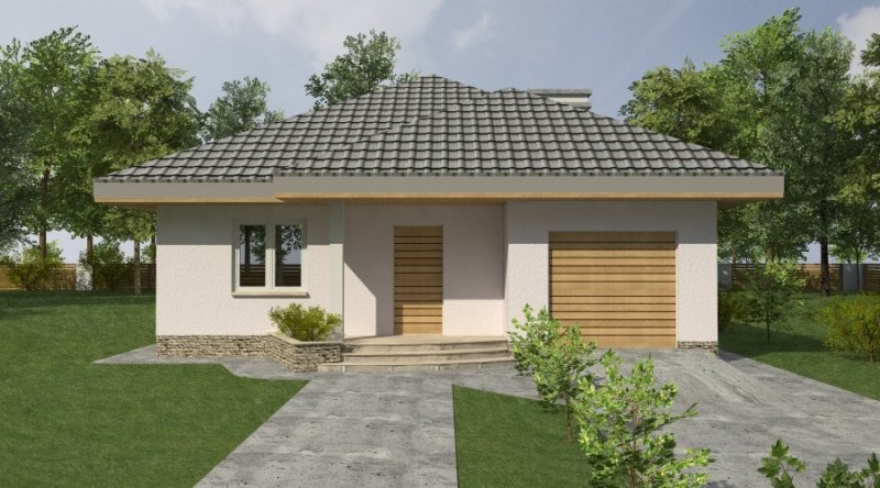 bardzo prosty dom parterowy z wbudowanym garażem na 1 samochód osobowy. na część dzienną składa się pokój dzienny z kuchnią wraz z pomieszczeniami pomocniczymi, część nocna to 2 sypialnie wraz z łazienką. część nocną można całkowicie oddzielić od części dziennej.