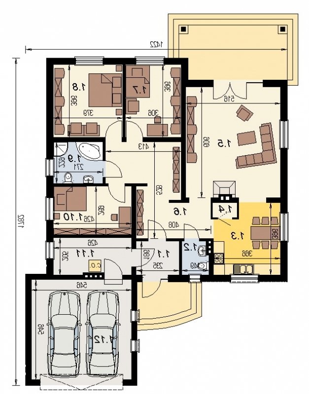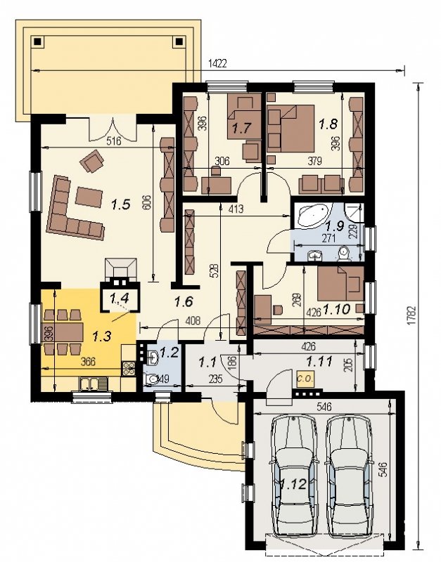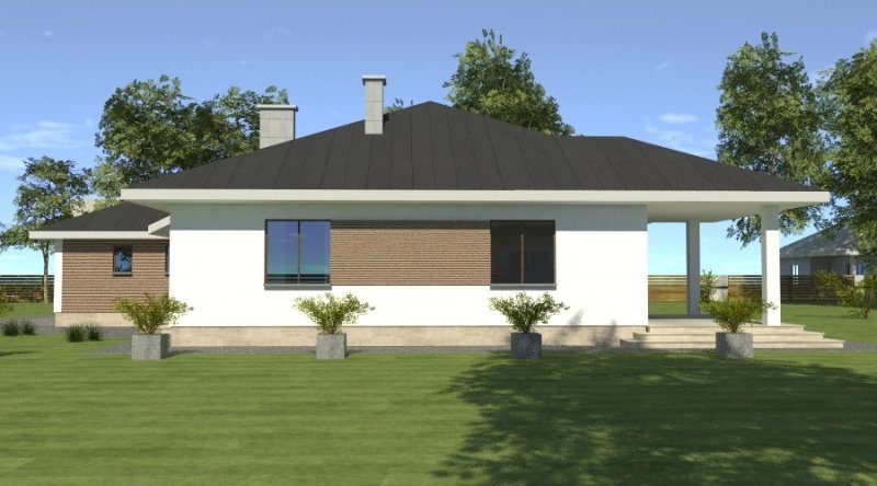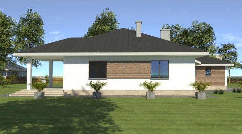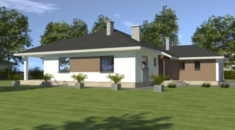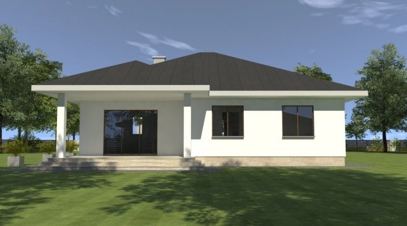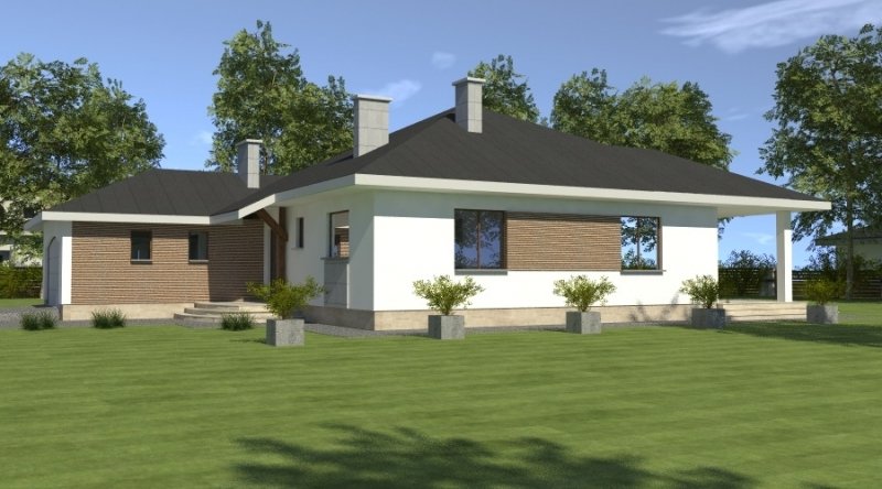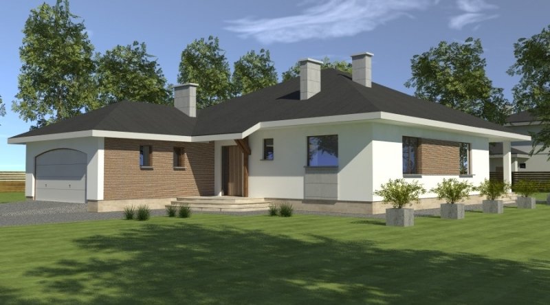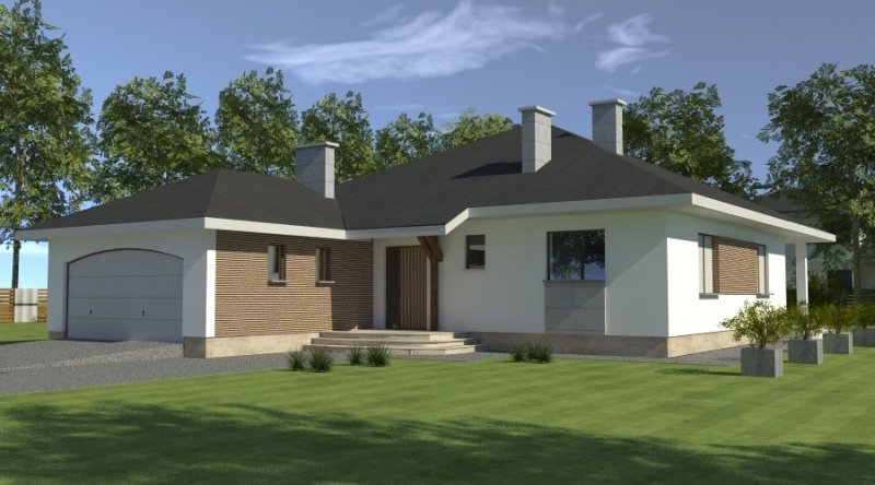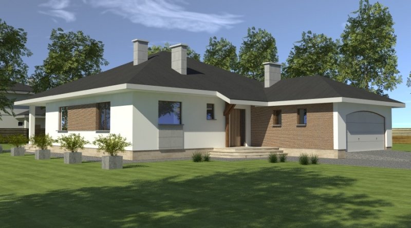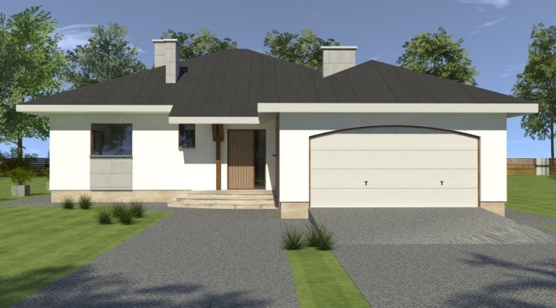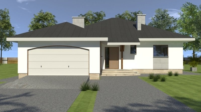 Bardzo popularny parterowy dom jednorodzinny. Wnętrze domu podzielone zostało na strefę dzienną i nocną. Dom posiada garaż na dwa samochody. Możliwe jest opracowane wersji bez garażu lub z garażem jednostanowiskowym. Dostępna jest wersja projektu ze schodami na poddasze z możliwością adaptacji poddasza (kąt nachylenia połaci wynosi 30 stopni - projekt DJ 174a).