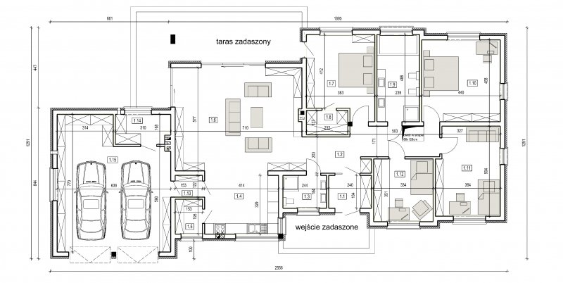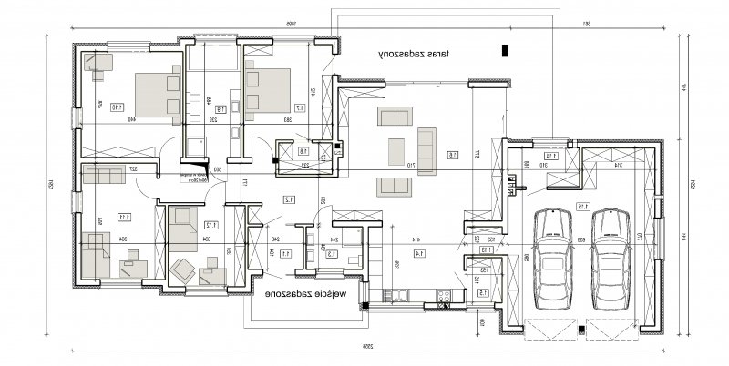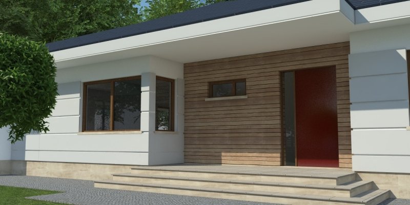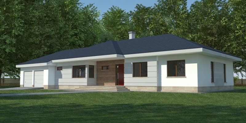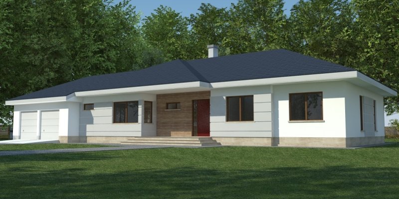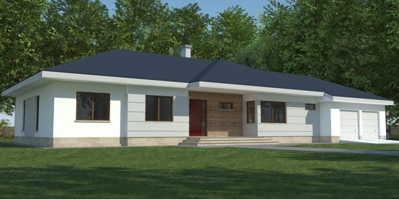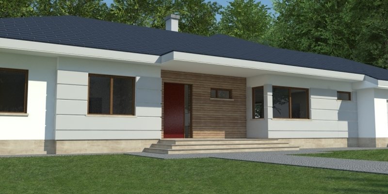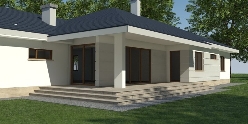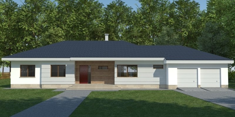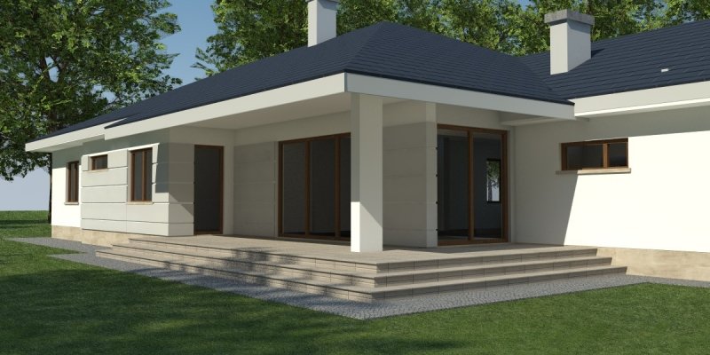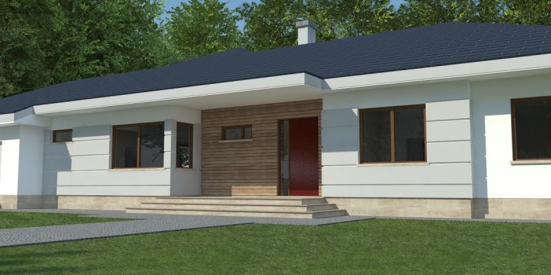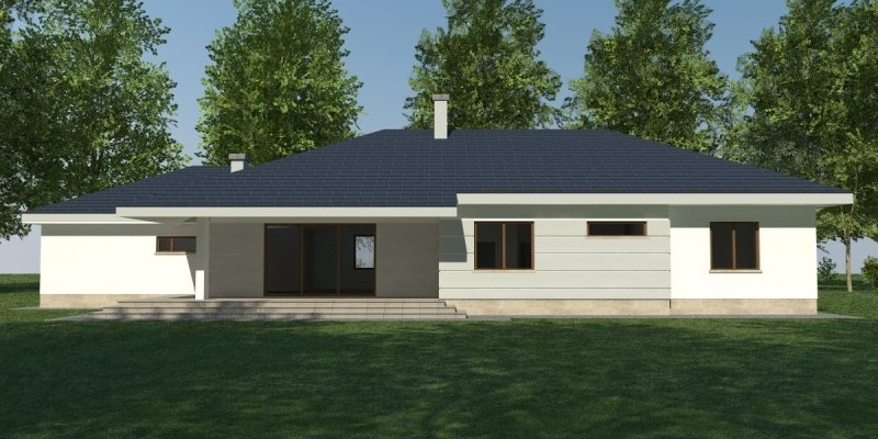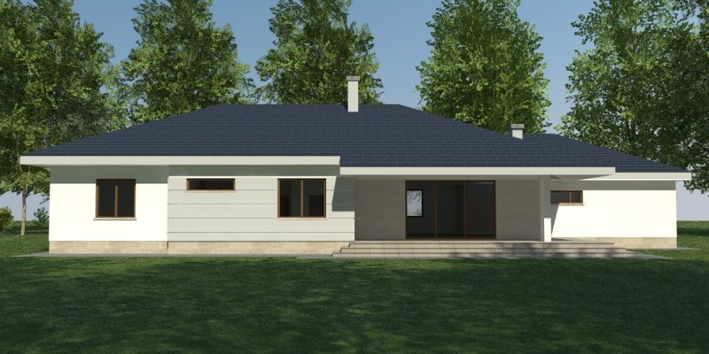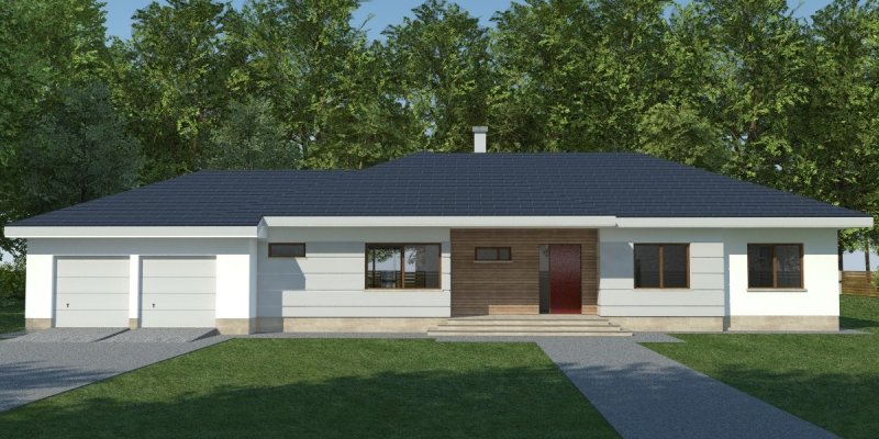 Dom parterowy w stylu współczesnym. Strefa dzienna obejmuje duży salon o powierzchni ponad 40m2 wraz z otwartą kuchnią z możliwością wykonania tzw."wyspy". Strefa nocna, którą można całkowicie odizolować od strefy dziennej, zawiera 4 sypialnie wraz z łazienką. Dom posiada wygodny garaż na 2 samochody osobowe o szerokości 6.3m.