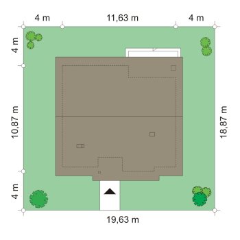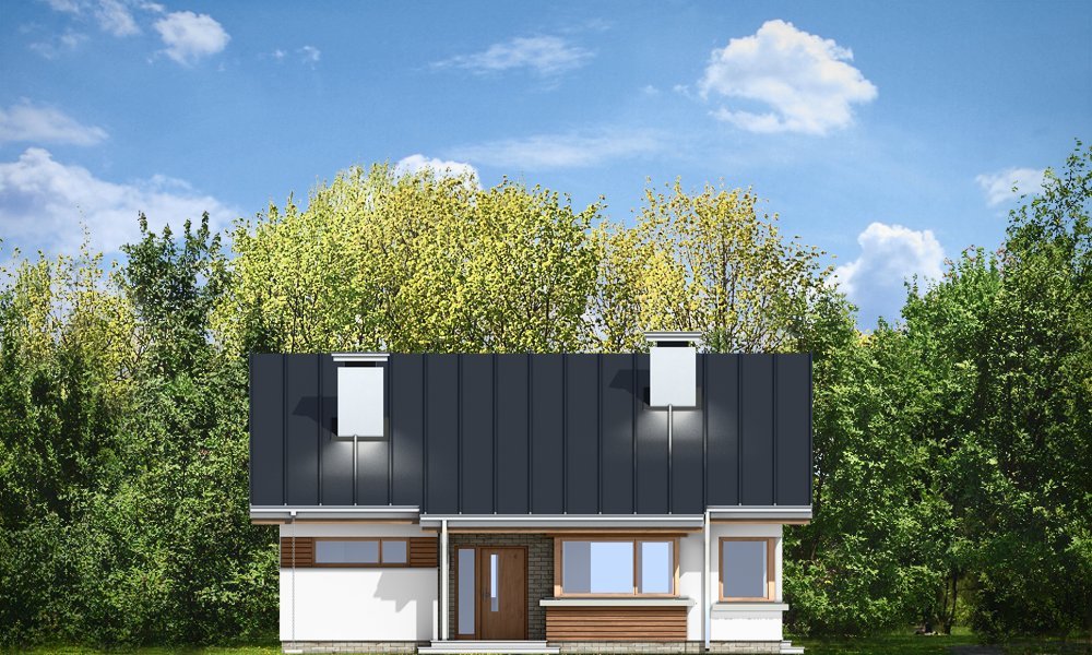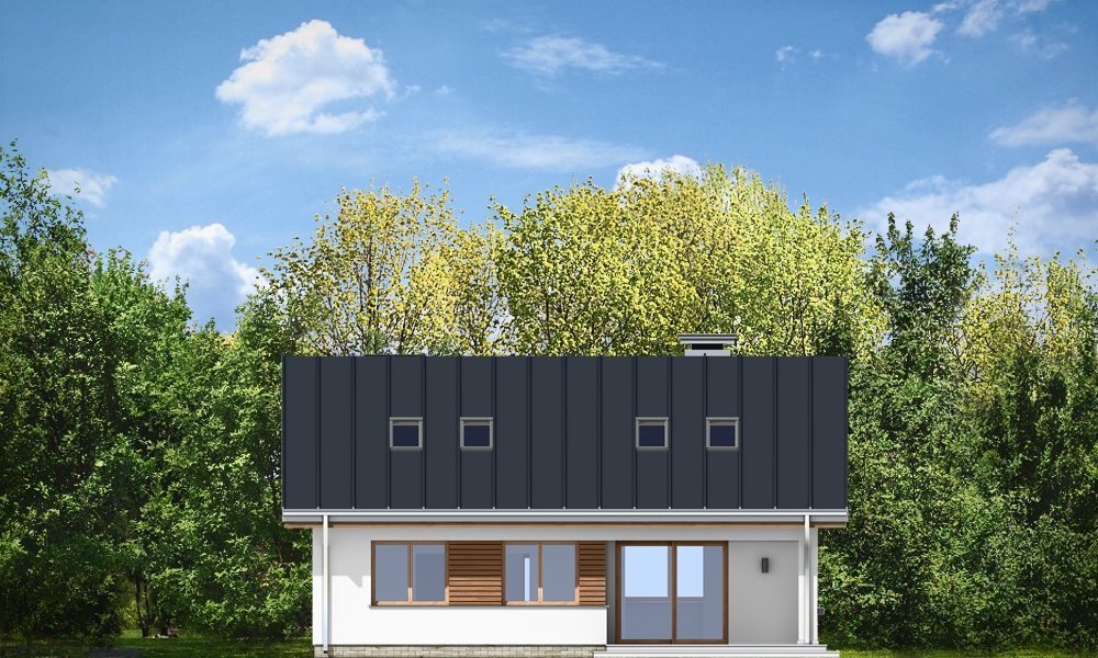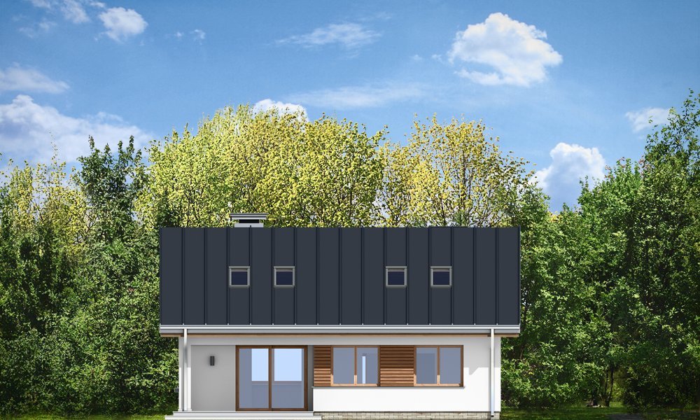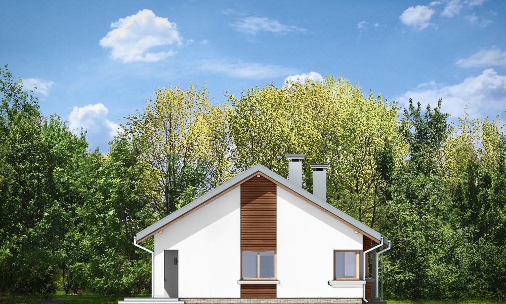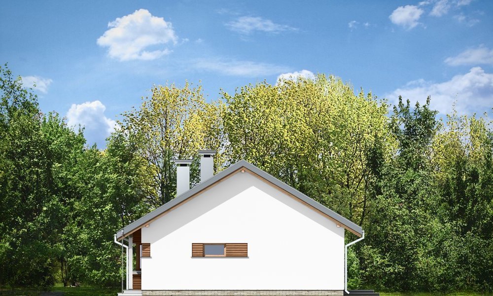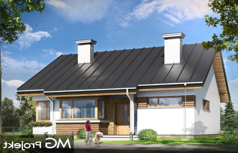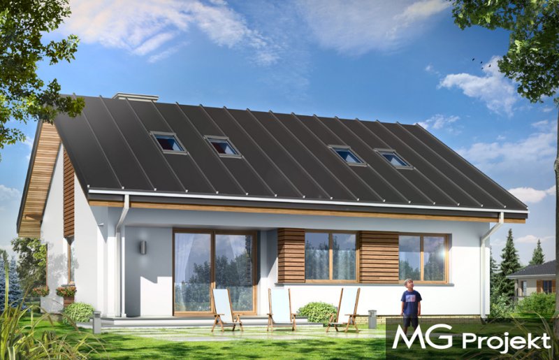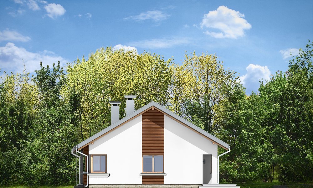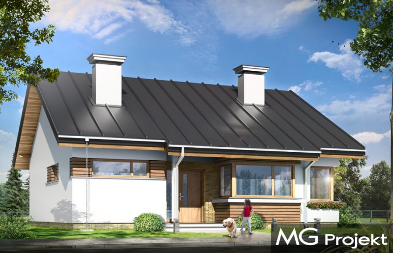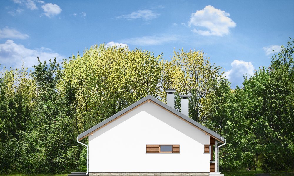 Dom Dla Trojga to nowoczesny, niewielki domek dla trzy-czteroosobowej rodziny. Budynek jest parterowy, przekryty dwuspadowym dachem. Na prostokątnym planie parteru zaprojektowano przestronny salon z aneksem jadalnym, połączony z częściowo otwartą kuchnią i holem. Obok mieszczą się dwie sypialnie, łazienka i toaleta, oraz obszerny przedsionek i kotłownia. Z przedsionka schodami dostać się można na strych. W projekcie strych jest nieużytkowy, lecz w łatwy sposób można go zaadaptować na poddasze z dodatkowymi pokojami. Ładne, duże wnętrza pomieszczeń, spora część gospodarcza - to odróżnia "Dom dla trojga" od innych niewielkich projektów domków. Na zewnątrz wejście domu zaakcentowano podestem w podcieniu, oraz wykuszowym oknem kuchni. Od strony ogrodu zaprojektowano szerokie szklane drzwi z salonu na taras i ogród. Taras jest częściowo zadaszony podcieniem. Dodatki o nowoczesnej stylistyce, jak fragmenty ścian obłożone drewnem, tworzące wraz z oknami podział elewacji na pasy, czy okna narożne - podkreślają nowoczesny a zarazem nie pretensjonalny charakter architektury. Pracownia posiada wersję odbicia lustrzanego projektu domu.