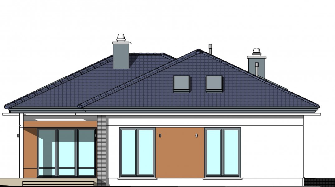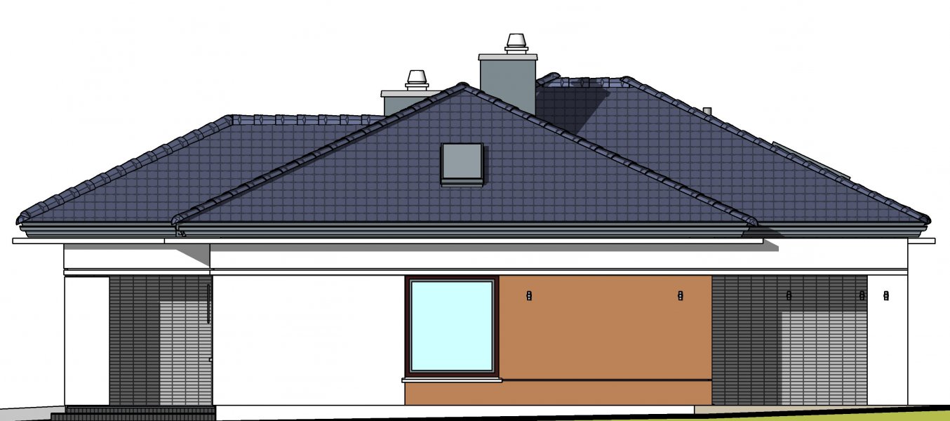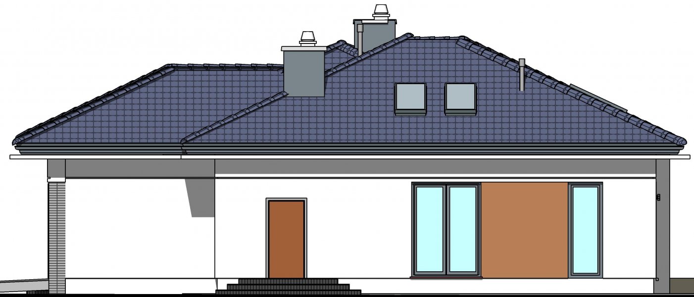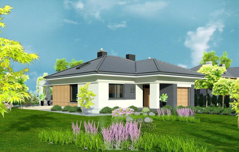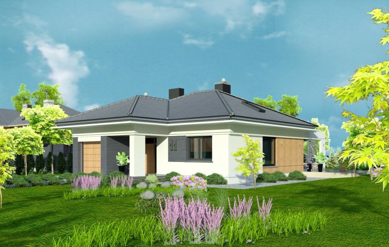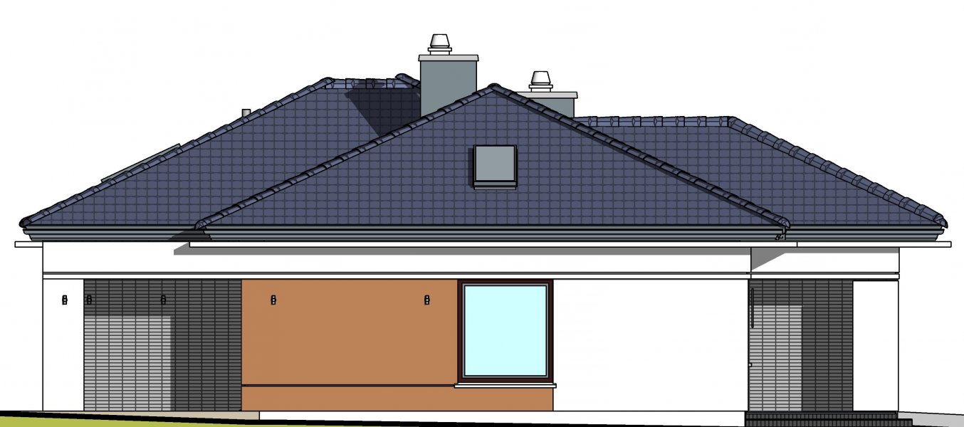 To wygodny i funkcjonalny dom parterowy. Mimo niewielkiego metrażu w domu zmieściło się wszystko, co potrzebne do komfortowego mieszkania. Wchodząc do domu przez przestronny doświetlony przedsionek z pojemną szafą od razu można docenić przestrzeń i wygodę. Dobrze przemyślane rozplanowanie pomieszczeń zapewnia elastyczność w dostosowaniu ich do swoich potrzeb. Wyraźne wydzielenie stref funkcjonalnych domu pozwala na komfortowe i niezależne korzystanie z nich, a także daje możliwość zamknięcia drzwiami części prywatnej. Także salon i kuchnia mogą zostać całkowicie wydzielone z osobnymi wejściami do obu pomieszczeń. Foremny 30-to metrowy salon wraz z dużą ścianą telewizyjną zapewnia łatwe i funkcjonalne umeblowanie. W części prywatnej znalazły się 3 duże sypialnie, w tym jedna z garderobą i własną łazienką oraz ogólnodostępna łazienka a także pralnia - schowek. Duża kotłownia pozwala na zastosowanie dowolnego sposobu opału. Dom prosty i tani w budowie. Elegancki, wysmakowany, o dobrze dobranych proporcjach bryły i wyważonym detalu. Ciekawe nowoczesne elewacje zapewniają atrakcyjny wygląd. Niewątpliwą zaletą domu jest możliwość powiększenia jego powierzchni o 30 m2 poprzez adaptację poddasza. Przewidziano miejsce na ewentualne schody w hallu wejściowym.