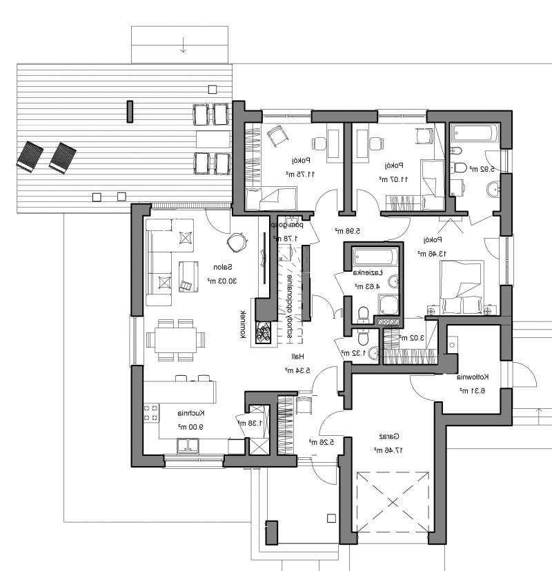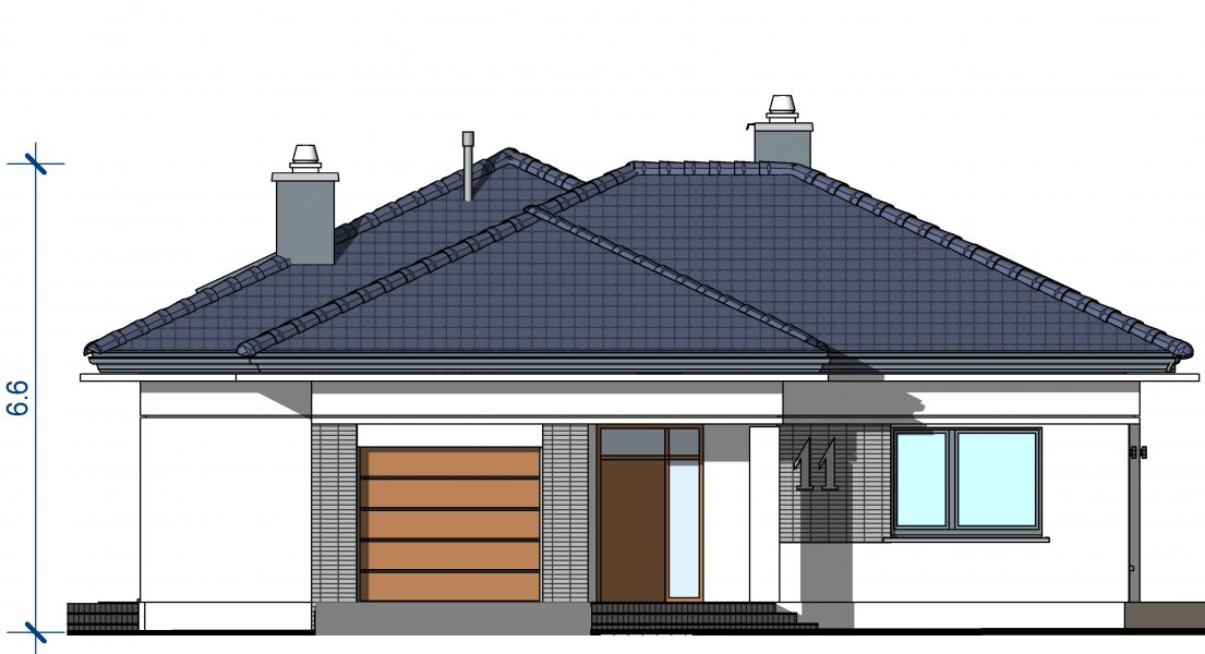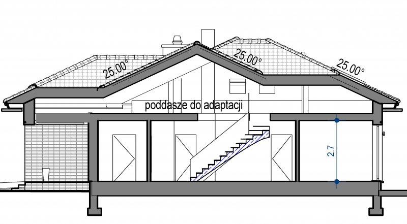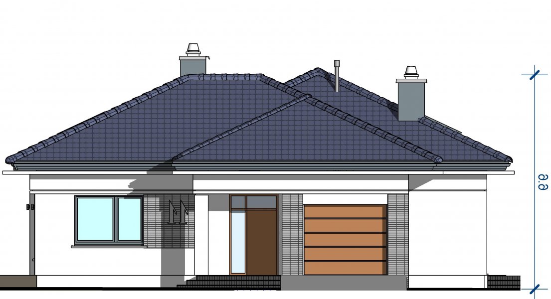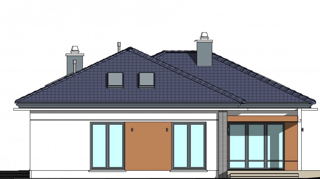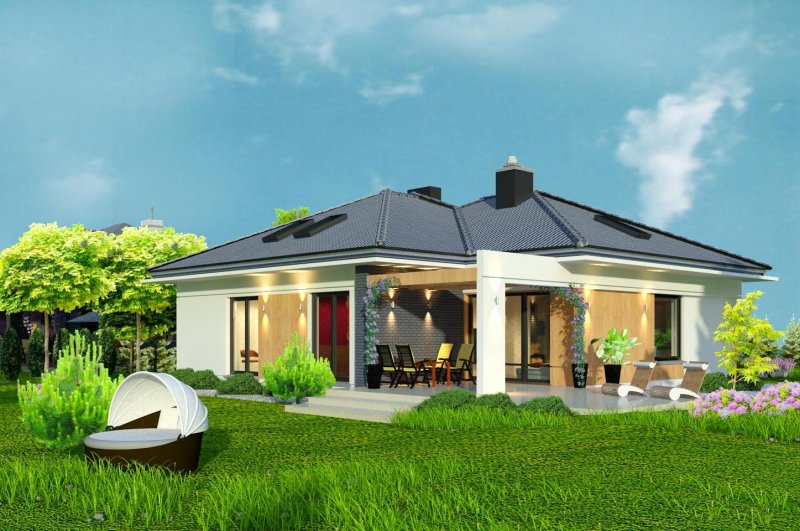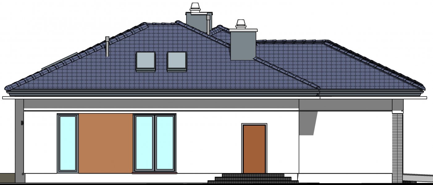To wygodny i funkcjonalny dom parterowy. Mimo niewielkiego metrażu w domu zmieściło się wszystko, co potrzebne do komfortowego mieszkania. Wchodząc do domu przez przestronny doświetlony przedsionek z pojemną szafą od razu można docenić przestrzeń i wygodę. Dobrze przemyślane rozplanowanie pomieszczeń zapewnia elastyczność w dostosowaniu ich do swoich potrzeb. Wyraźne wydzielenie stref funkcjonalnych domu pozwala na komfortowe i niezależne korzystanie z nich, a także daje możliwość zamknięcia drzwiami części prywatnej. Także salon i kuchnia mogą zostać całkowicie wydzielone z osobnymi wejściami do obu pomieszczeń. Foremny 30-to metrowy salon wraz z dużą ścianą telewizyjną zapewnia łatwe i funkcjonalne umeblowanie. W części prywatnej znalazły się 3 duże sypialnie, w tym jedna z garderobą i własną łazienką oraz ogólnodostępna łazienka a także pralnia - schowek. Duża kotłownia pozwala na zastosowanie dowolnego sposobu opału. Dom prosty i tani w budowie. Elegancki, wysmakowany, o dobrze dobranych proporcjach bryły i wyważonym detalu. Ciekawe nowoczesne elewacje zapewniają atrakcyjny wygląd. Niewątpliwą zaletą domu jest możliwość powiększenia jego powierzchni o 30 m2 poprzez adaptację poddasza. Przewidziano miejsce na ewentualne schody w hallu wejściowym.