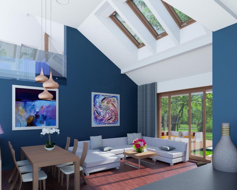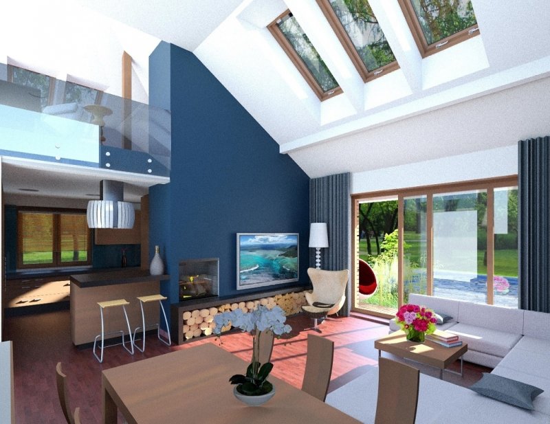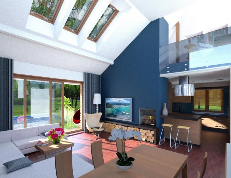 Wysoki salon z pięknym dużym przeszkleniem otwartym na ogród jest niewątpliwą atrakcją tego domu. Może on zostać wzbogacony o antresolę otwartą na salon. Miejsce na schody przewidziano w hallu.