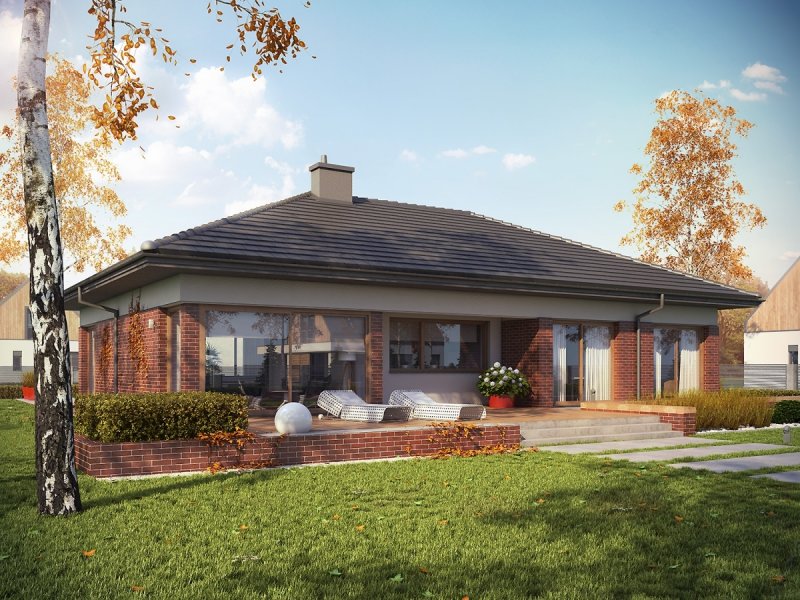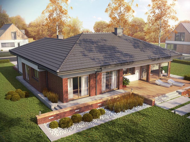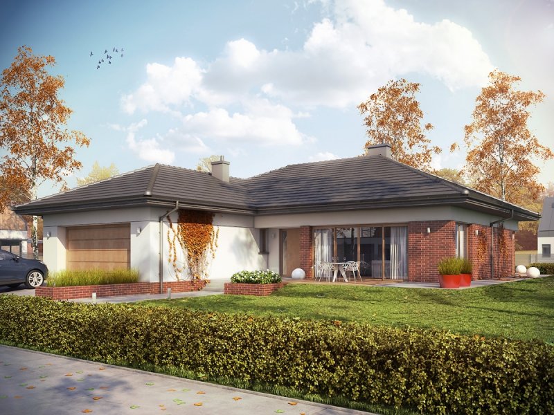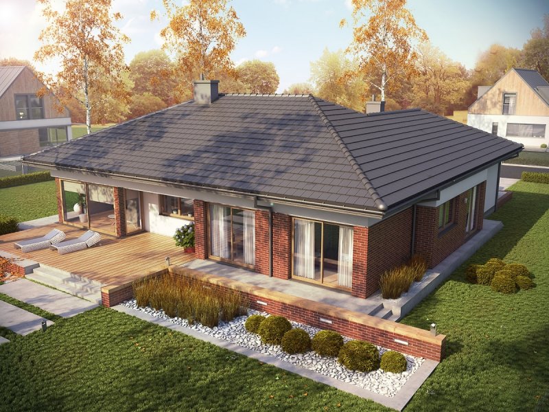 Dominik G2 (wersja B) MUTI-COMFORT to funkcjonalny dom wypełniony słońcem i dobrą, jasną energią. Wewnątrz zamknięto funkcjonalny rozkład pomieszczeń z imponującą, otwartą strefą dzienną. Na elewacji króluje energetyczna czerwień klinkieru, przełamana białym tynkiem i ciepłymi drewnianymi detalami.