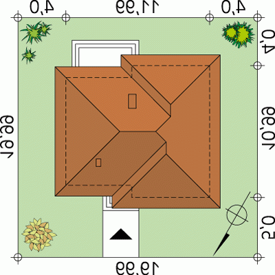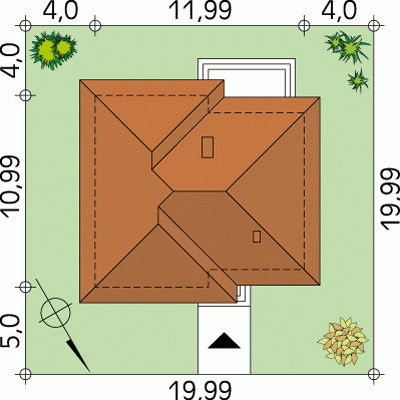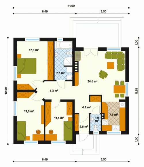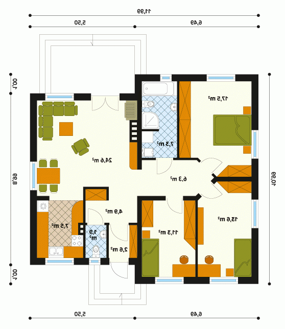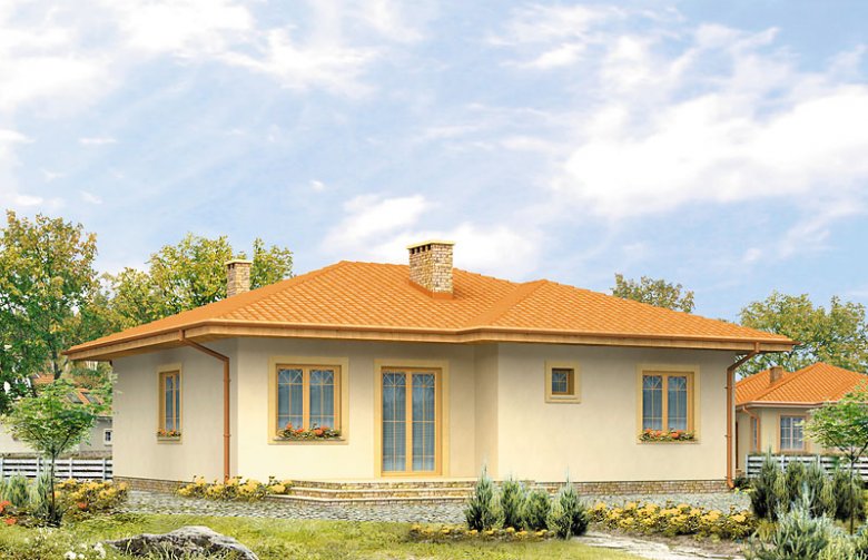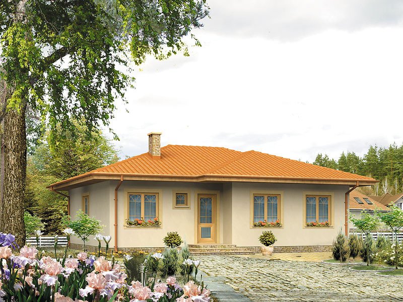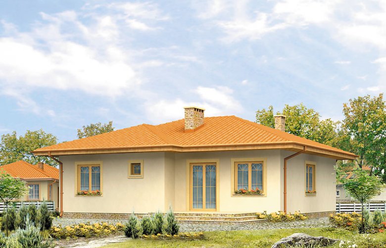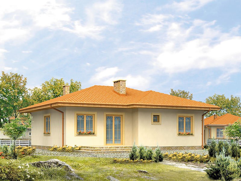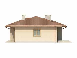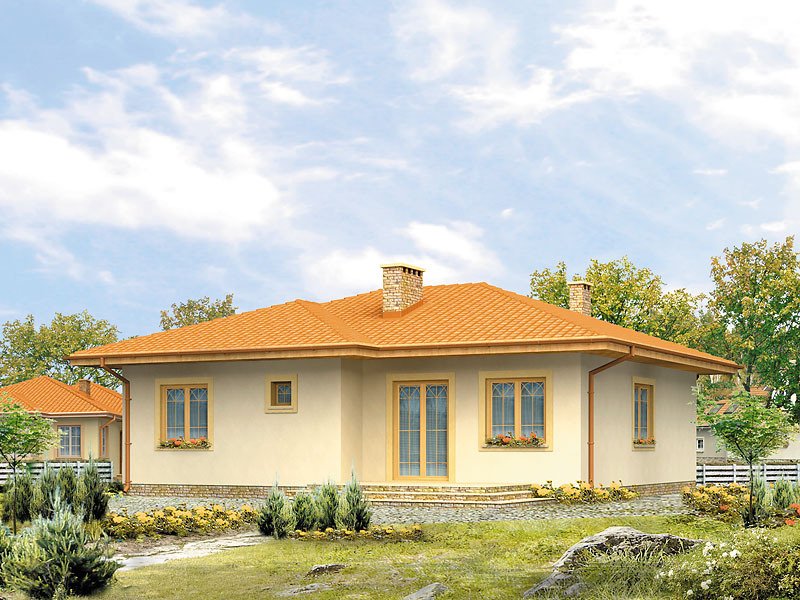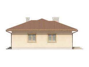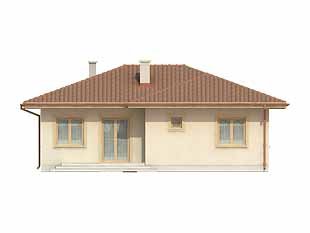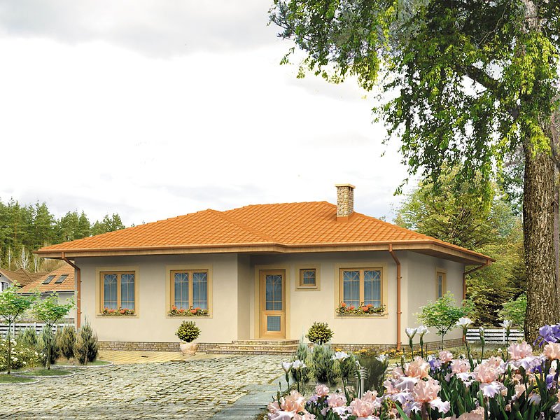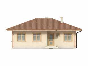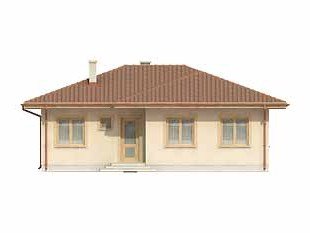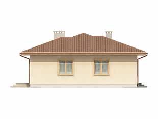 Mały dom parterowy, dla 3 – 4-osobowej rodziny. Cztery pokoje, kuchnia, łazienka i wc. Prosta architektura budynku.