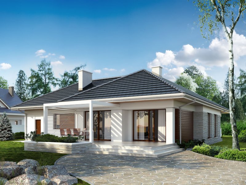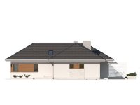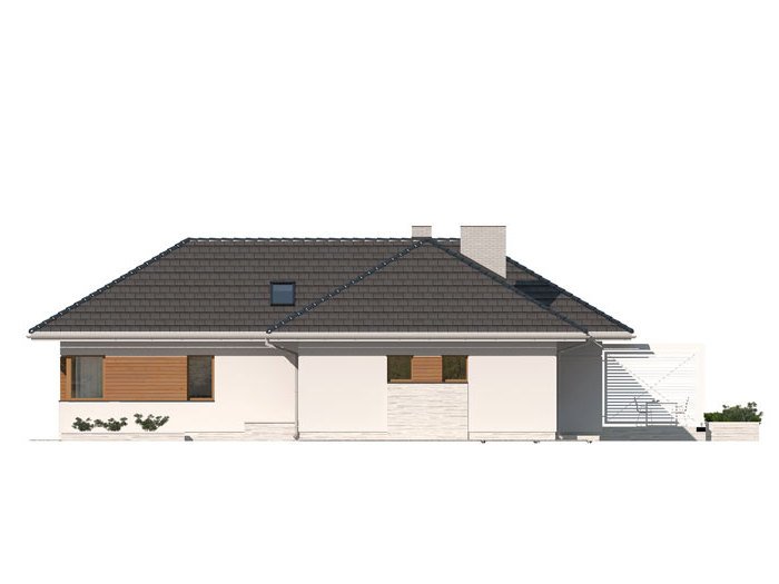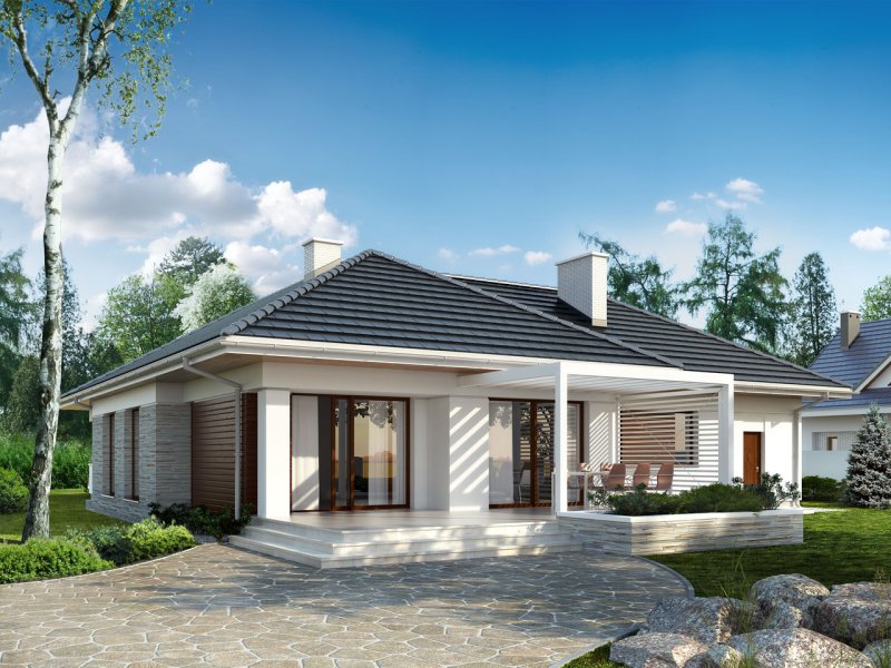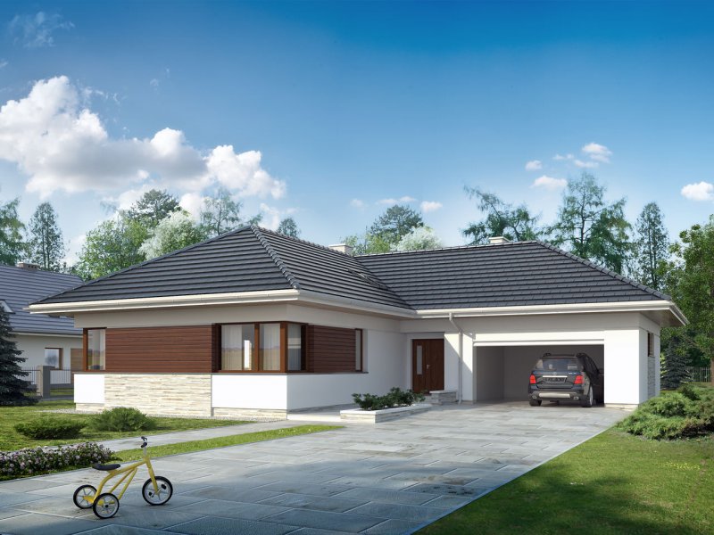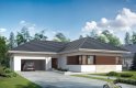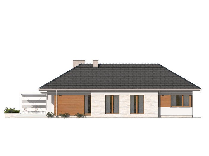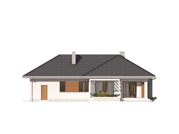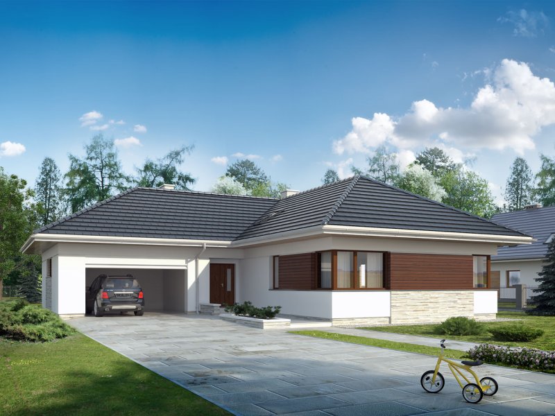 Dom jednorodzinny, parterowy, niepodpiwniczony, z dwustanowiskowym garażem. Wygodny, z przestronną i otwartą częścią dzienną oraz wydzieloną częścią nocną z czterema sypialniami i łazienką. Zastosowano schody na strych nieużytkowy który można zaadaptować na pokoje lub pozostawić otwartą przestrzeń przeznaczoną na suszarnię, pokój hobby itp. Dom posiada duże przeszklenia w salonie i jadalni z wyjściami na zadaszony taras. Kominek w salonie jest zgrabnie schowany w ścianę przez co nie pomniejsza go. W domu przewidziano wiele miejsca na szafy i schowki. Duża kotłownia oraz pomieszczenie na skład opału pozwala na montaż kotła na dowolny rodzaj paliwa.