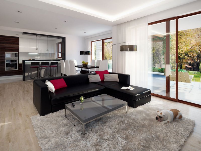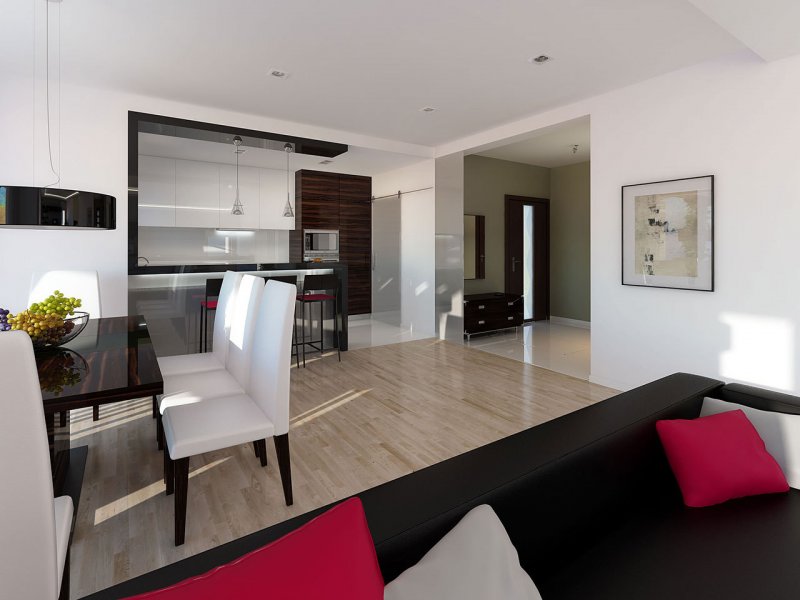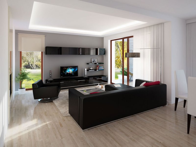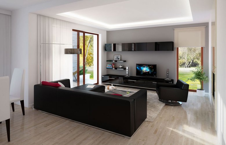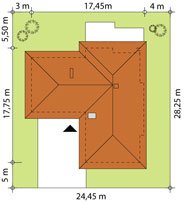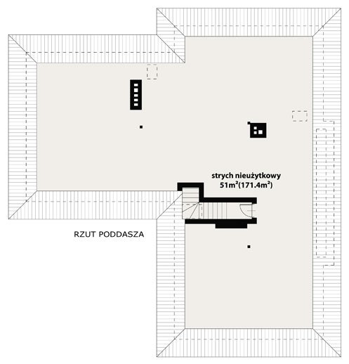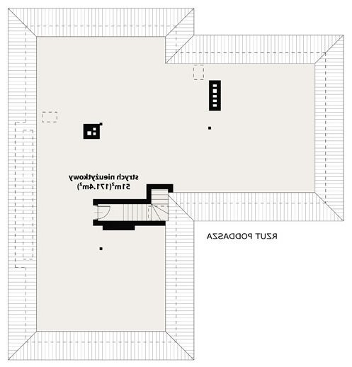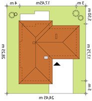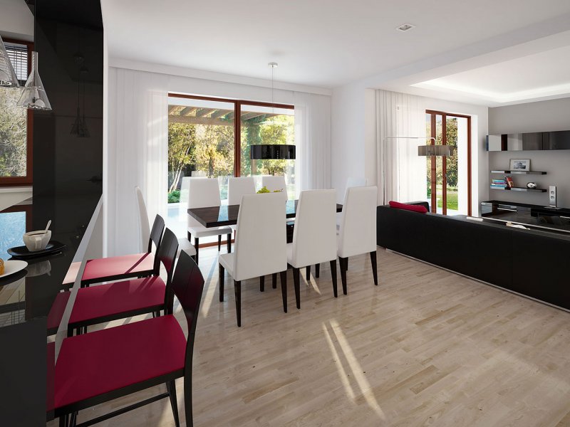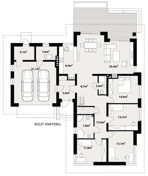Dom jednorodzinny, parterowy, niepodpiwniczony, z dwustanowiskowym garażem. Wygodny, z przestronną i otwartą częścią dzienną oraz wydzieloną częścią nocną z czterema sypialniami i łazienką. Zastosowano schody na strych nieużytkowy który można zaadaptować na pokoje lub pozostawić otwartą przestrzeń przeznaczoną na suszarnię, pokój hobby itp. Dom posiada duże przeszklenia w salonie i jadalni z wyjściami na zadaszony taras. Kominek w salonie jest zgrabnie schowany w ścianę przez co nie pomniejsza go. W domu przewidziano wiele miejsca na szafy i schowki. Duża kotłownia oraz pomieszczenie na skład opału pozwala na montaż kotła na dowolny rodzaj paliwa.